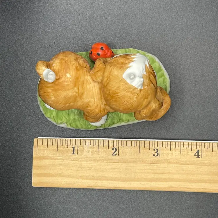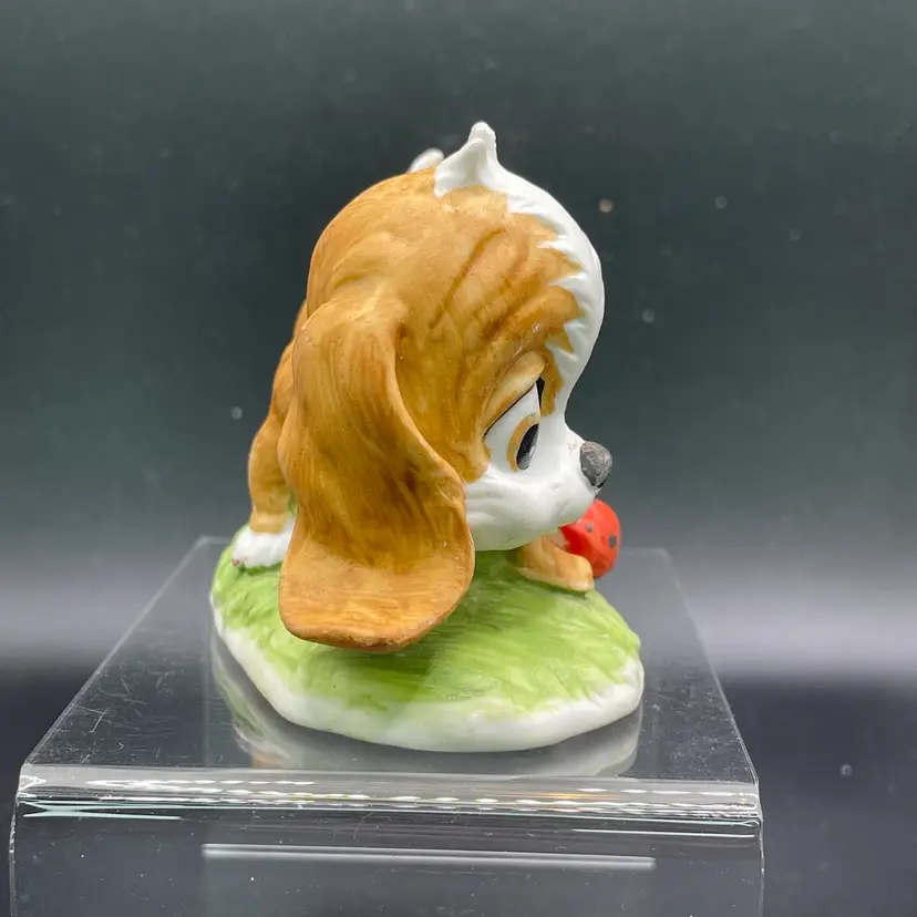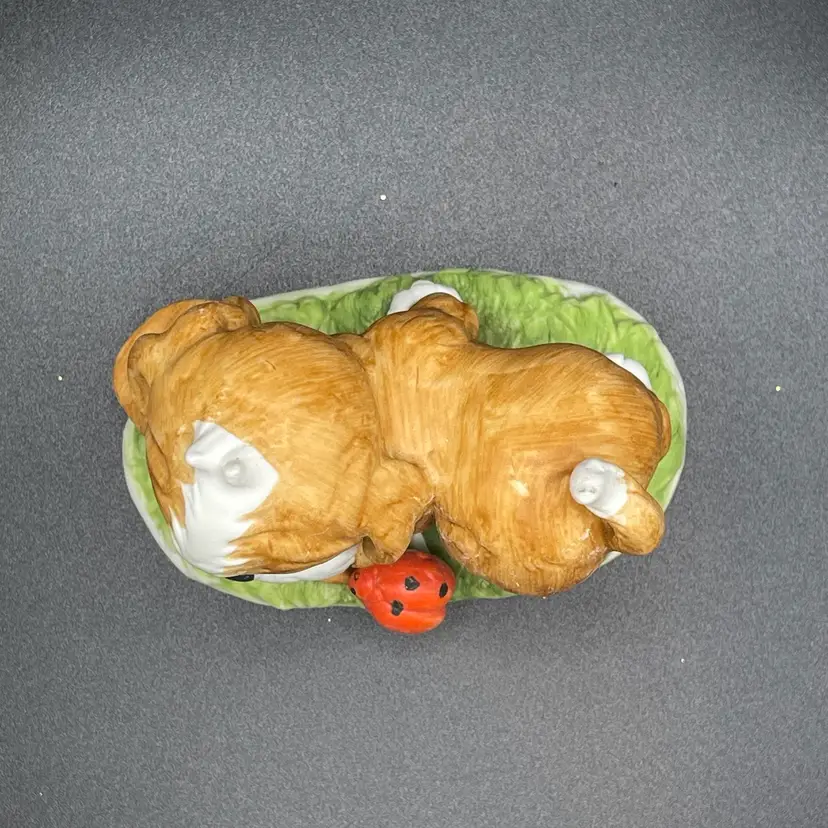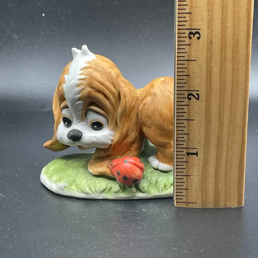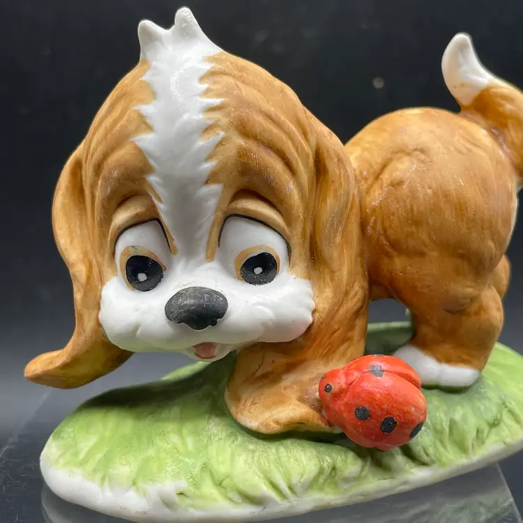 This is a vintage hand painted Lefton #1316 ceramic figurine depicting a puppy dog watching a ladybug. Marked on the bottom. Measures approximately 3.25" long x 2.5" tall. No chips or cracks.