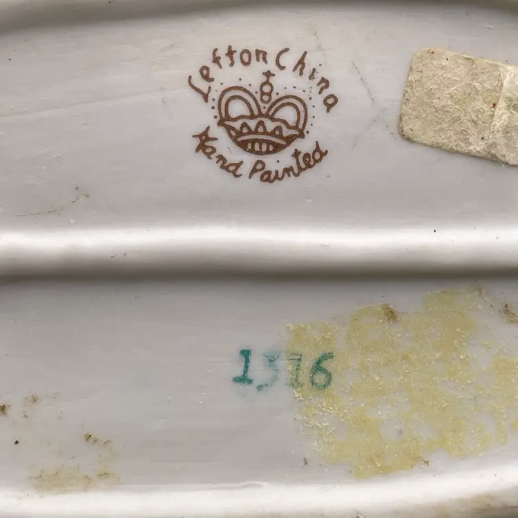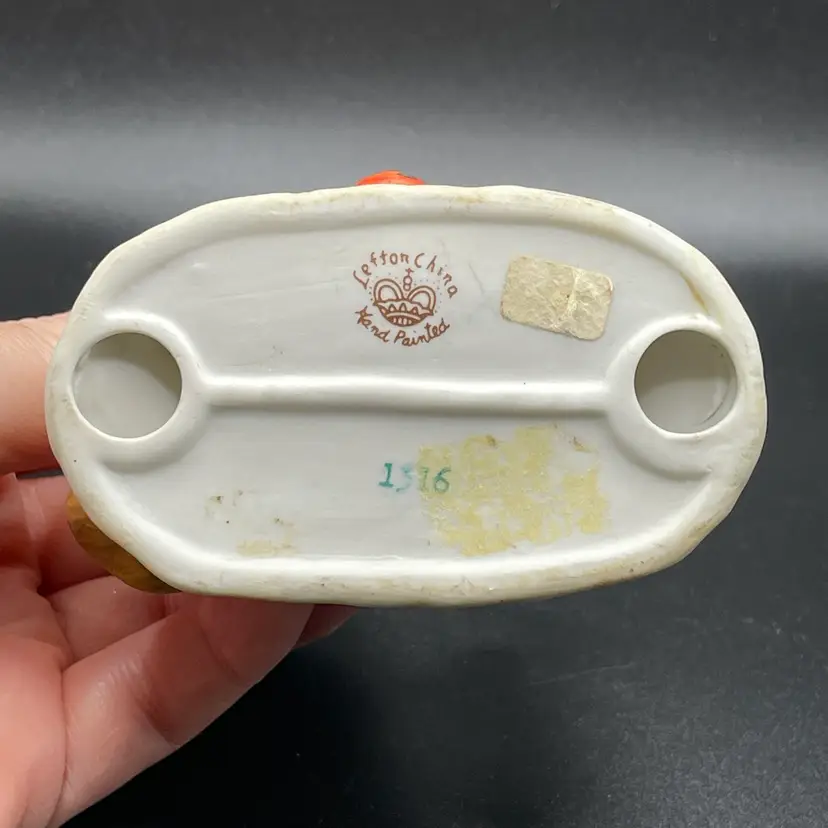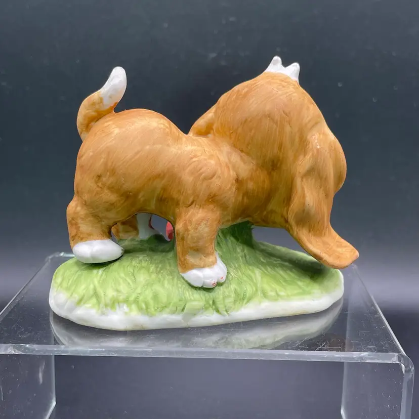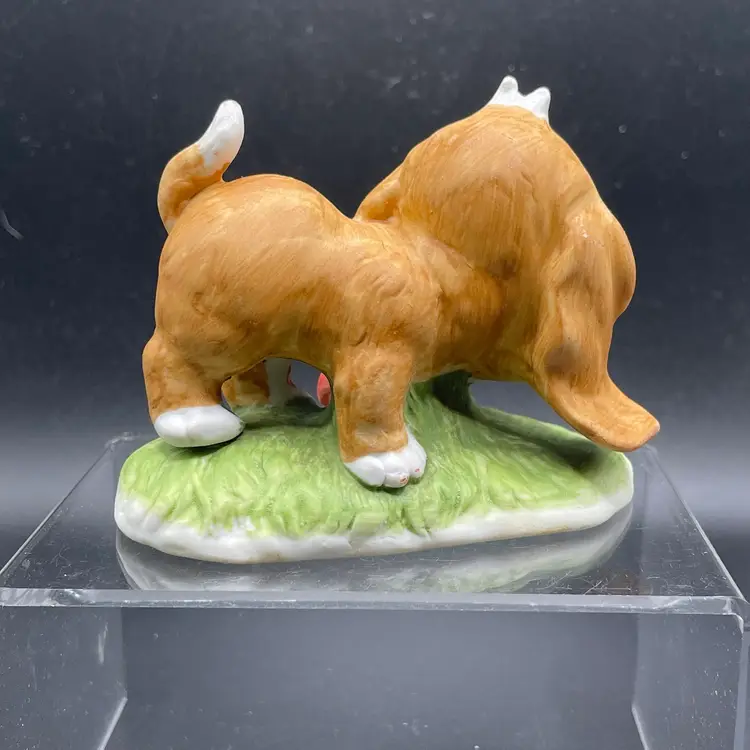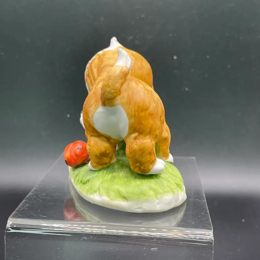 This is a vintage hand painted Lefton #1316 ceramic figurine depicting a puppy dog watching a ladybug. Marked on the bottom. Measures approximately 3.25" long x 2.5" tall. No chips or cracks.