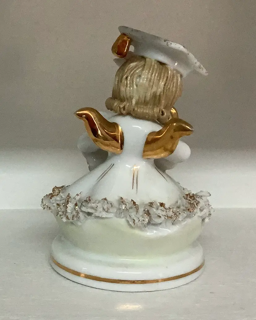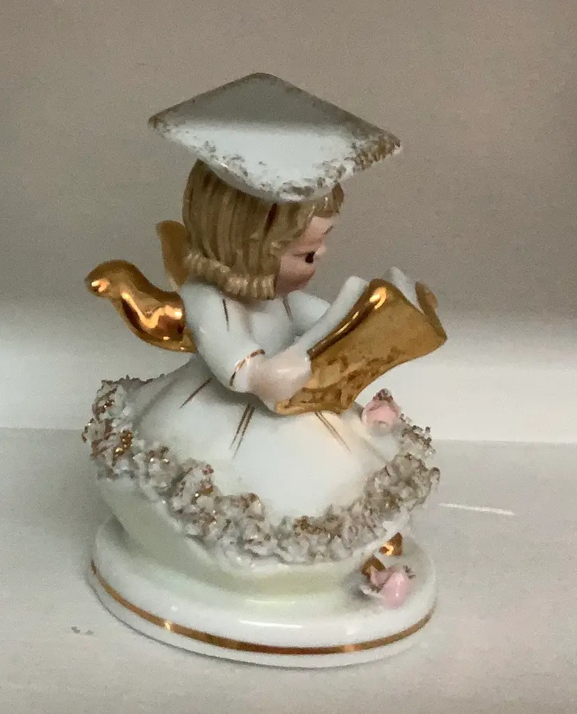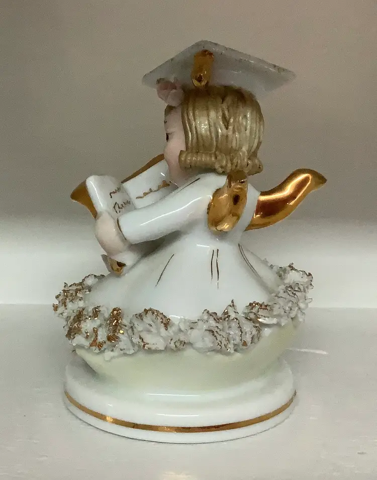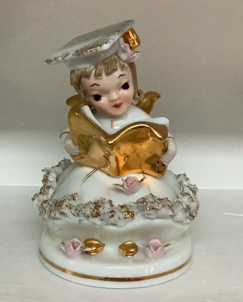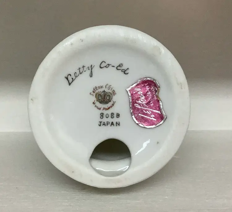 I have nine of these beauties from my Moms collection. This is Betty Co-Ed, and she has gold paint detailing. Delicate flowers and you can even see her book writing. Marked 808B, Lefton Foil sticker. Very nice condition. Please see photos. 4” tall. I appreciate you looking! I ship 3 day UPS, and pack securely for safe transit. Thanks!