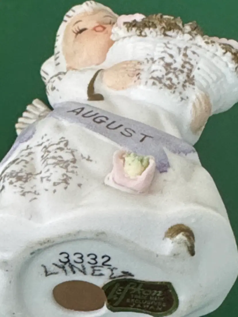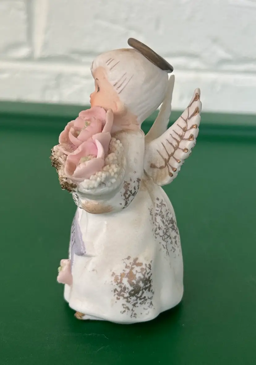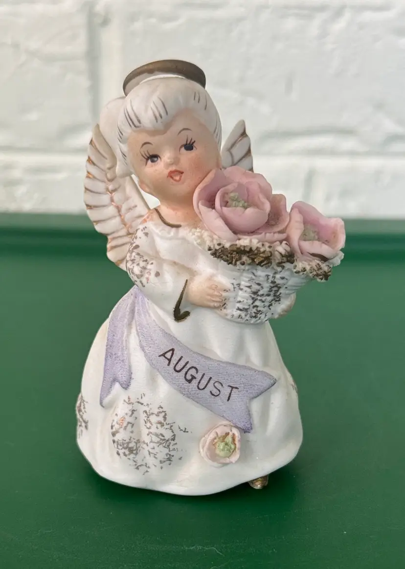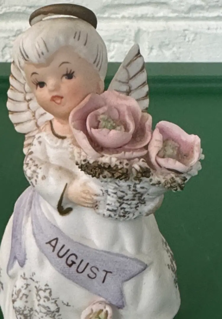 Charming angel figurine holding pink flowers. Features 'August' banner. Perfect for decor or collection. Lefton August Angel Figurine with Flowers #3332, 4 1/8” tall Excellent condition there is one tiny chip on the bottom side of the little flower under the august sash that I almost didn’t see. Adorable! (2414264)