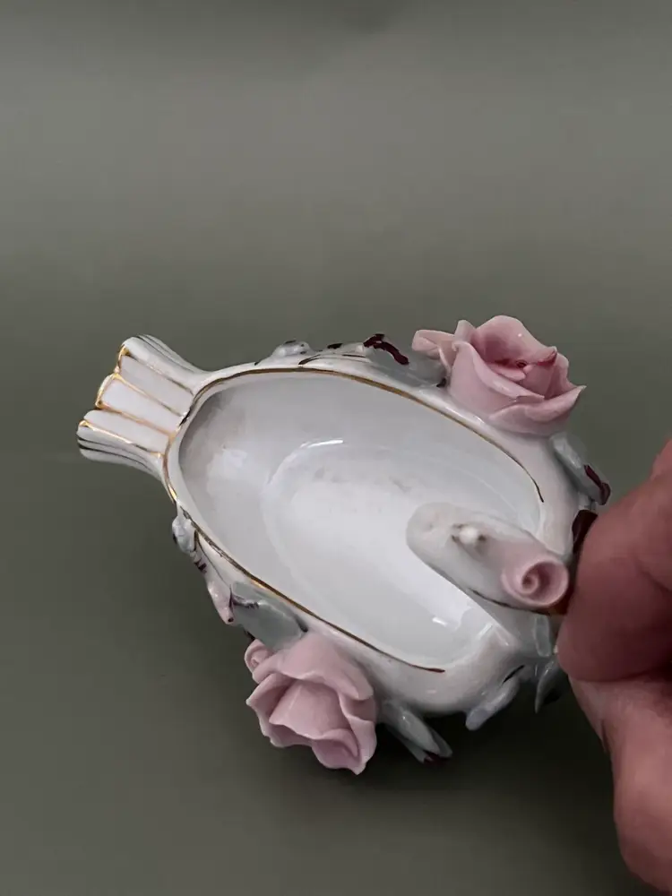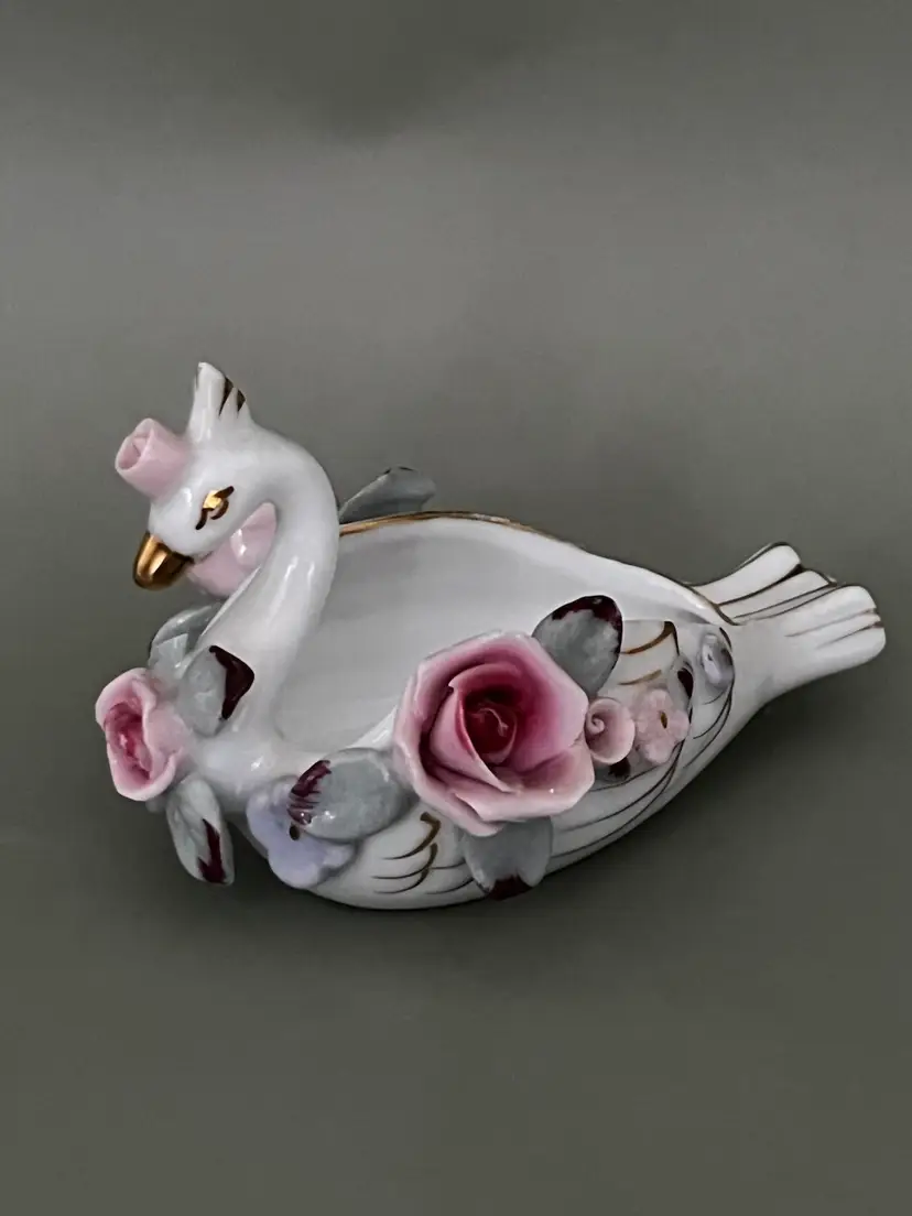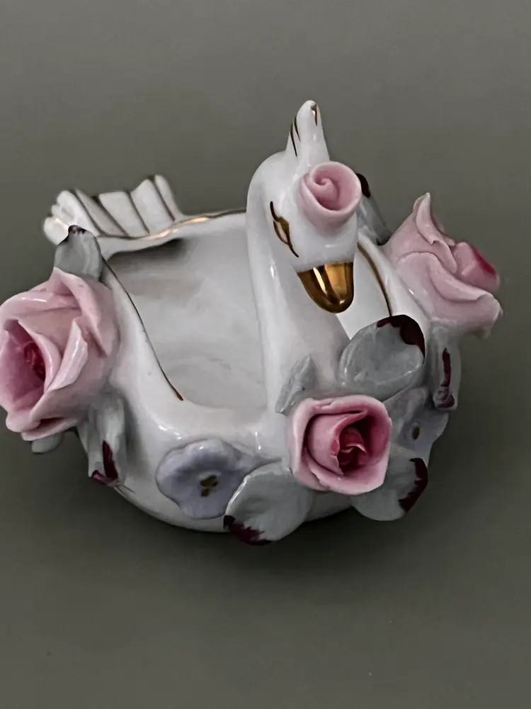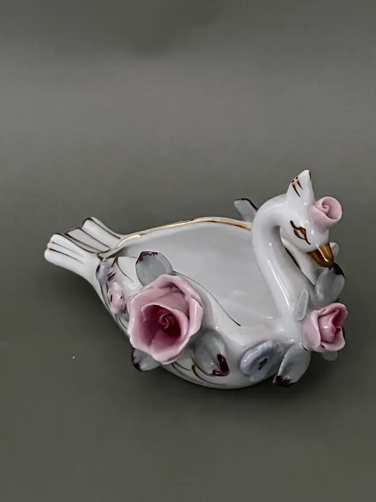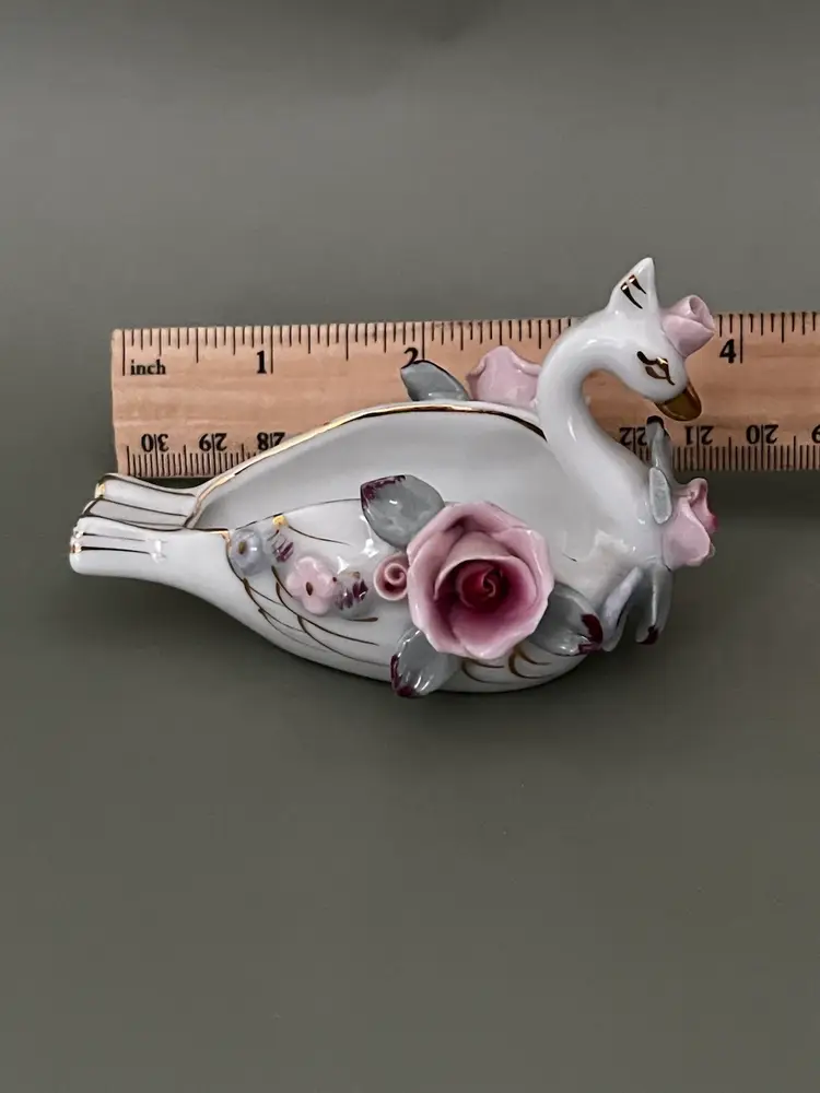 This vintage porcelain swan figurine trinket jewelry dish features delicate hand-applied flowers in pastel pink, making it a charming piece for all occasions. Made of fine bone china with a glossy finish, this 4-inch swan trinket dish from the 1950s is decorated with gold leaf, adding a touch of elegance to any collection. Crafted in Japan by the renowned brand Lefton, this collectible item exudes a retro charm with its floral design and swan subject, making it a timeless and decorative addition to any home.