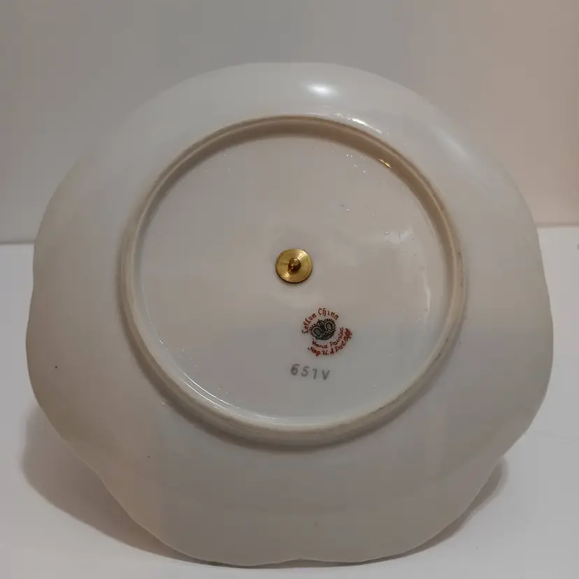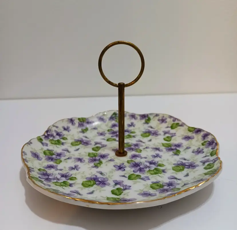 Vintage Lefton China Violet Chintz Tidbit Tray; 1 Tier; Brass Ring Handle; Hand Painted; Scalloped Edge; Add a Special Touch to Your Table! Marked Lefton China 615V on Bottom; 6" W x 5" T; Very Nice Condition; No Chips or Cracks!