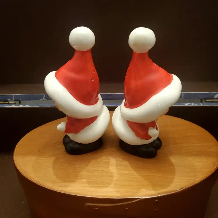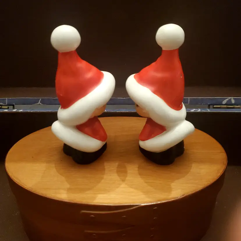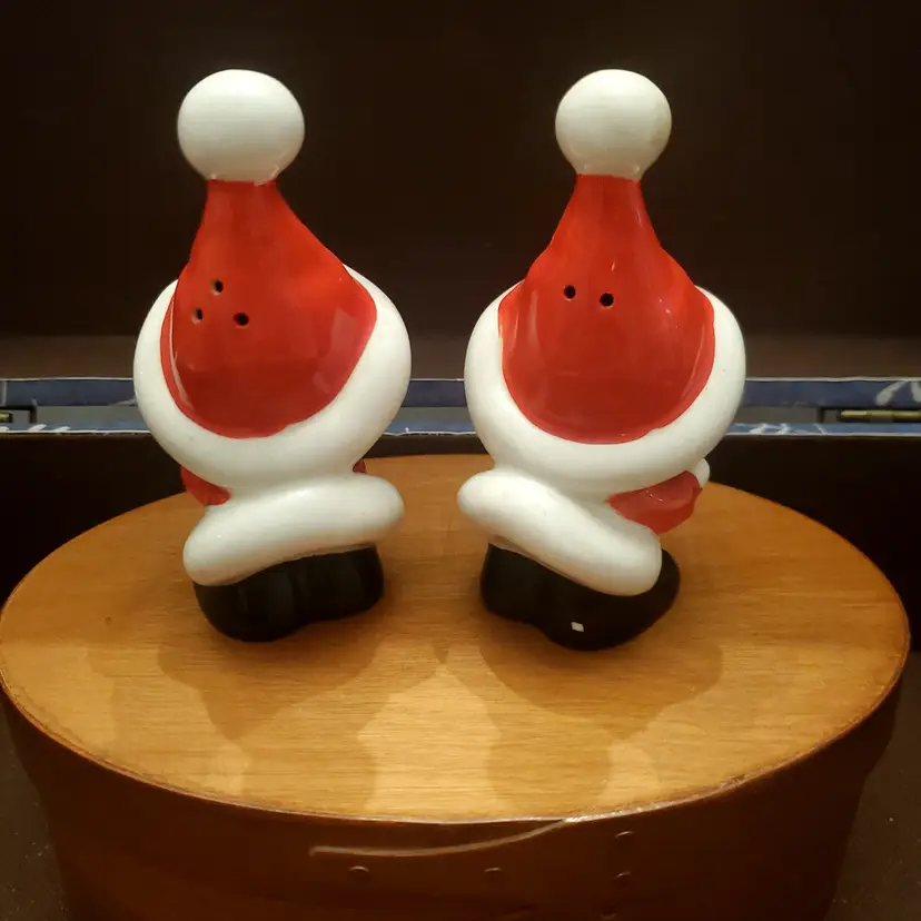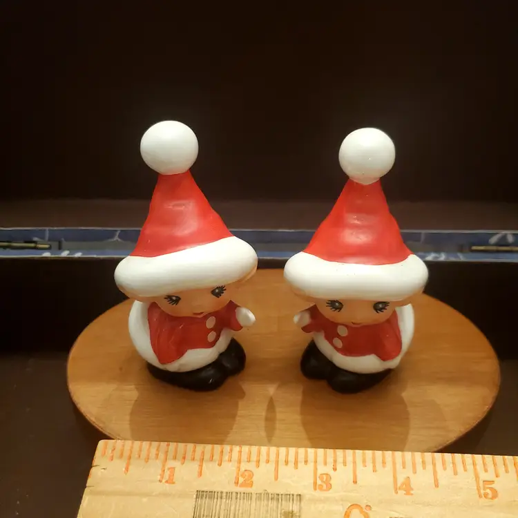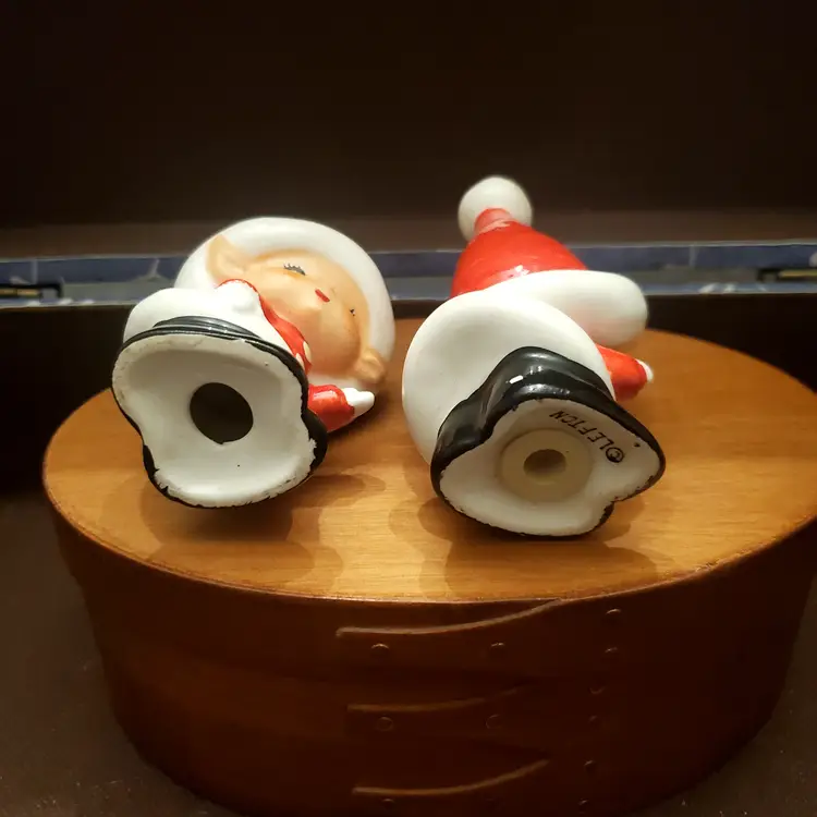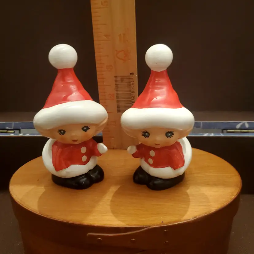 This is an adorable vintage set of ceramic salt and pepper shakers made by Lefton. One is missing a stopper and one has a small bit of paint loss on the back of his shoe. Approximate measurements in photos.