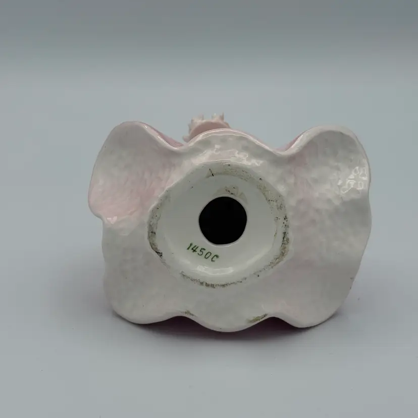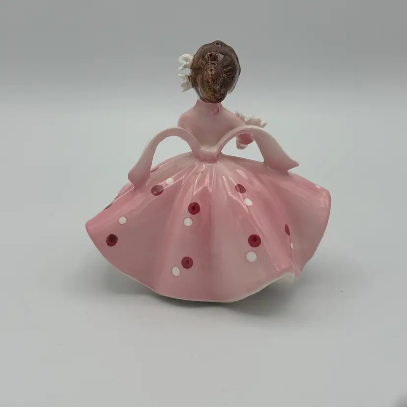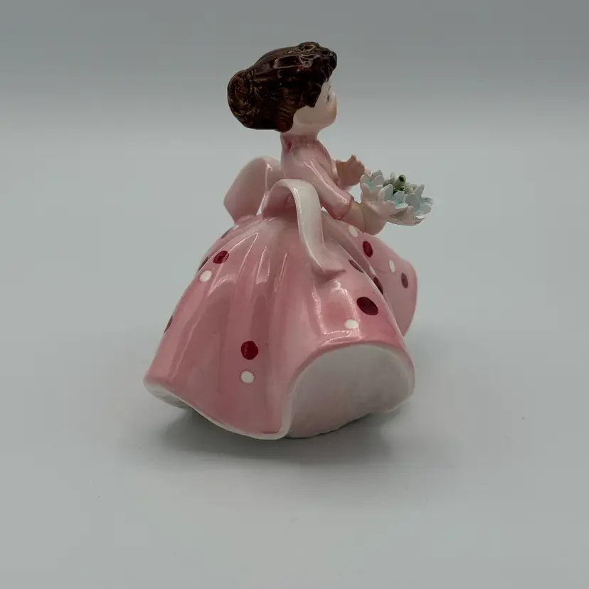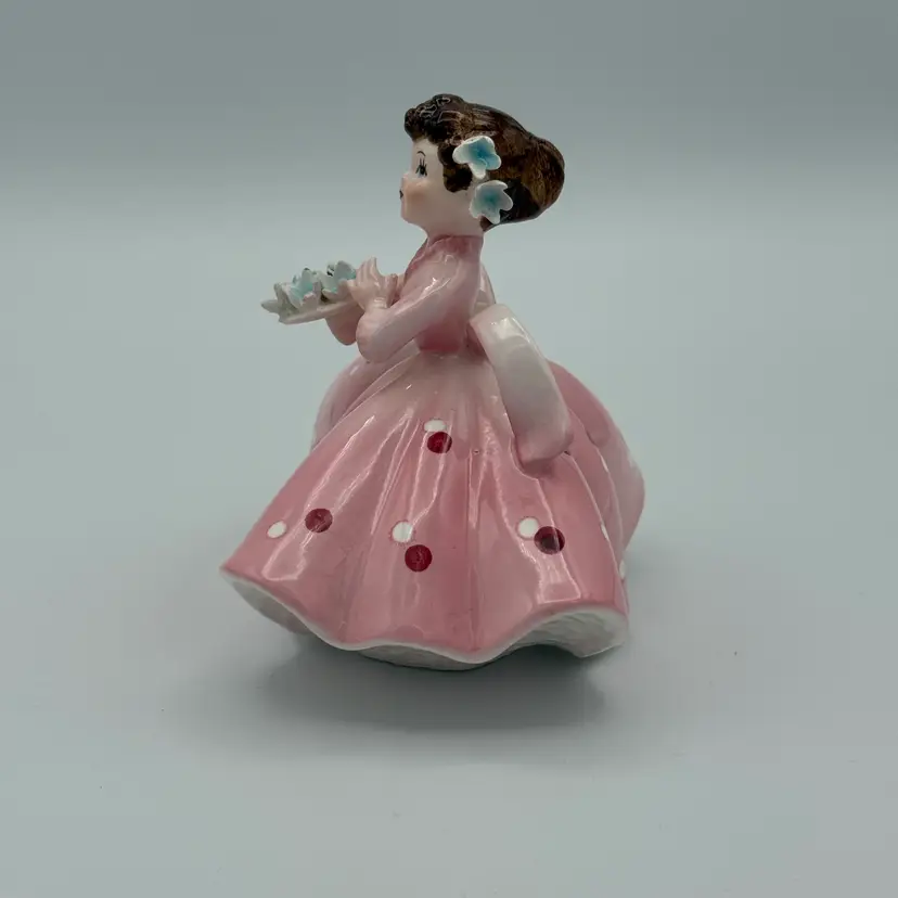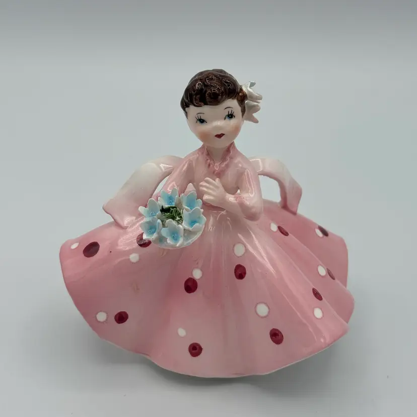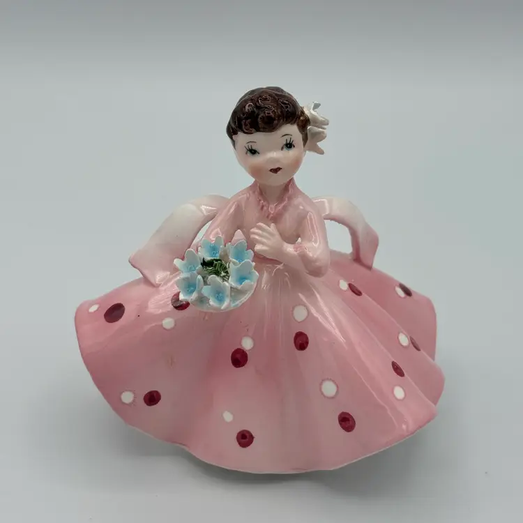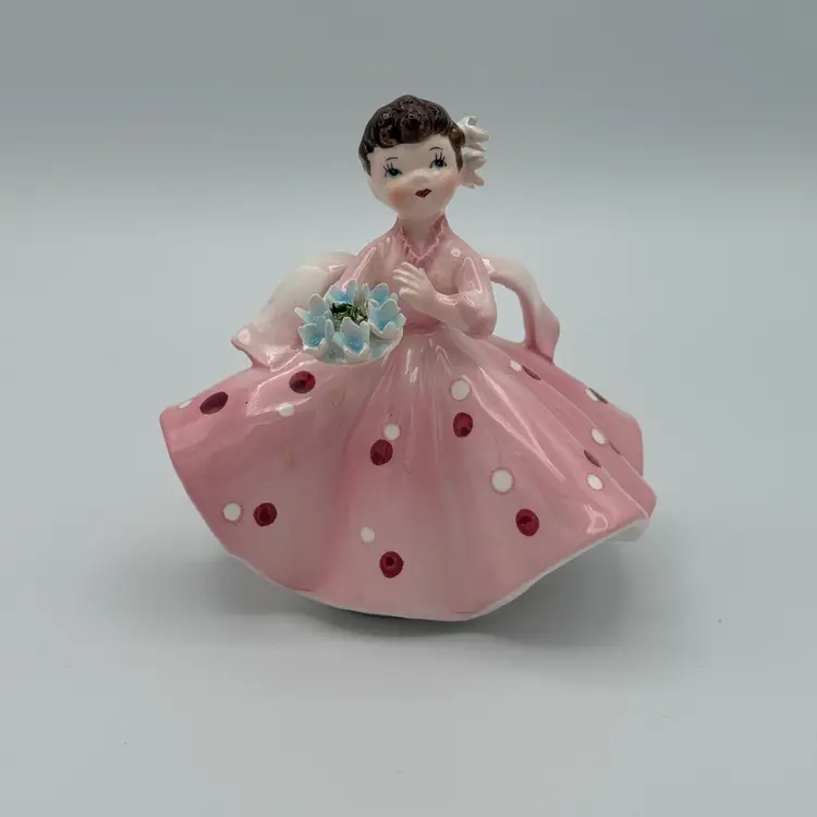 AS IS - Vintage Lefton Girl Porcelain Figurine - 1950's - Part of Big Bow Series. Features girl in a pink polka dot dress with a bow holding a bouquet of blue flowers. There is a repair on the hand that is holding the bouquet. The bouquet tends to hide the repair. Displays well.