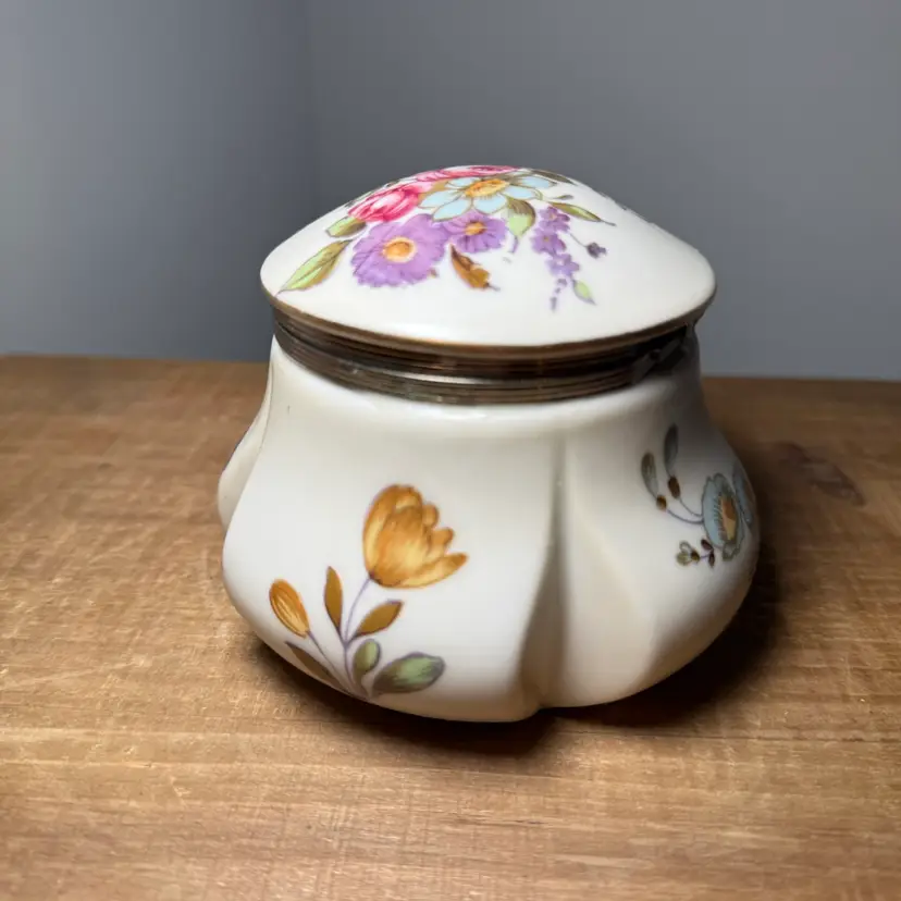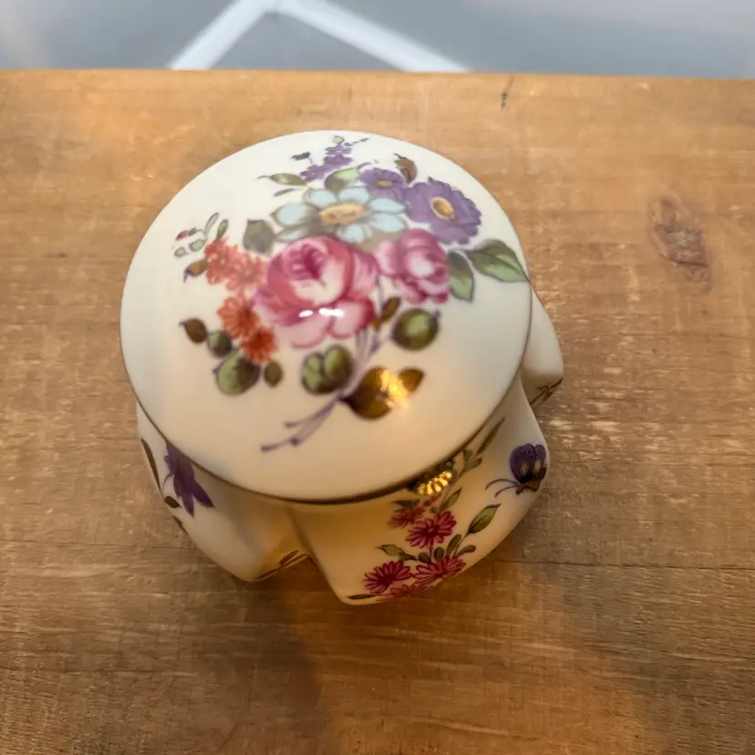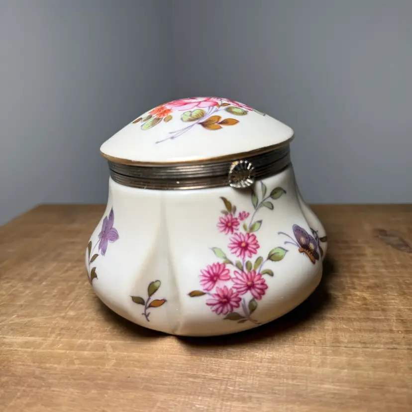 Vintage Lefton porcelain trinket box with hinged lid. Hand painted floral design with purple butterfly accents. Model number XA8136 stamped on the bottom with original foil label. Metal hinge and clasp are secure and functional. Matte finish exterior with smooth glazed interior. Small size suitable for jewelry or small keepsakes. Made in Japan.
