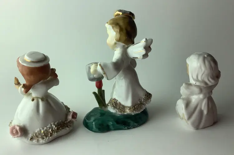 Three beauties here. Lady on left is a Lefton bell, needs a dinger. Pigtails, roses, bow and arrow. Foil sticker inside, measures 3” x 2.25”. Center is Angel with Halo and watering can. Measures 4” x 2.5” x 1.75”. Marked Japan 1950s. Tiny break on grass. Right lady is a Wreath Angel, 2.75” x 1.5”. Japan. Spaghetti treatment and gold paint trim. Good pre- owned condition. I ship three day UPS, and pack with bubble wrap for safe travels. Thanks!