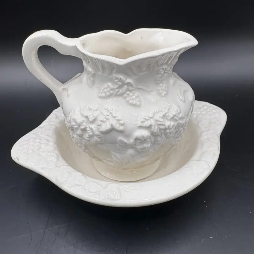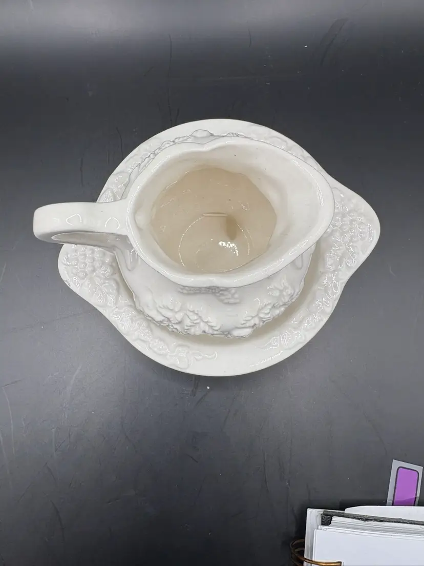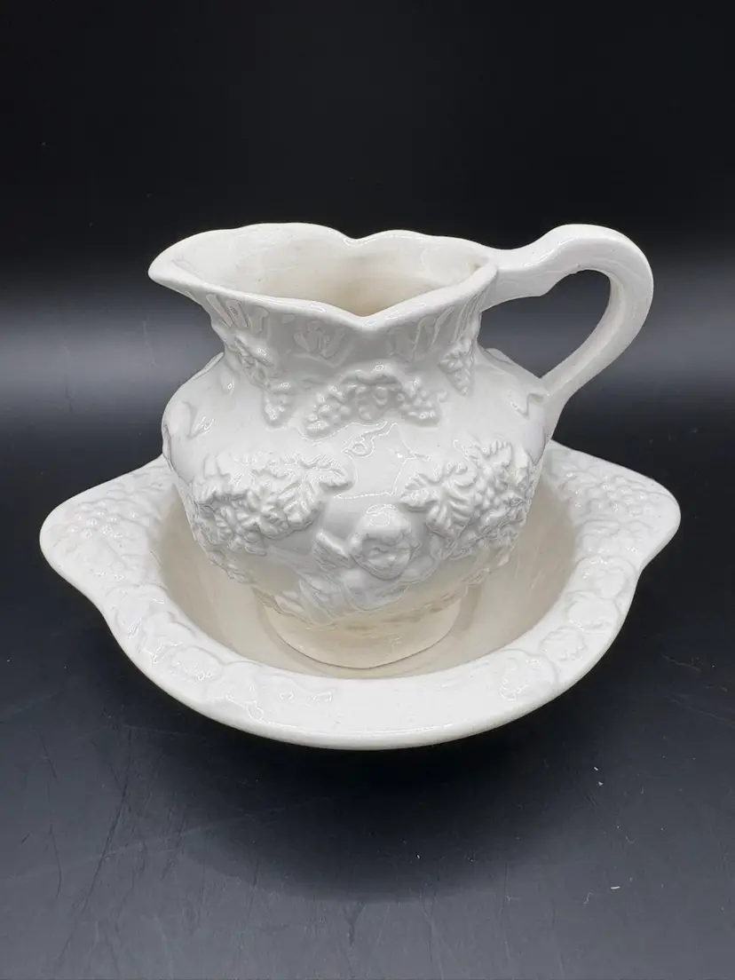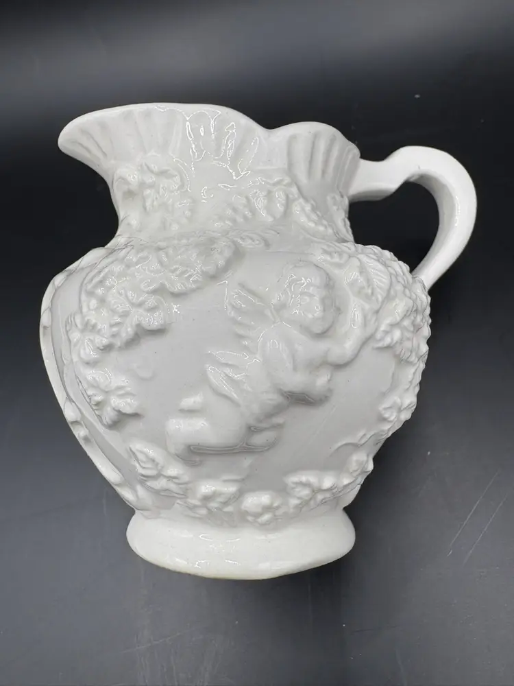 Lefton Mini Pitcher with underplate Cupid and Cherub design Renaissance bone china Pitcher is 3 inches tall, 3 1/2 inches at widest Underplate measures 5 inches by 4 inches No chips or cracks