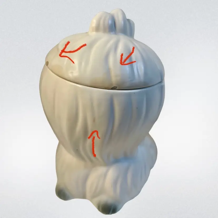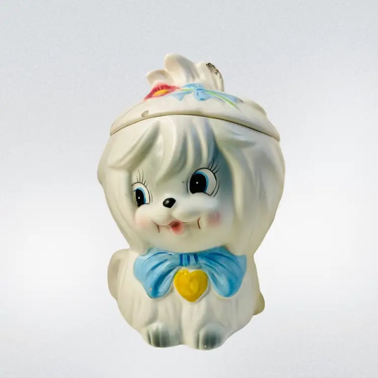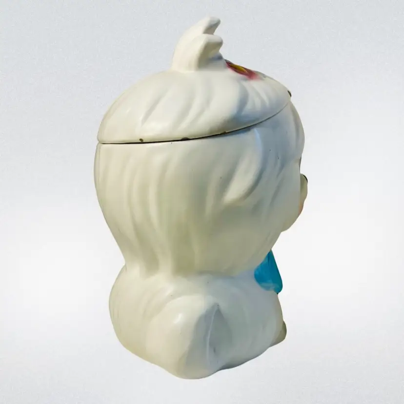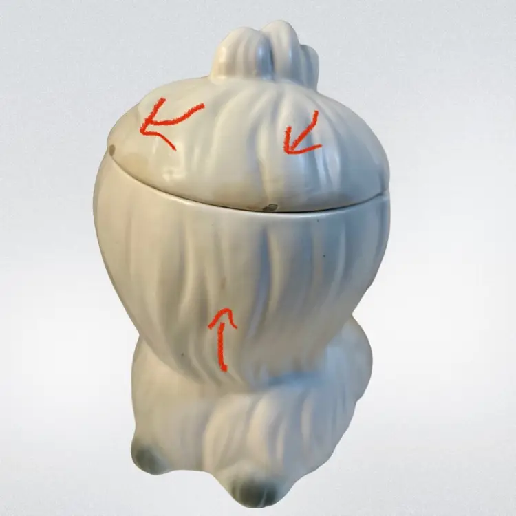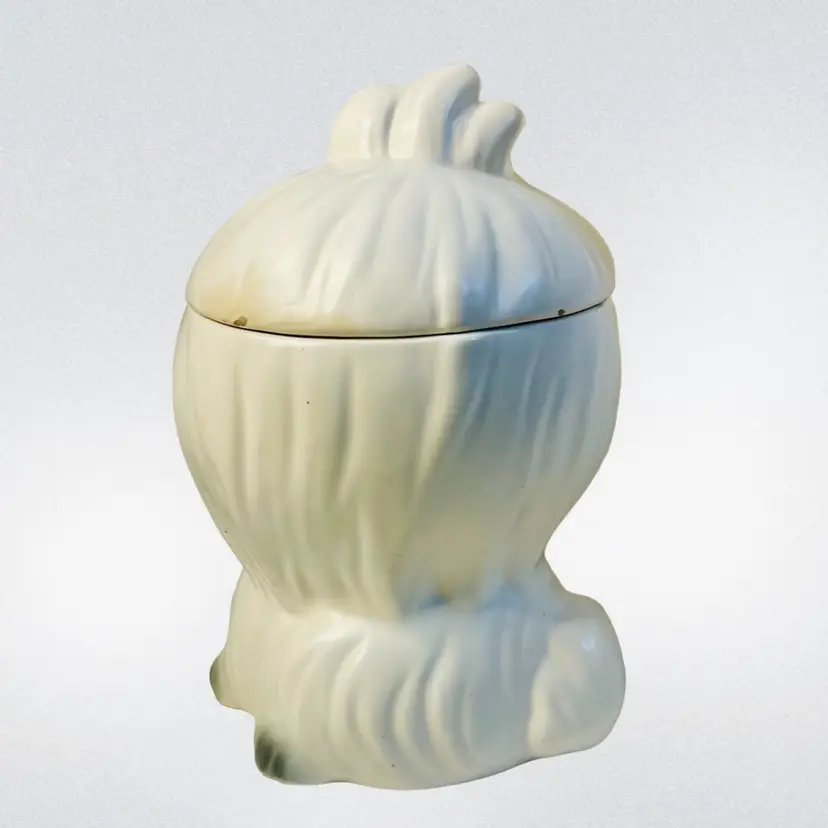 Lefton Mr Tootles, white Maltese dog satin finish. Condition: No cracks or crazing. Several chips on lid, one chip on bow. Discoloration areas on lid. Smaller discoloration spot on side. Measurements: Approximately 9.5” T x 6.25” W. Please see pictures for condition and measurements as they are a part of the description. Item # 1493 Thank you for looking!