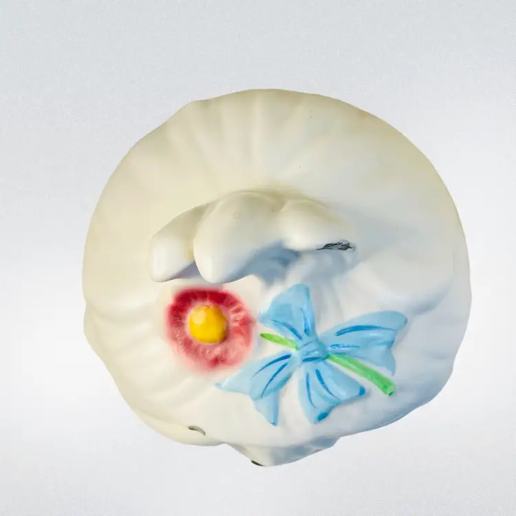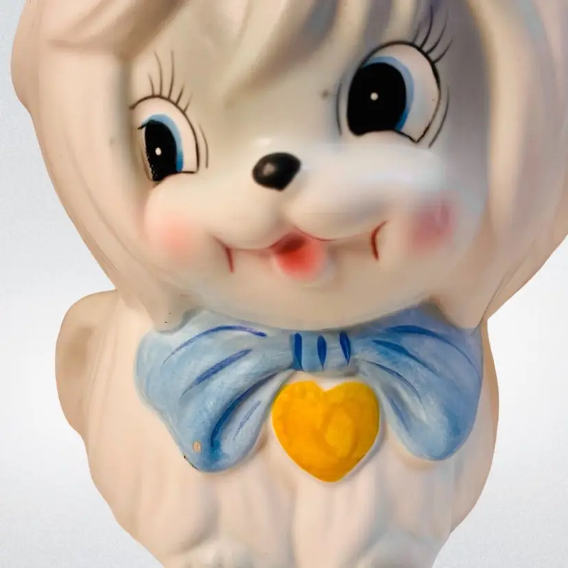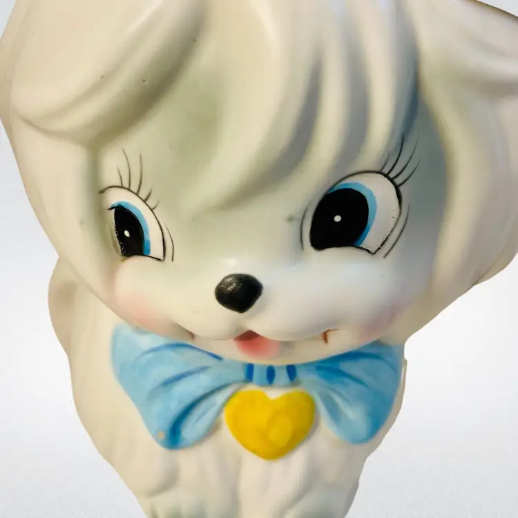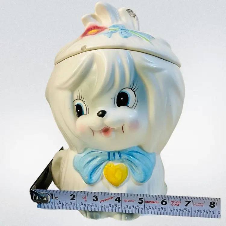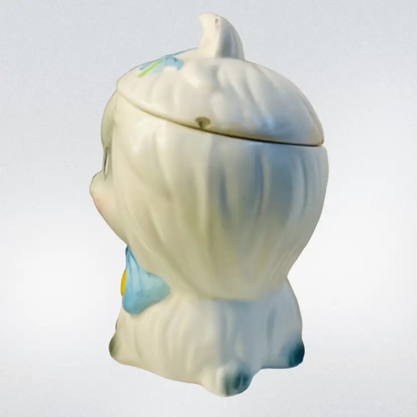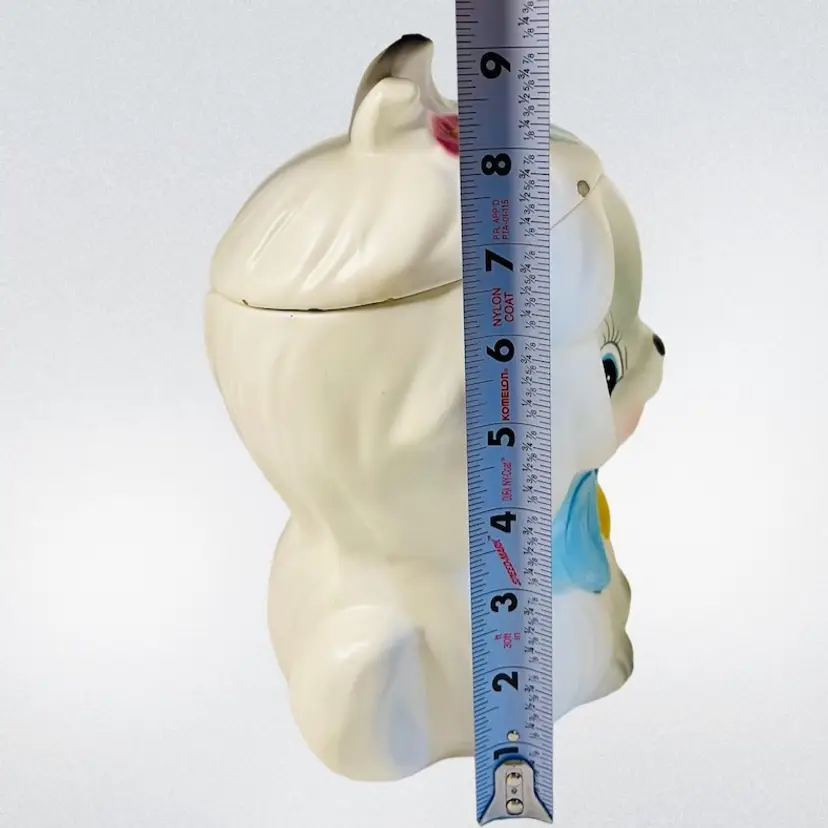 Lefton Mr Tootles, white Maltese dog satin finish. Condition: No cracks or crazing. Several chips on lid, one chip on bow. Discoloration areas on lid. Smaller discoloration spot on side. Measurements: Approximately 9.5” T x 6.25” W. Please see pictures for condition and measurements as they are a part of the description. Item # 1493 Thank you for looking!