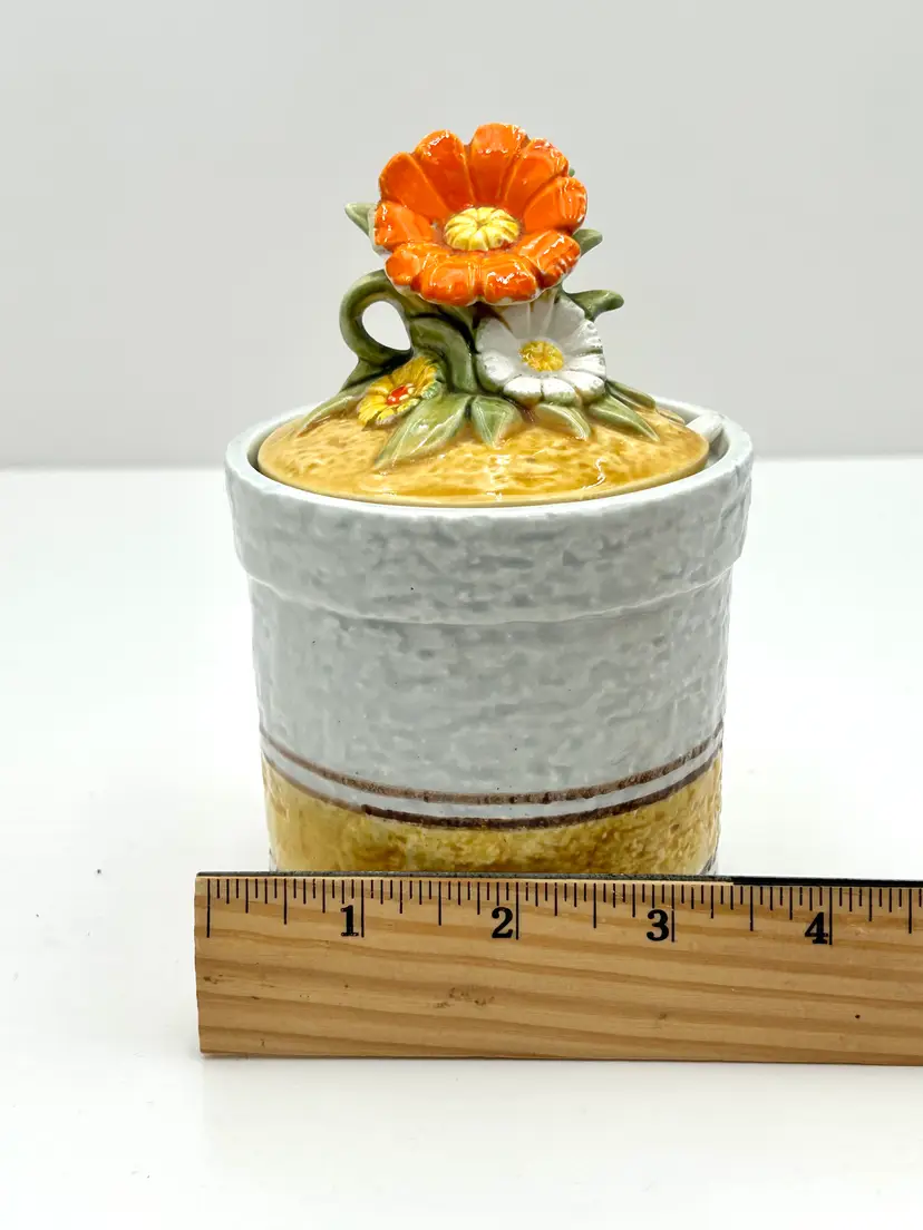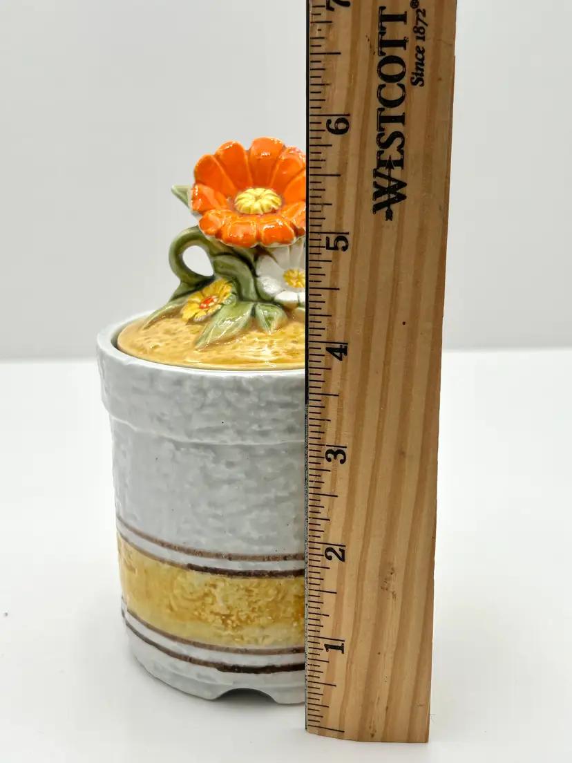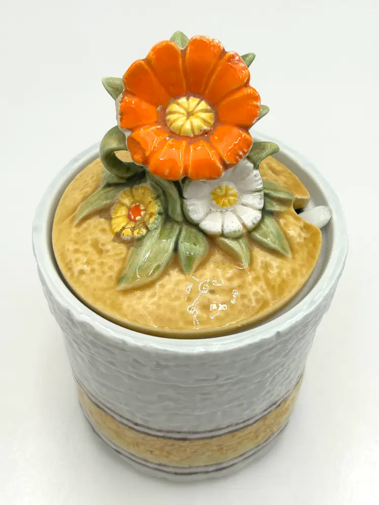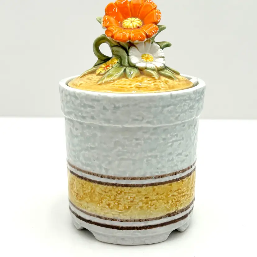 Not really sure what this pretty little lidded canister was supposed to hold, but it would be a perfect honey pot or sugar dish with its lid and its spoon. This ceramic piece is from Lefton and has colorful chrysanthemum flowers on the lid and a pretty lava-like texture glaze to the pottery. It is a white color with a golden yellow and brown stripes on the jar and the same yellow lid. The spoon that came with it is probably not the original but it is a white plastic. The jar is almost 6 inches tall to the top of the flowers and is approximately 3 ¼ inches wide. There is some discoloration to the flowers that may be from dirt that needs more than some water whip down but there are no chips or cracks.