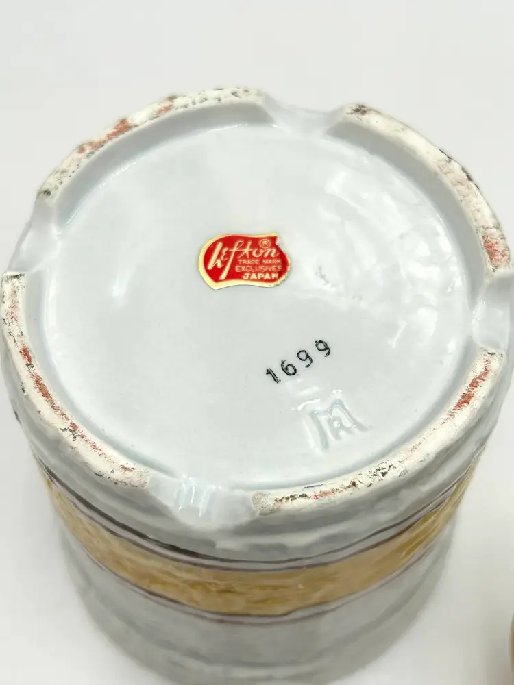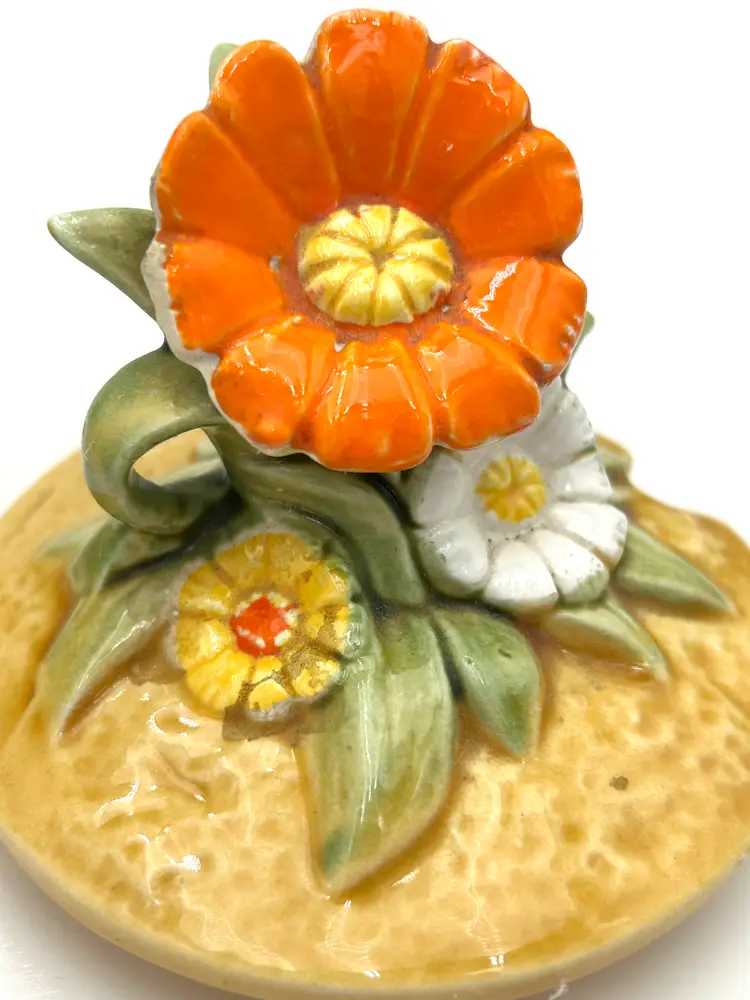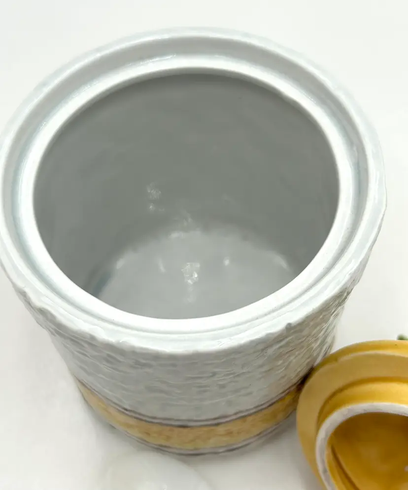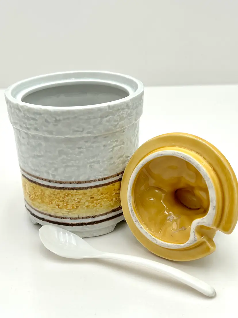 Not really sure what this pretty little lidded canister was supposed to hold, but it would be a perfect honey pot or sugar dish with its lid and its spoon. This ceramic piece is from Lefton and has colorful chrysanthemum flowers on the lid and a pretty lava-like texture glaze to the pottery. It is a white color with a golden yellow and brown stripes on the jar and the same yellow lid. The spoon that came with it is probably not the original but it is a white plastic. The jar is almost 6 inches tall to the top of the flowers and is approximately 3 ¼ inches wide. There is some discoloration to the flowers that may be from dirt that needs more than some water whip down but there are no chips or cracks.