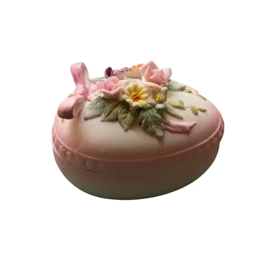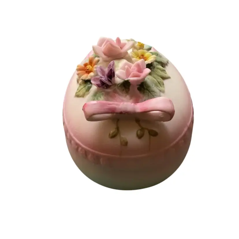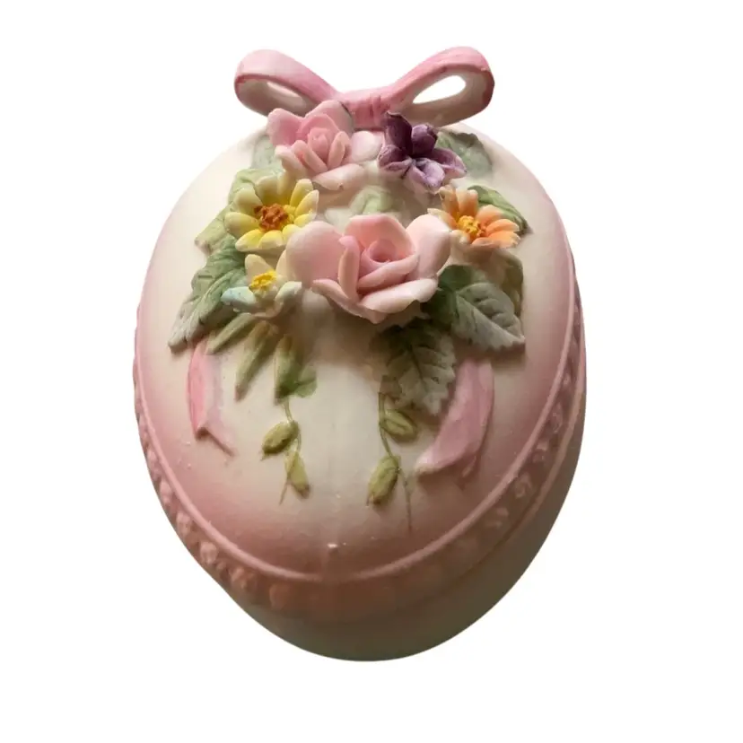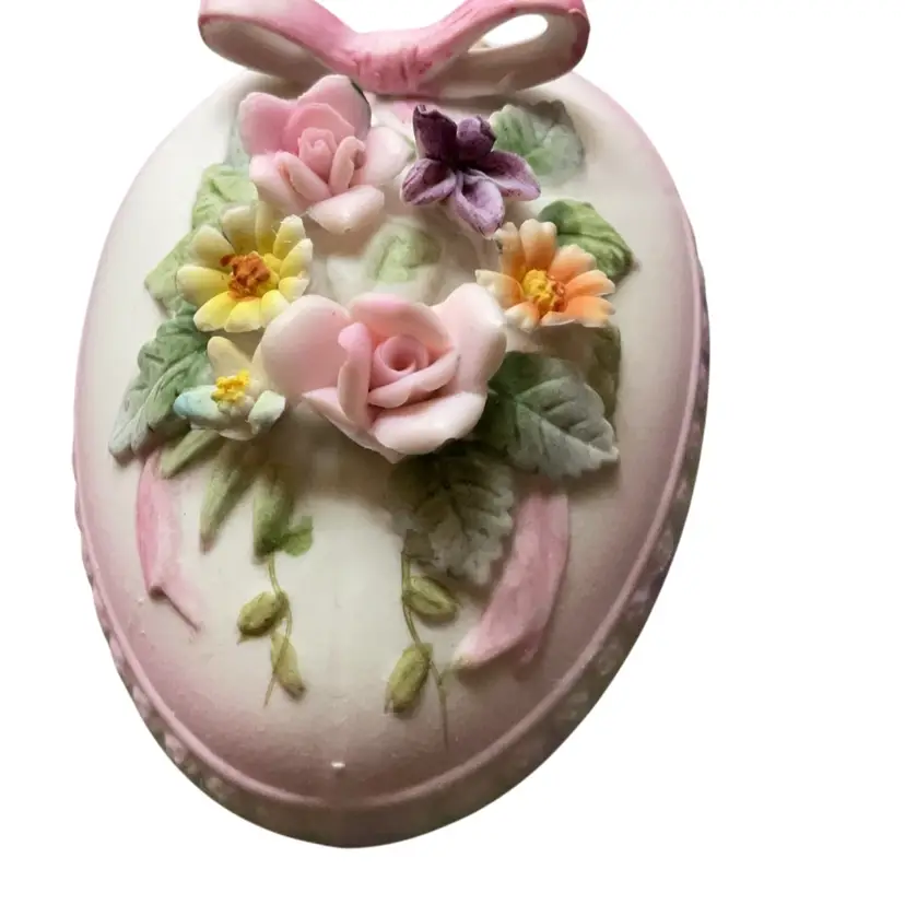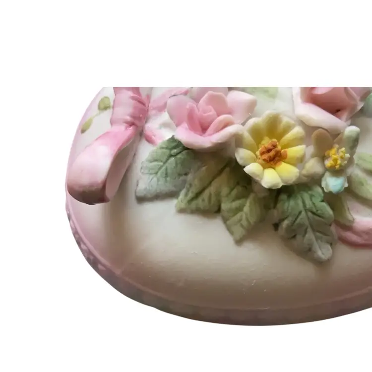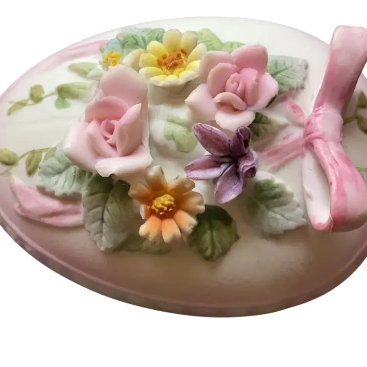 3 1/4 length 2 1/2 wide from middle 2 3/4 high 8 1/2 inches around Flaws: rose petal chip, daisy petal is chipped, blue flower, petal, broken off. Is not highly visible.