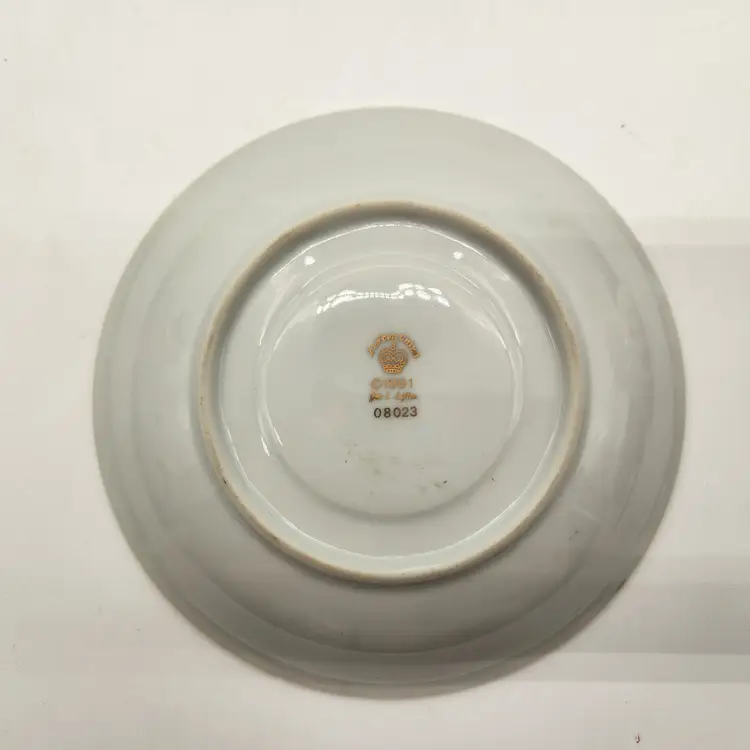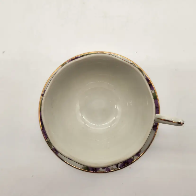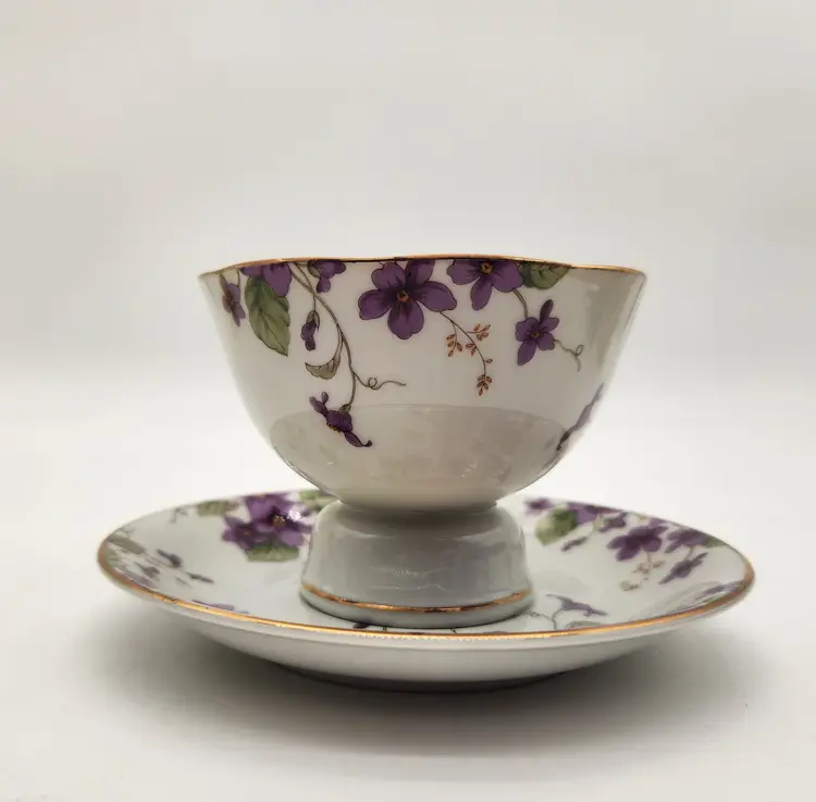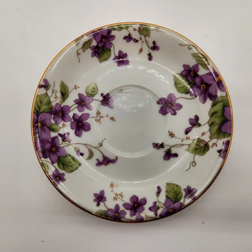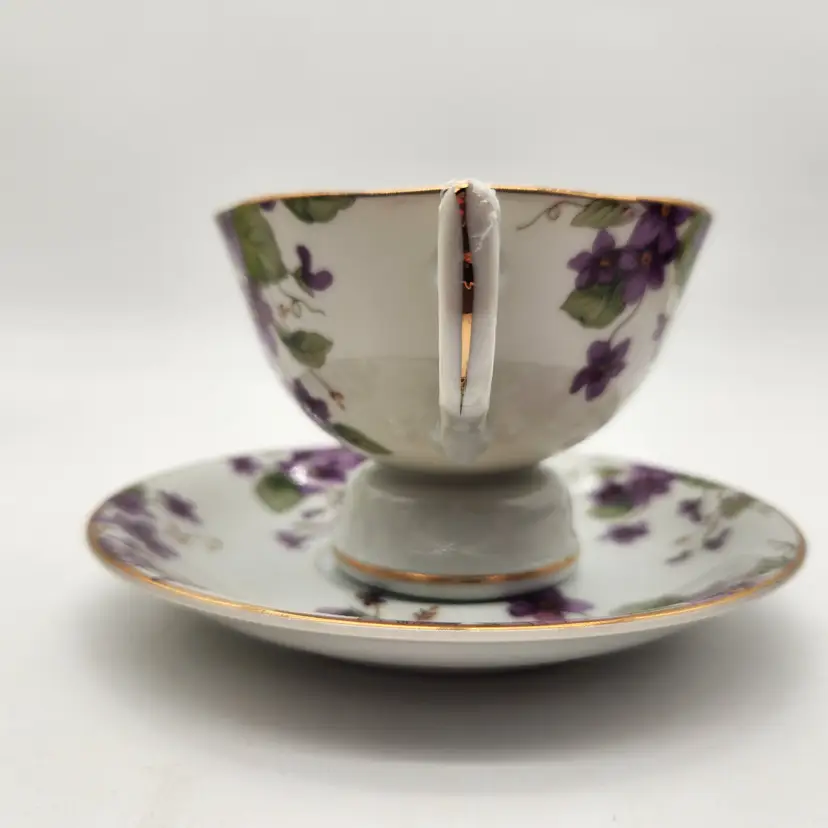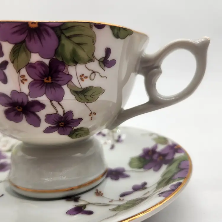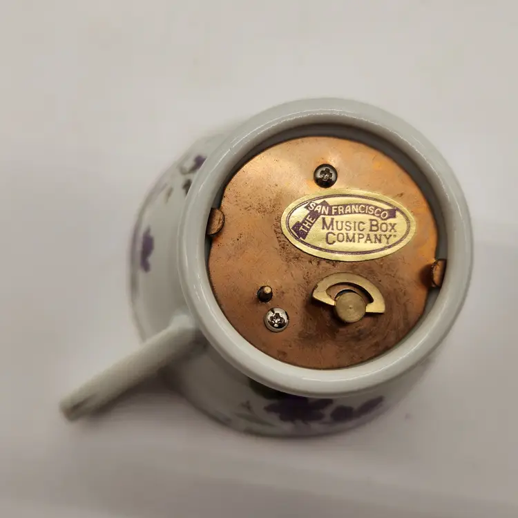 This beautiful vintage violet-covered tea cup and saucer have a secret - the cup's pedestal is also a music box! Lefton and The San Francisco Music Box Company - two companies known for their excellence in their respective fields - joined together in this charming 1991 collaboration. Lake New Condition: no chips, cracks, or crazing. The music box is working. Measurements: Tea cup - 4" in diameter at the rim, 2" deep interior of cup, 3" from top of cup to bottom of pedestal. Saucer - 5 1/2" in diameter