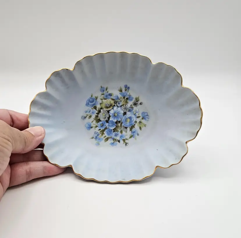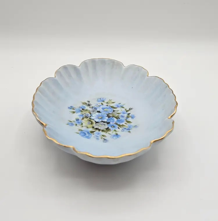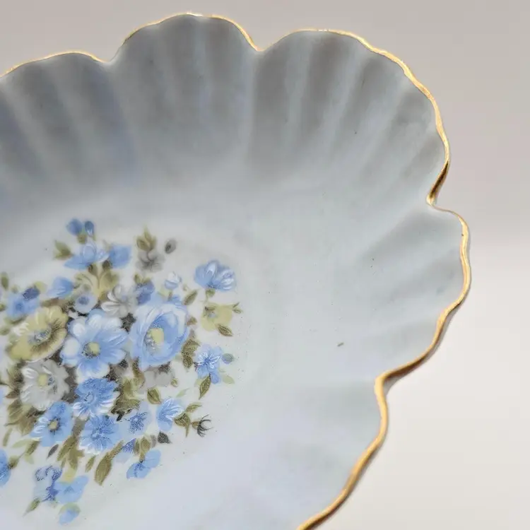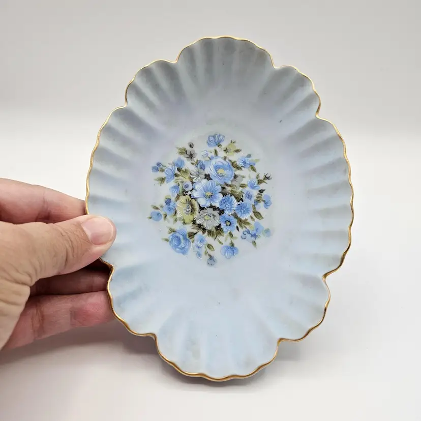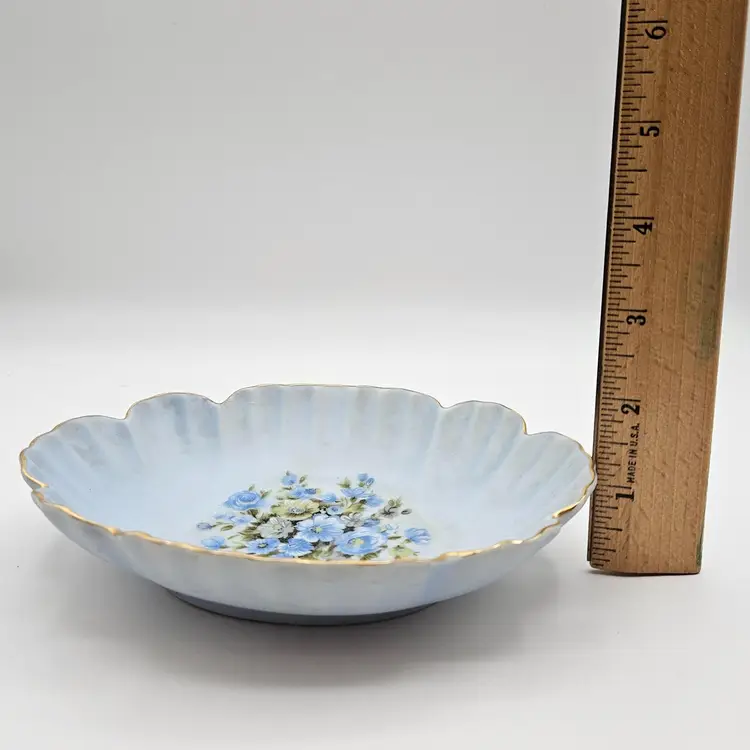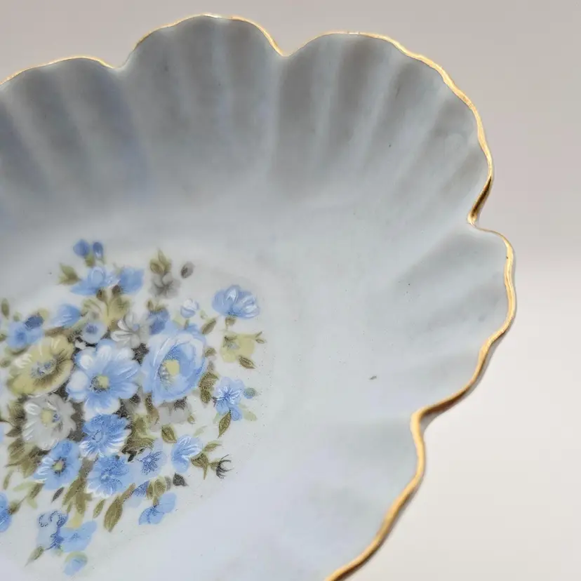 Pretty porcelain dish from Lefton, featuring a hand-painted design of blue, white, and yellow flowers and accented with gold trim along the scalloped edges. Frosted or satin finish.