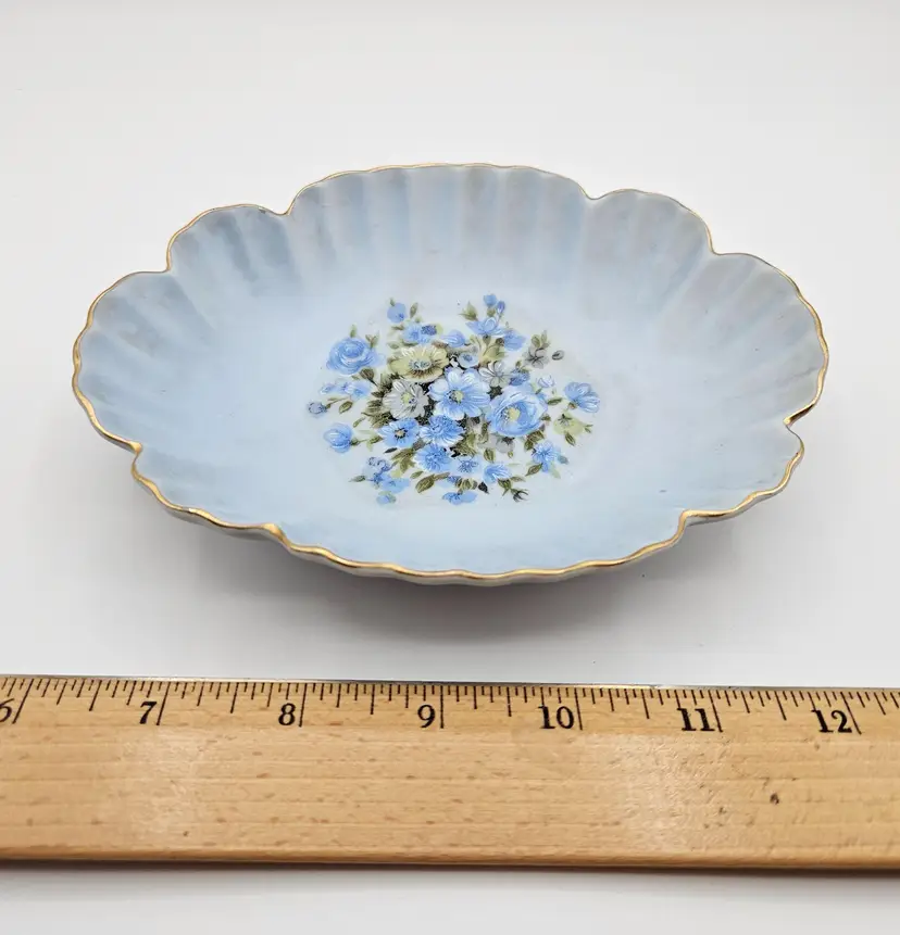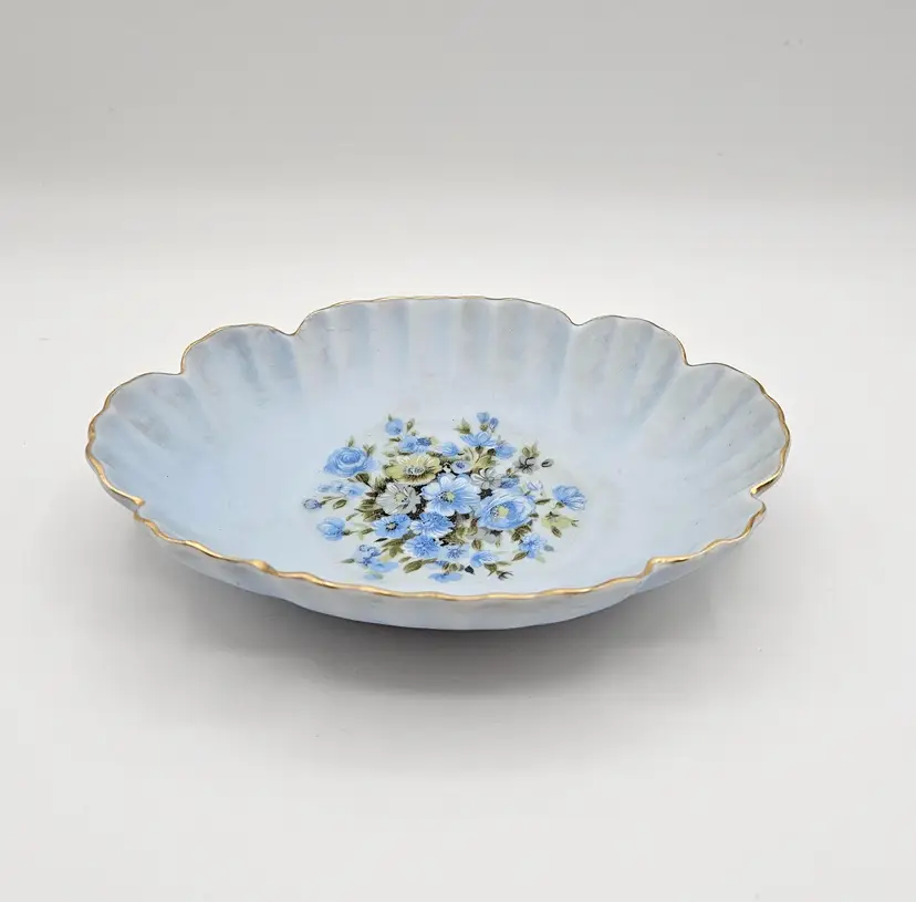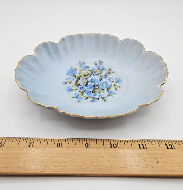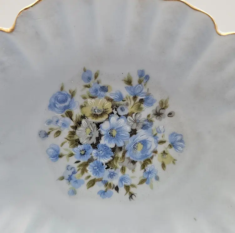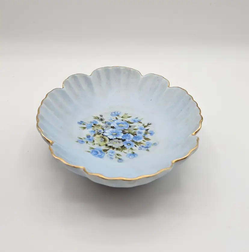 Pretty porcelain dish from Lefton, featuring a hand-painted design of blue, white, and yellow flowers and accented with gold trim along the scalloped edges. Frosted or satin finish.