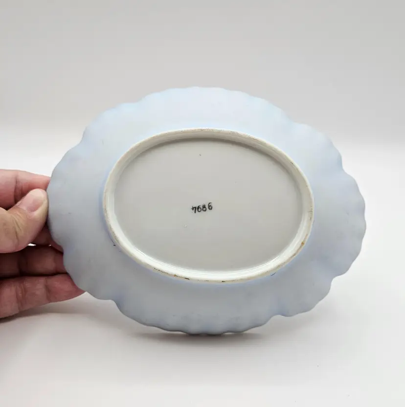 Dish is marked on the underside with the model number 7686. Would be lovely as a soap dish or as a trinket dish on a vanity or side table.