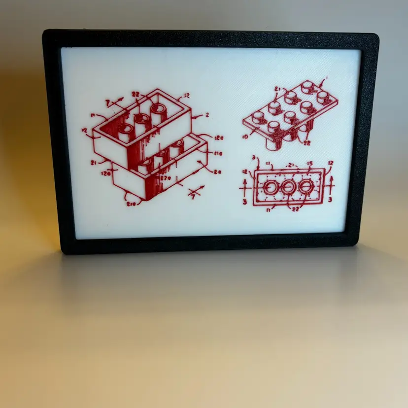 3d printed patent of Lego brick. 8 & 1/4 x 5 & 3/5. Can hang in your Lego room or place on your desk.