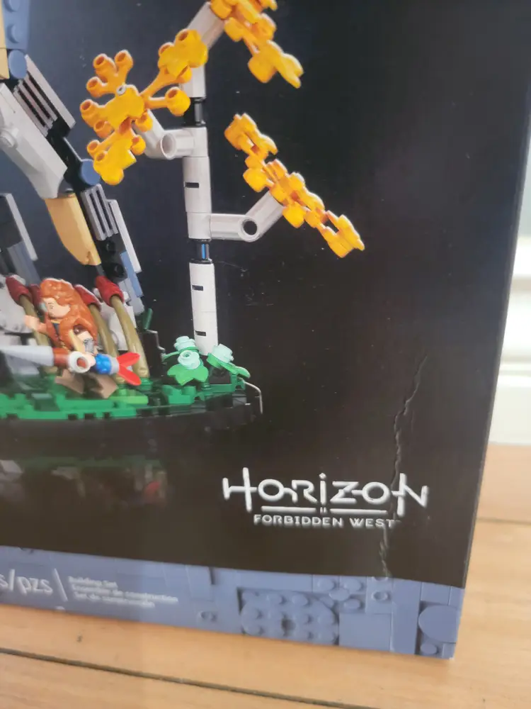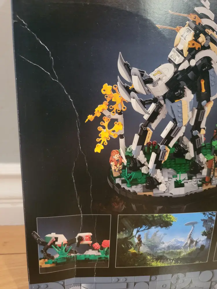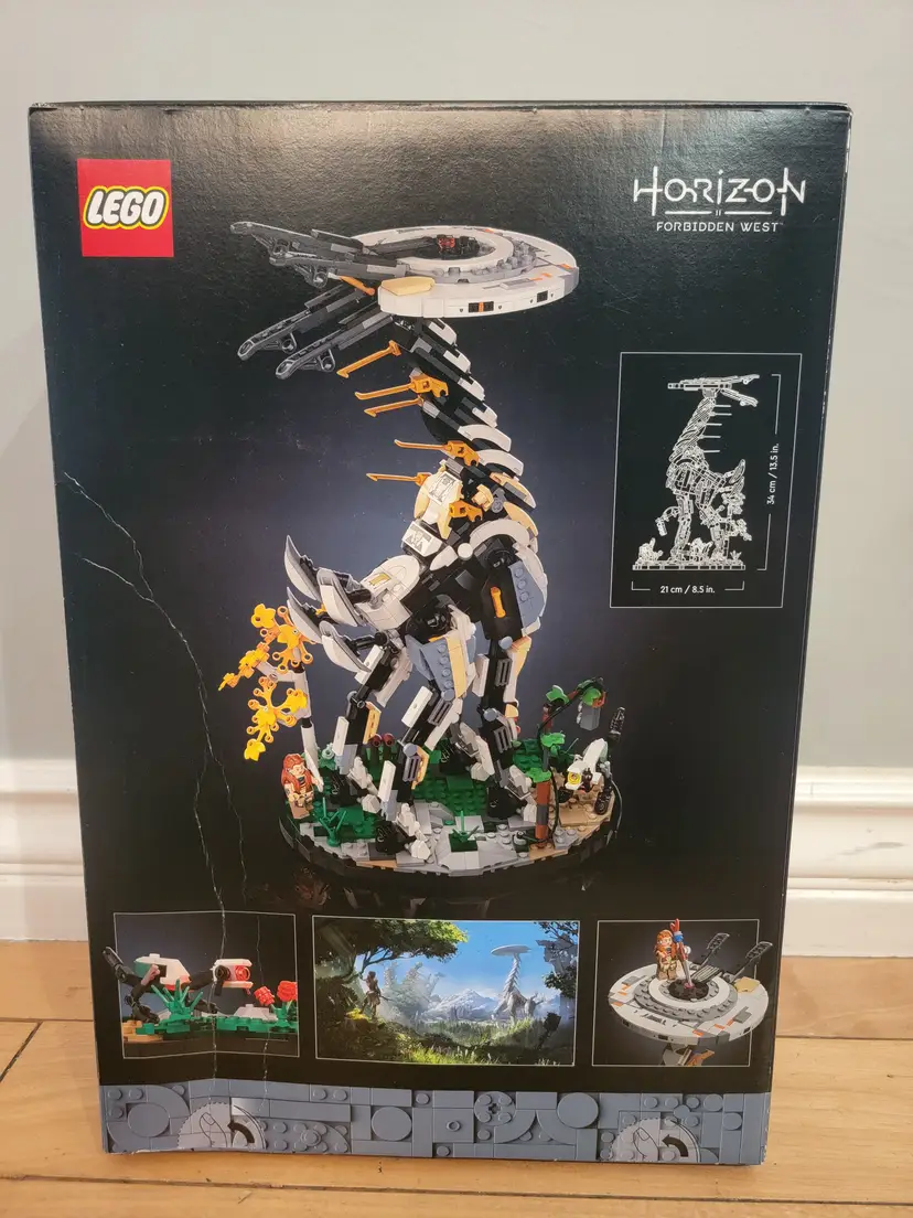 New and sealed Lego set 76989 - Horizon Forbidden West: Tallneck. Retired set with an exclusive Aloy minifigure. The box does have some damage (box creases) on the both the front and back (mostly the back) as shown in the pictures. However, the set is new and sealed.