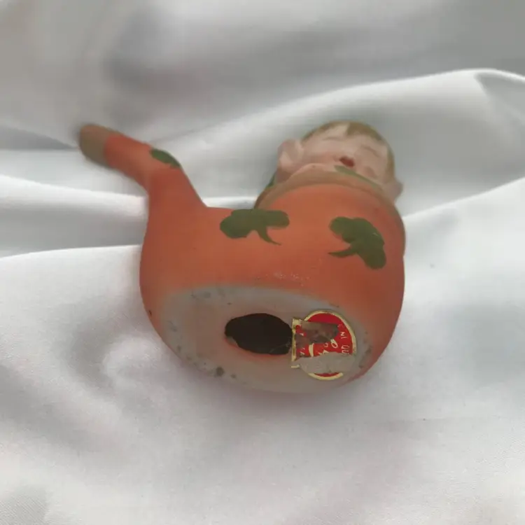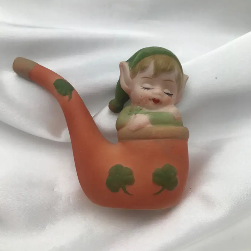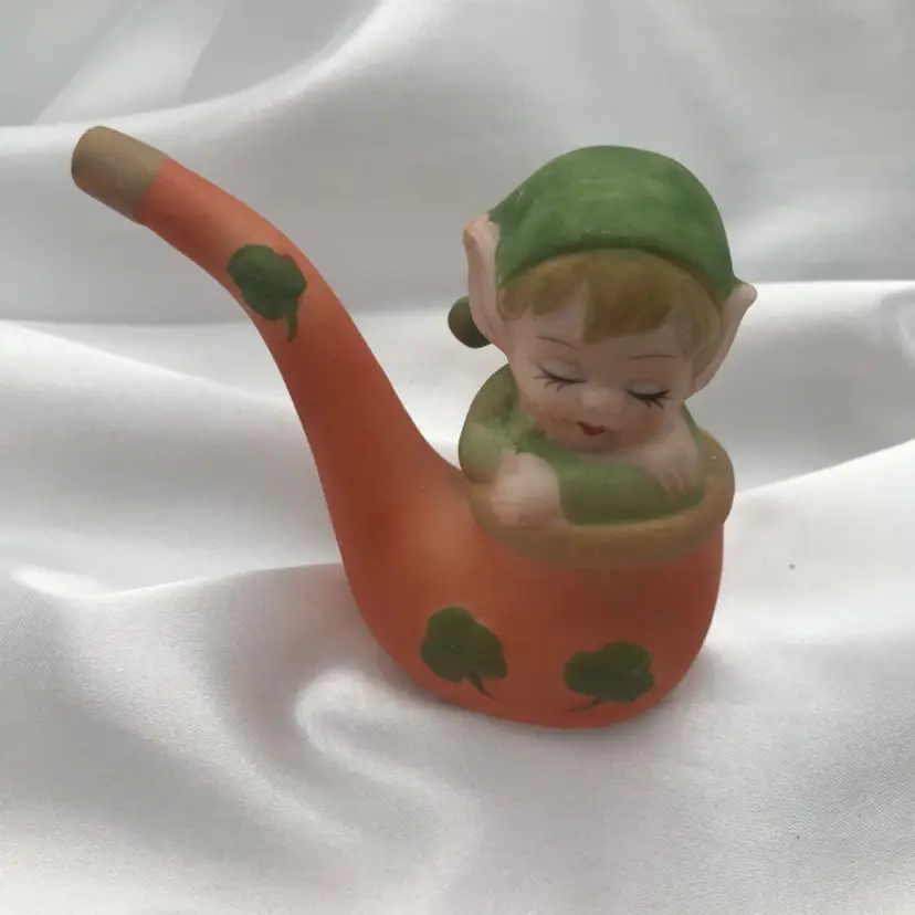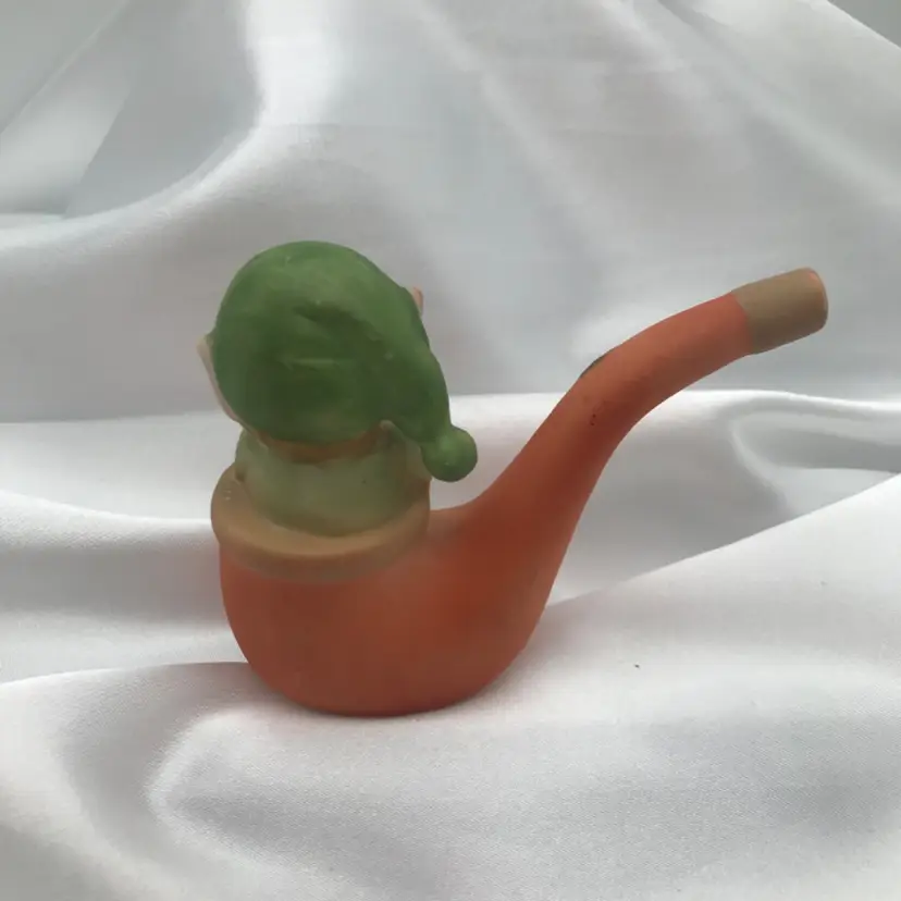 Vintage Lego Japan pixie elf sitting in shamrock pipe. No chips or cracks or repairs. Stands 3” tall by 3” long. Partial sticker present.