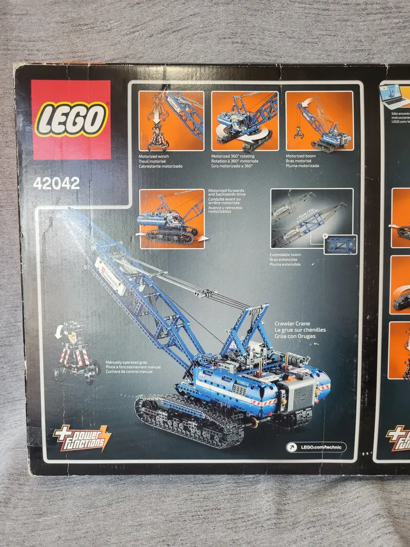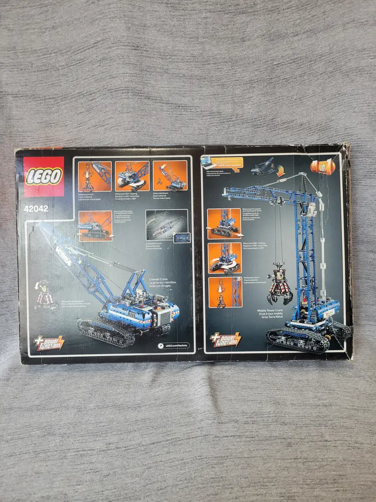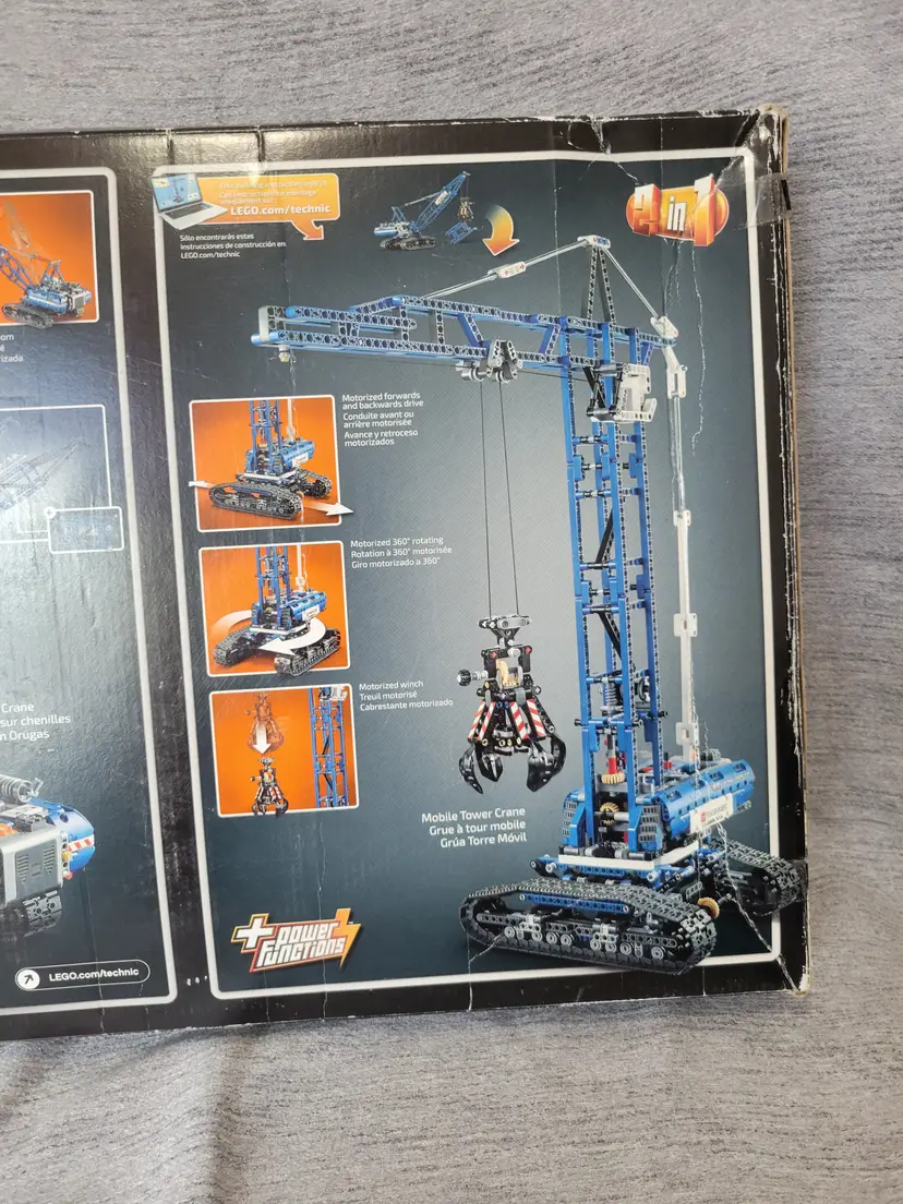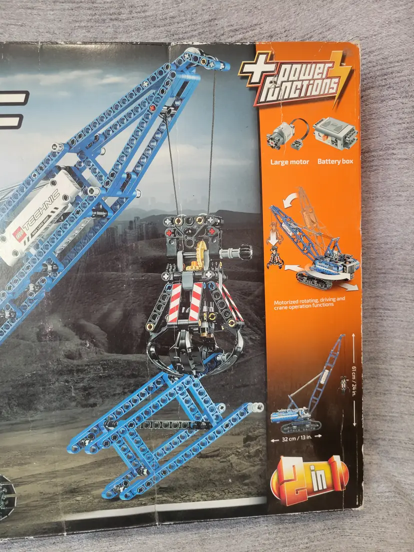Features Power Functions motorized boom, winch, superstructure and caterpillar tracks Also features an opening claw, tilting cab, extendable boom, extensive cabling and a realistic exhaust pipe and ventilation grid 2-in-1 model: rebuilds into a Mobile Tower Crane Crawler Crane measures over 24” (61cm) high, 13” (33cm) long and 7” (20cm) wide Mobile Tower Crane measures over 25” (64cm) high, 22” (56cm) long and 8” (22cm) wide