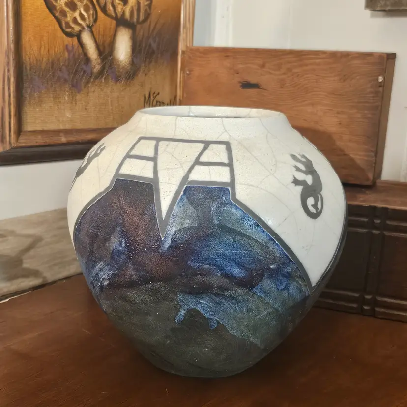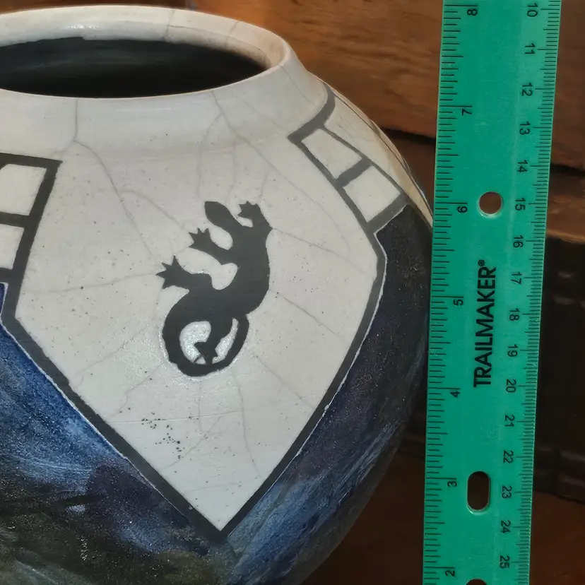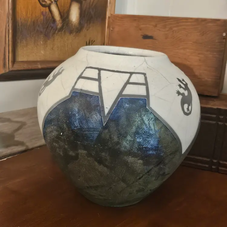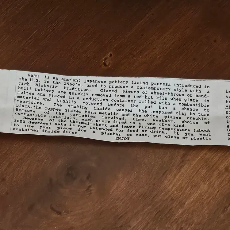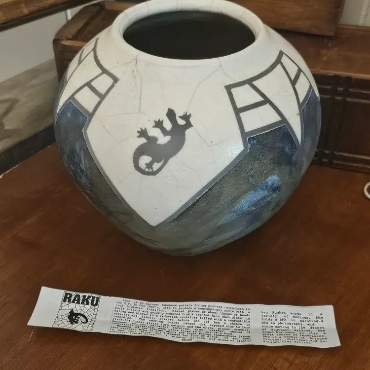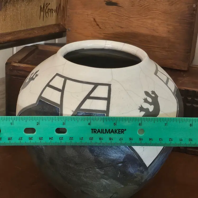 •Measures roughly 7.75" tall × 7" wide × 4" mouth width. •Has original paperwork/slip that came with it stating information about the artist and the piece/Raku. •Surface scratching to the base as shown. •Measurements photographed. •As shown & described in the live auction