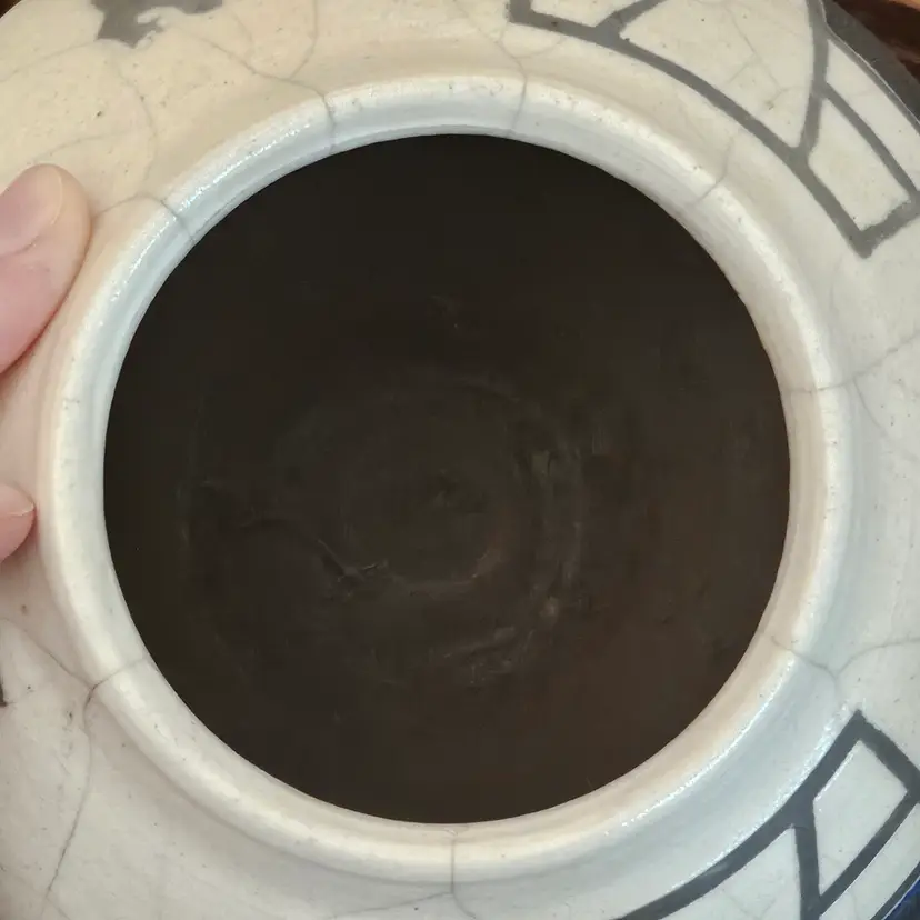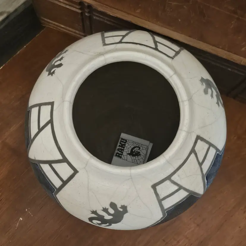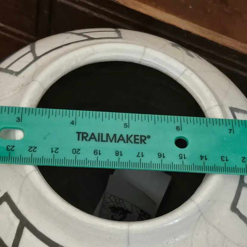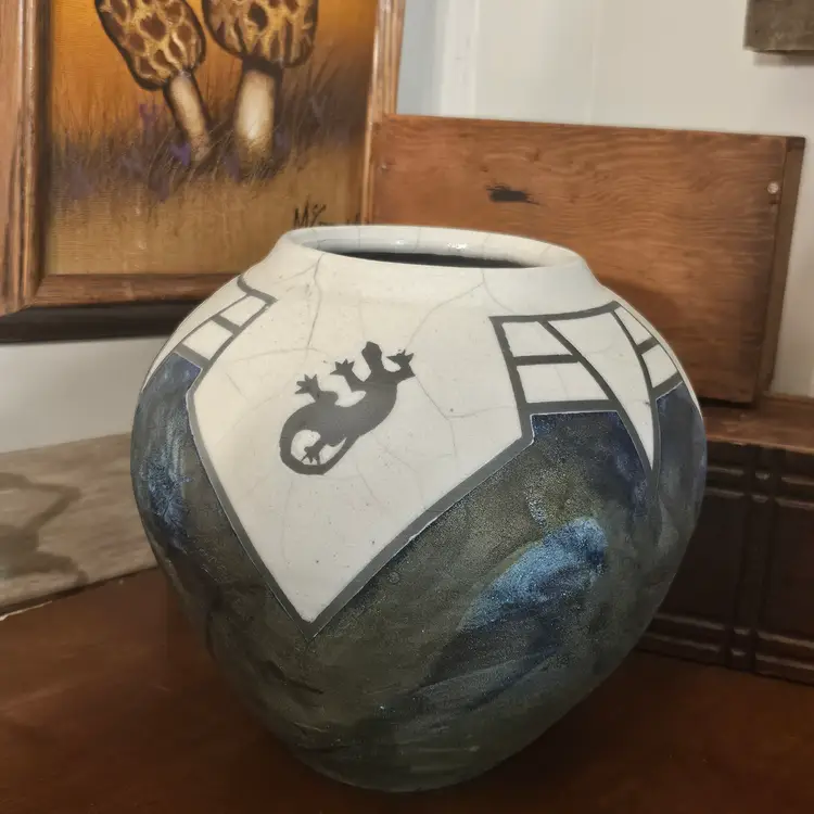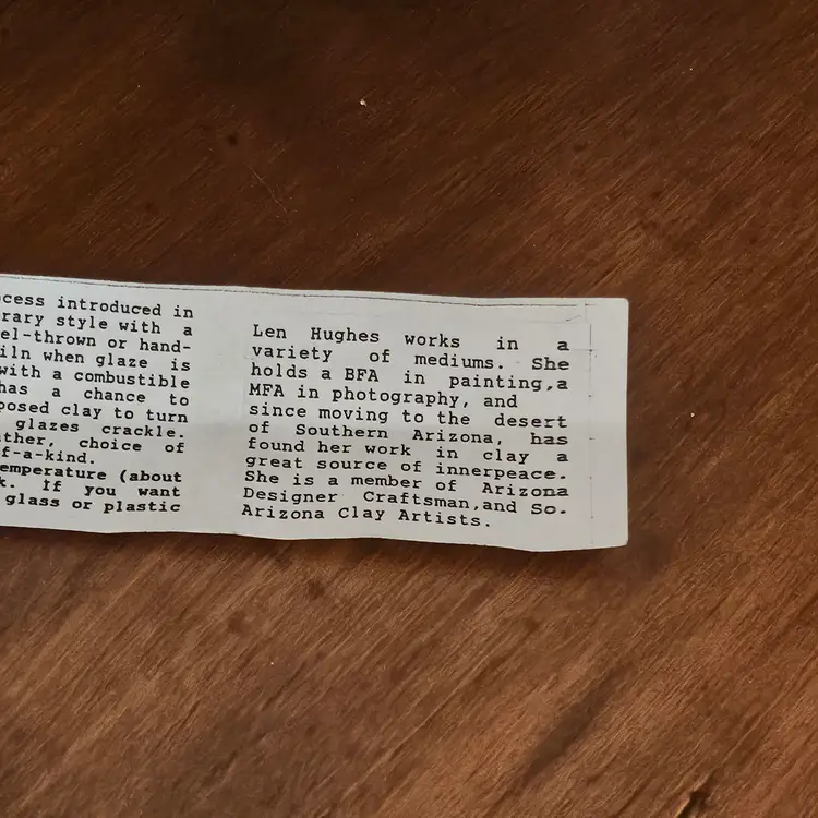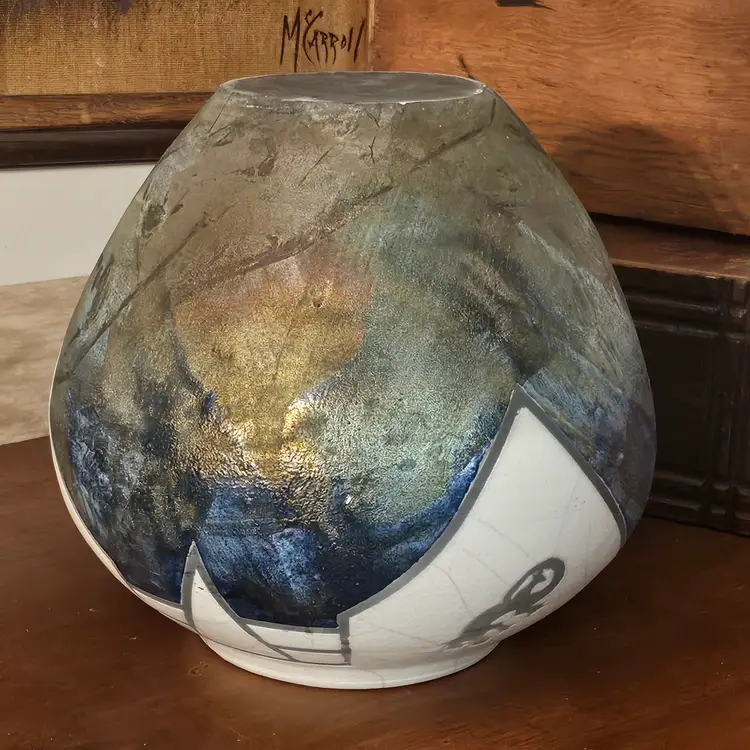 •Measures roughly 7.75" tall × 7" wide × 4" mouth width. •Has original paperwork/slip that came with it stating information about the artist and the piece/Raku. •Surface scratching to the base as shown. •Measurements photographed. •As shown & described in the live auction