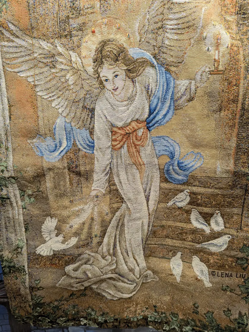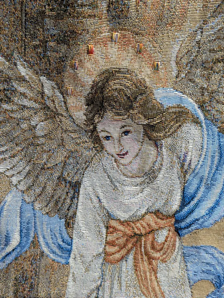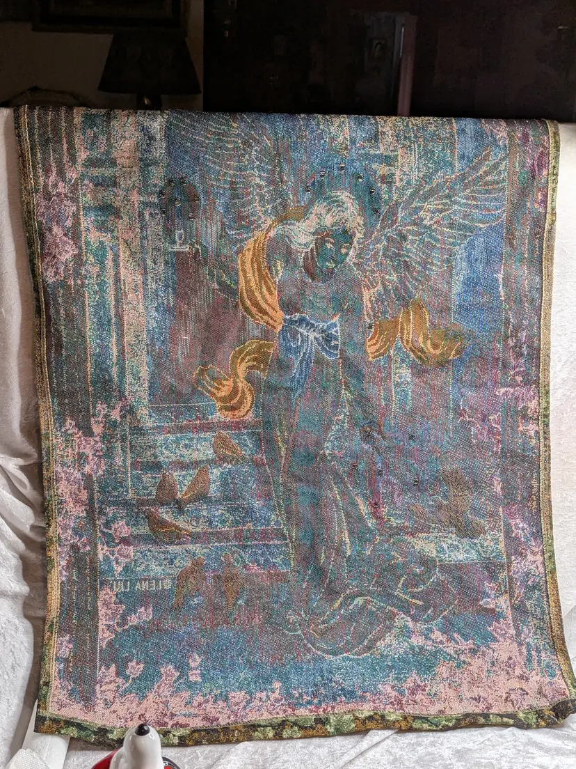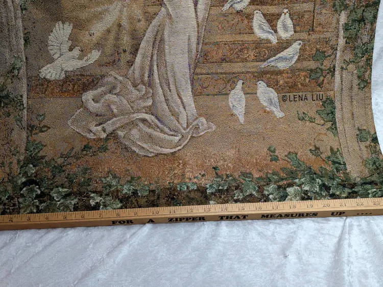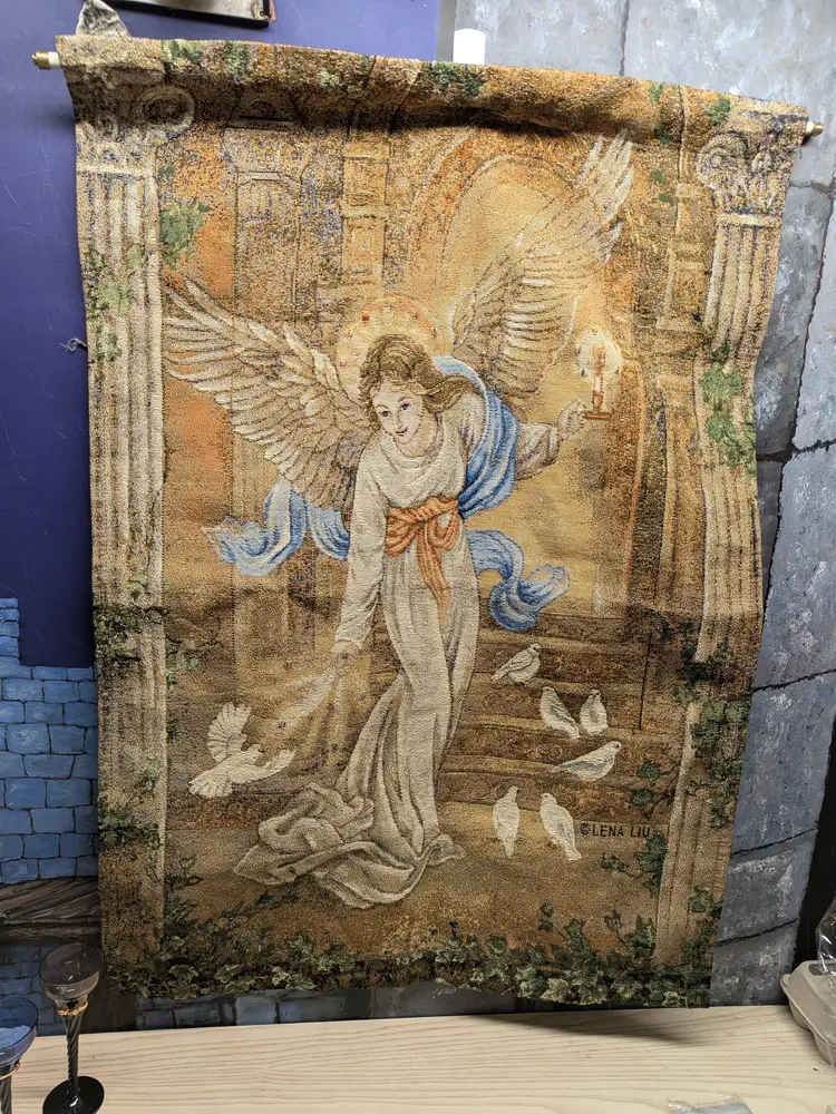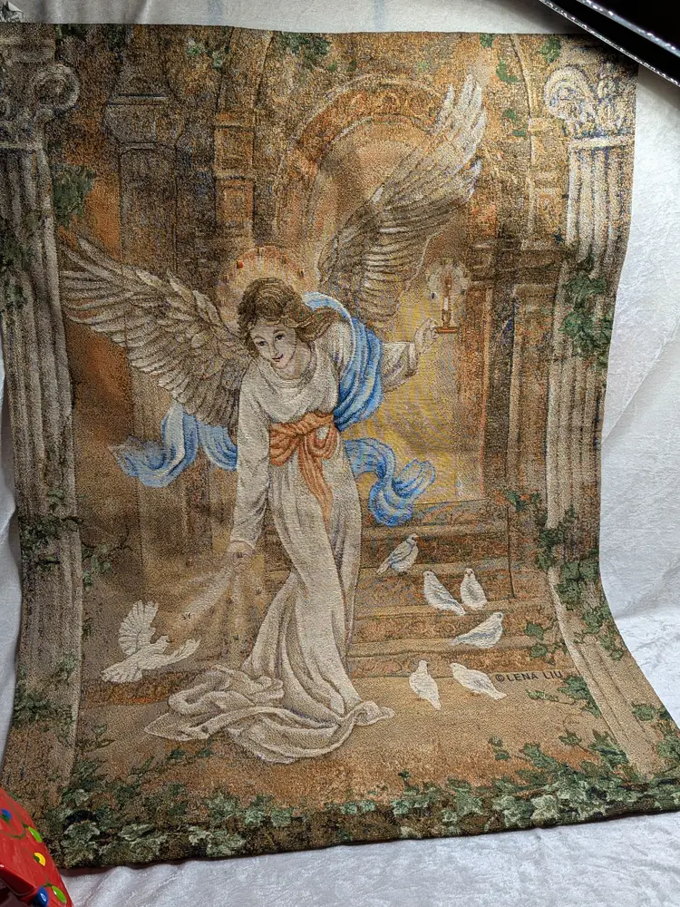Lena Liu "Angel of Light" Religious Wall Art Hanging Tapestry with white doves .It measures 25.5 x 36.5" Has a pocket on the top for a rod or it has a metal hanger on the back. It has holes where light can flow threw her wings if put in front of lights maybe string lights.I put and old curtain rod in the pocket to hang it up for the photo. Its not included. Made in USA Perfect for Castlecore or old World decor. Great condition Clean with no damage. no weird smells. Please check the photos for details. Comes from a smoke free home. We do have pets.