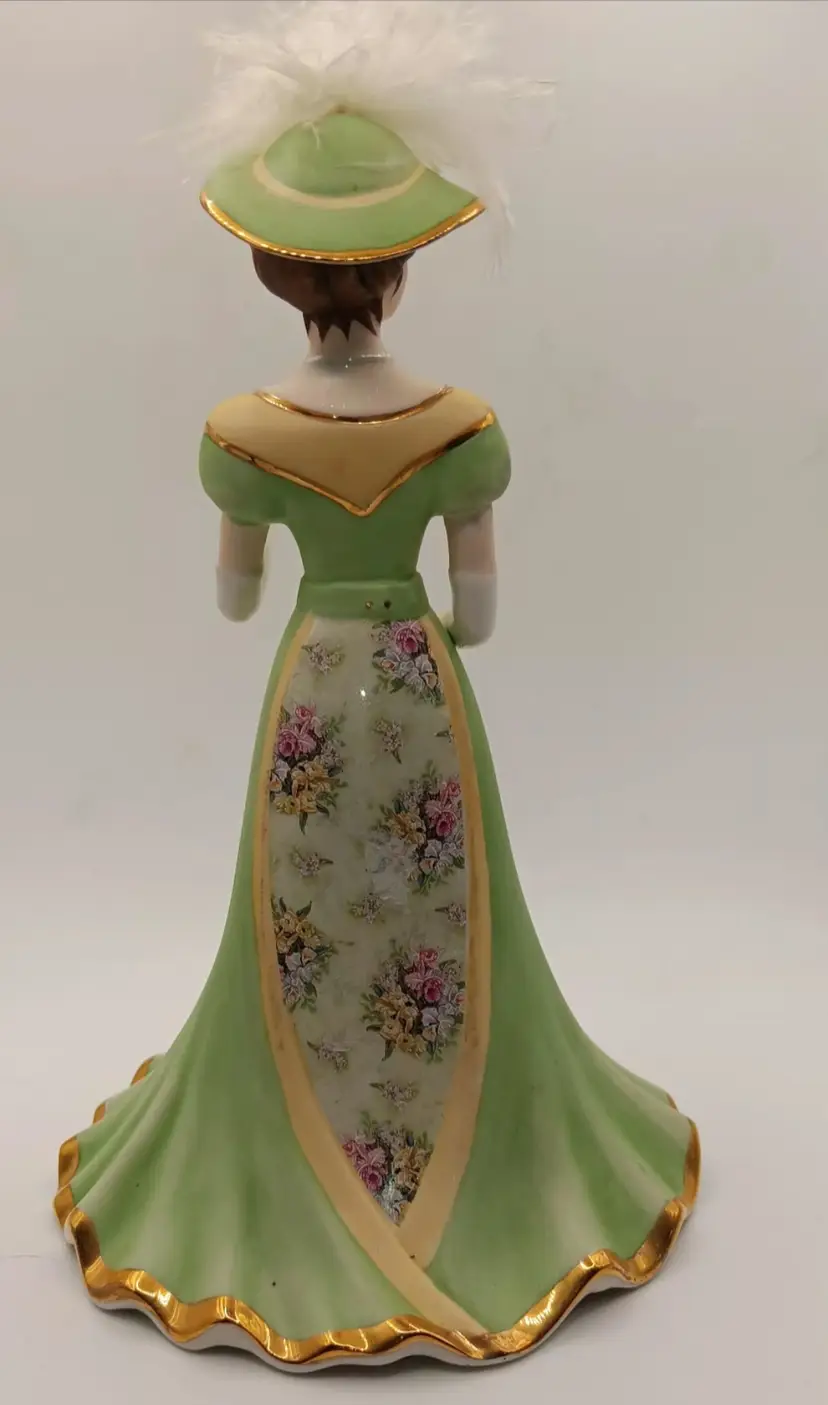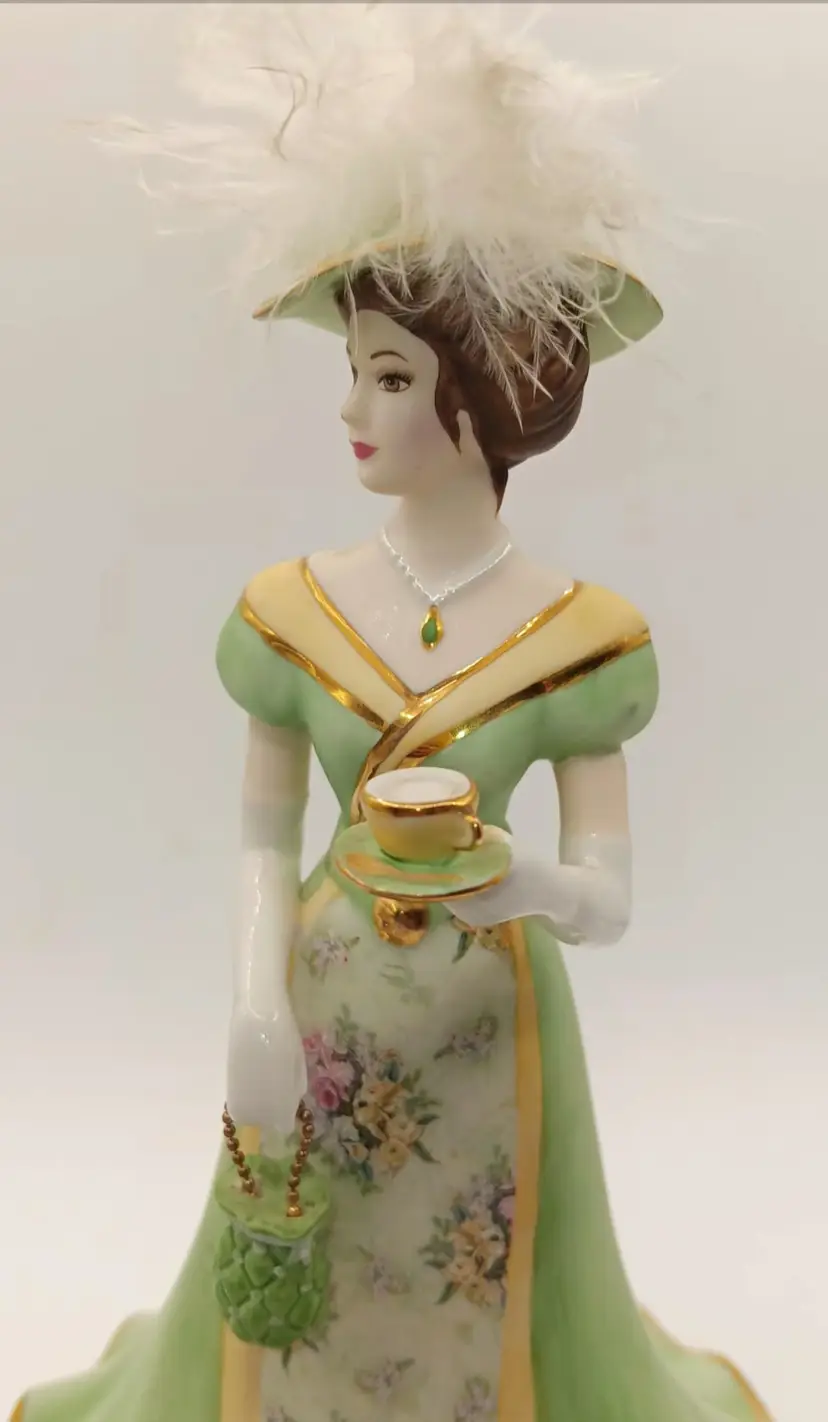 Elegant bell figurine. The details of her face to the purse and necklace are amazing. The feather on her hat to the teacup in her hand are stunning. Measuring 8" tall. No chips or cracks.