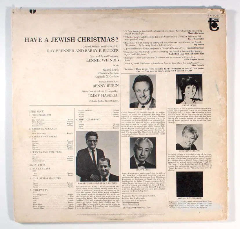 Have a Jewish Christmas...? is a comedic spoken-word album featuring comedian Lennie Weinrib as the narrator and primary performer, alongside vocalists Naomi Lewis, Christine Nelson, and the pseudonymous "Reginald X. Cuddlefuddles" (voiced by Arte Johnson of Rowan & Martin's Laugh-In fame). The album humorously explores the cultural clashes and absurdities faced by Jewish families attempting to partake in traditional Christmas celebrations, through skits and songs like The Problem, Christmas Cards, Christmas Trees, and Santa Claus Is Coming to Town? (Oy Vey!). Written by Ray Brenner and Barry E. Blitzer, it captures the ironic holiday experiences of American Jews in the mid-20th century, blending satire with festive tunes arranged by Jimmy Haskell and backed by the Jackie Ward Singers. Historically significant as one of the earliest recordings in the "Jewish Christmas" genre—a niche that later gained mainstream traction with Steve Allen’s 1960s specials and contemporary albums like A Kosher Christmas (2009)—it reflects post-WWII Jewish assimilation trends and the rise of ethnic humor in American entertainment. While the album did not produce chart-topping hit singles, its enduring cult appeal has kept it a holiday staple among collectors and fans of vintage comedy vinyl.