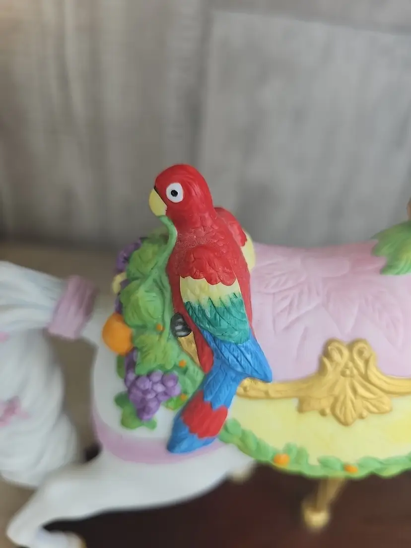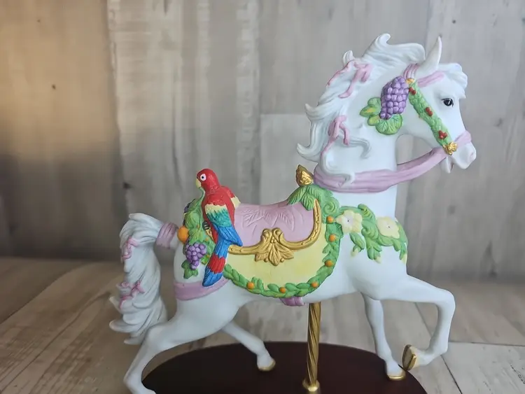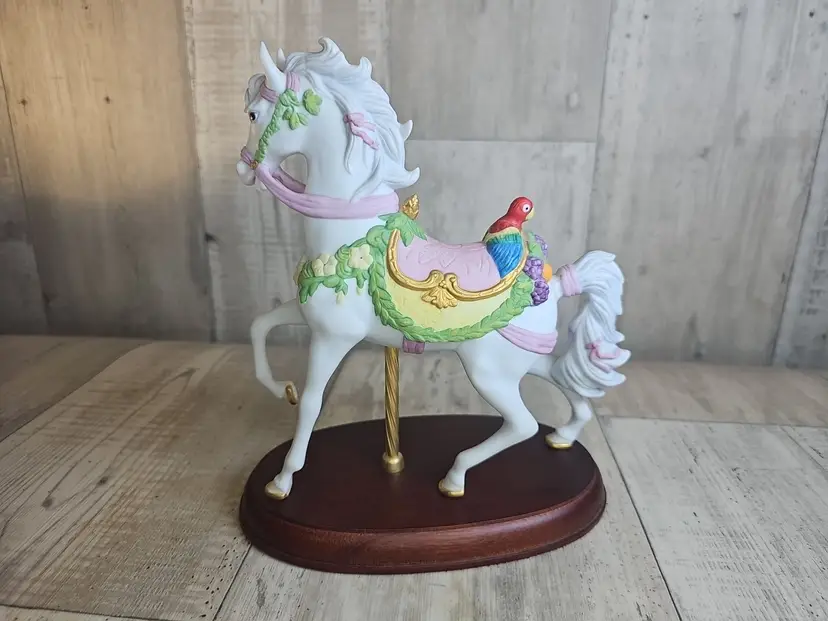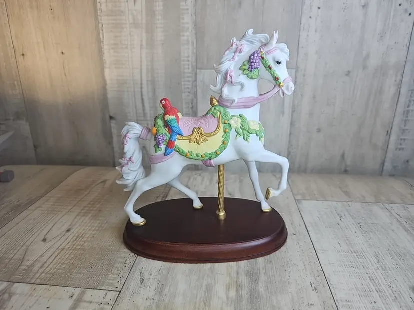 Tags Lenox carousel horse, Lenox 1992 tropical horse, Lenox porcelain figurine, carousel collection, Lenox parrot horse, vintage Lenox collectible, mounted carousel horse, decorative porcelain horse, Lenox annual issue