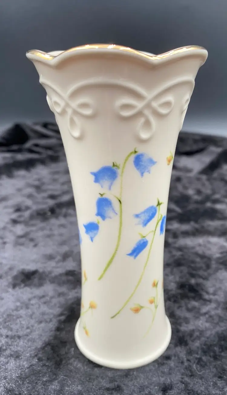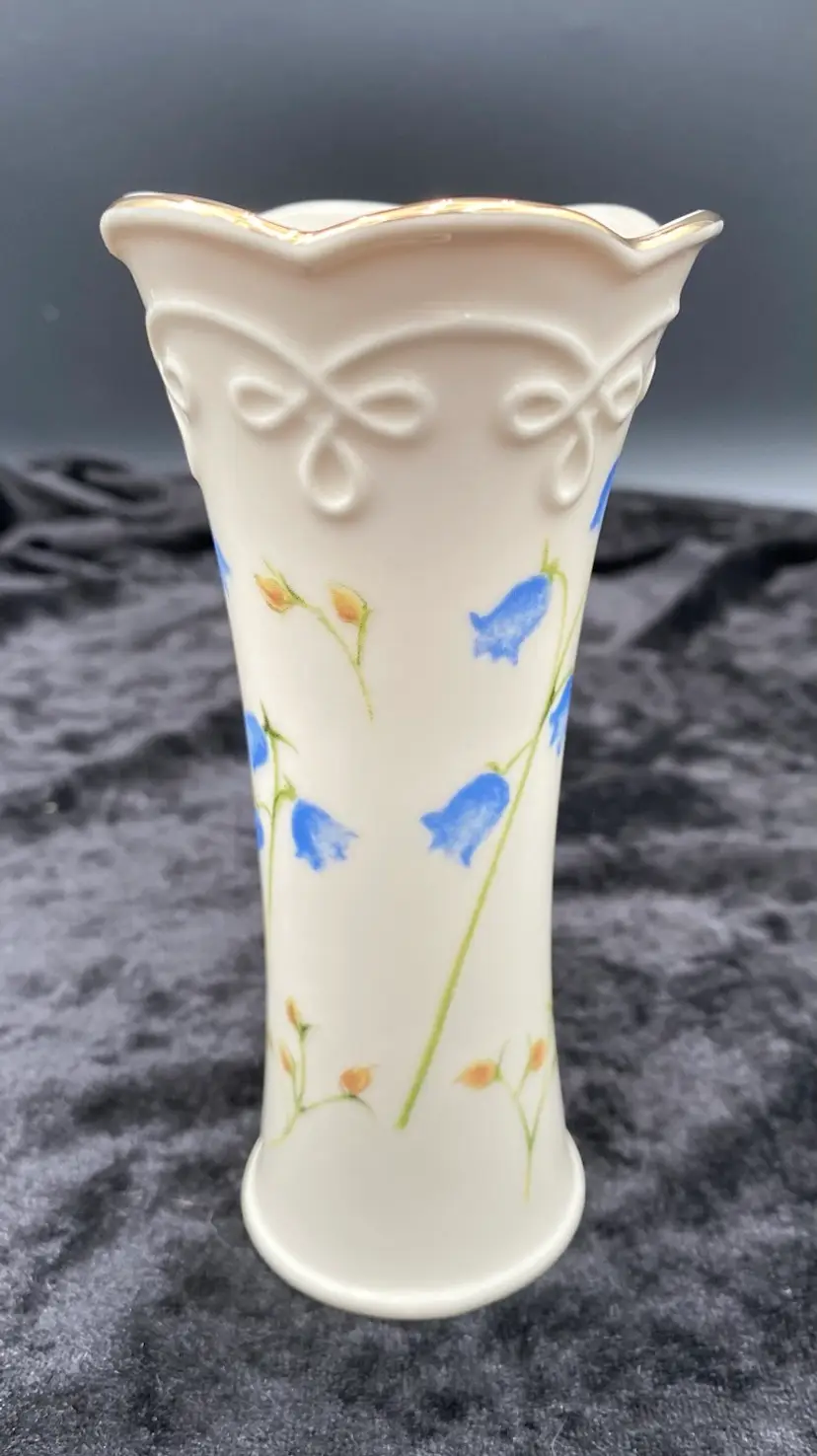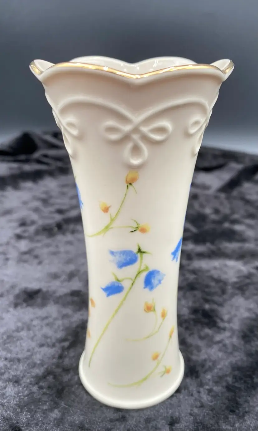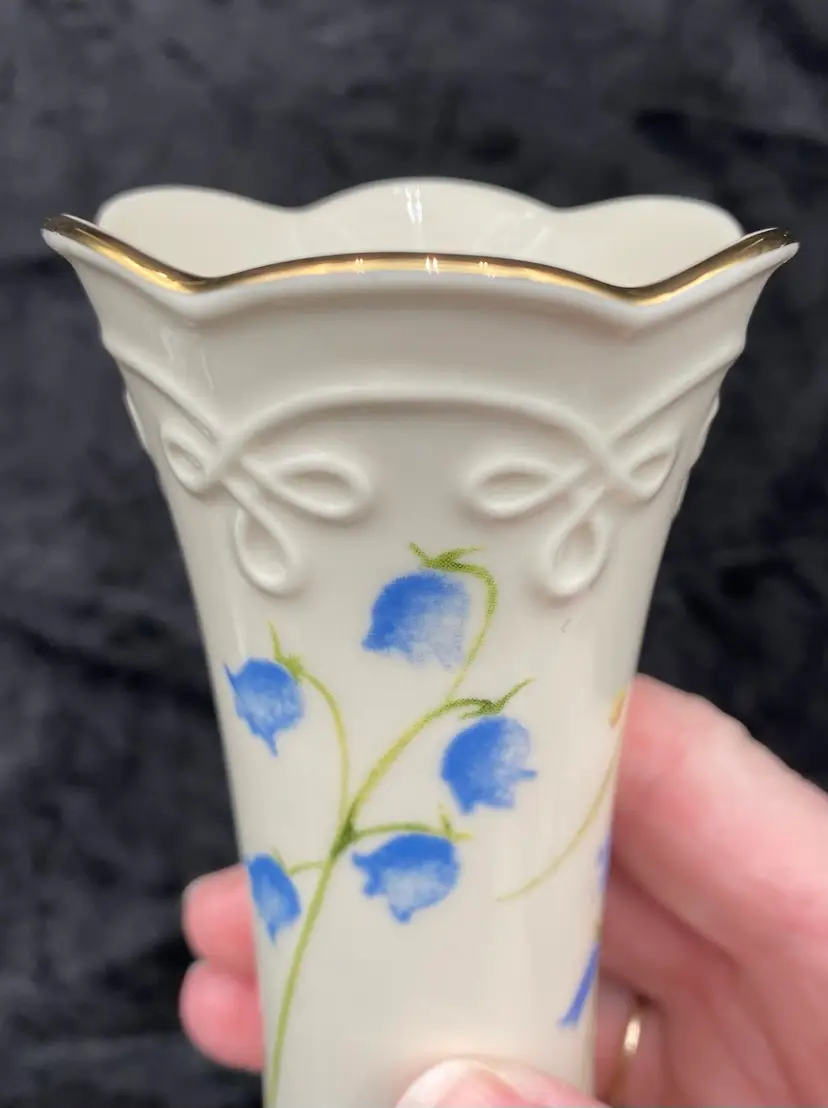 This Lenox bud vase features a charming floral pattern of bluebells and tea roses with a lustrous gold trim on the rim. The vase's embossed swirls add a touch of elegance, complementing its glossy finish. At 5 inches tall and 2.5 inches wide, this medium-sized porcelain piece is perfect for showcasing your favorite blooms on any occasion. Crafted in the late 20th century, this original vase boasts a tulip shape that gracefully narrows from an opening of 2.5 inches to a base width of 1.8 inches, giving it a balanced and satisfying proportion. It weight 4 ounces. It's a versatile addition to your collection, suitable for both casual and formal settings.