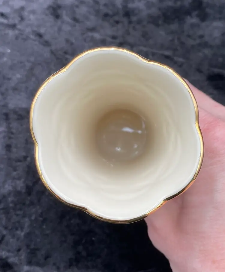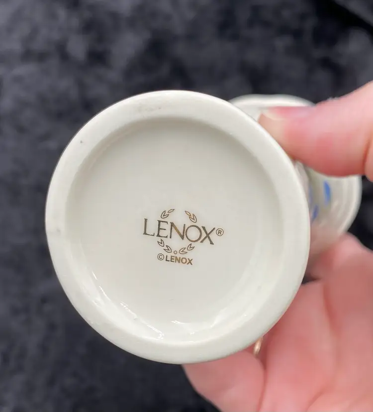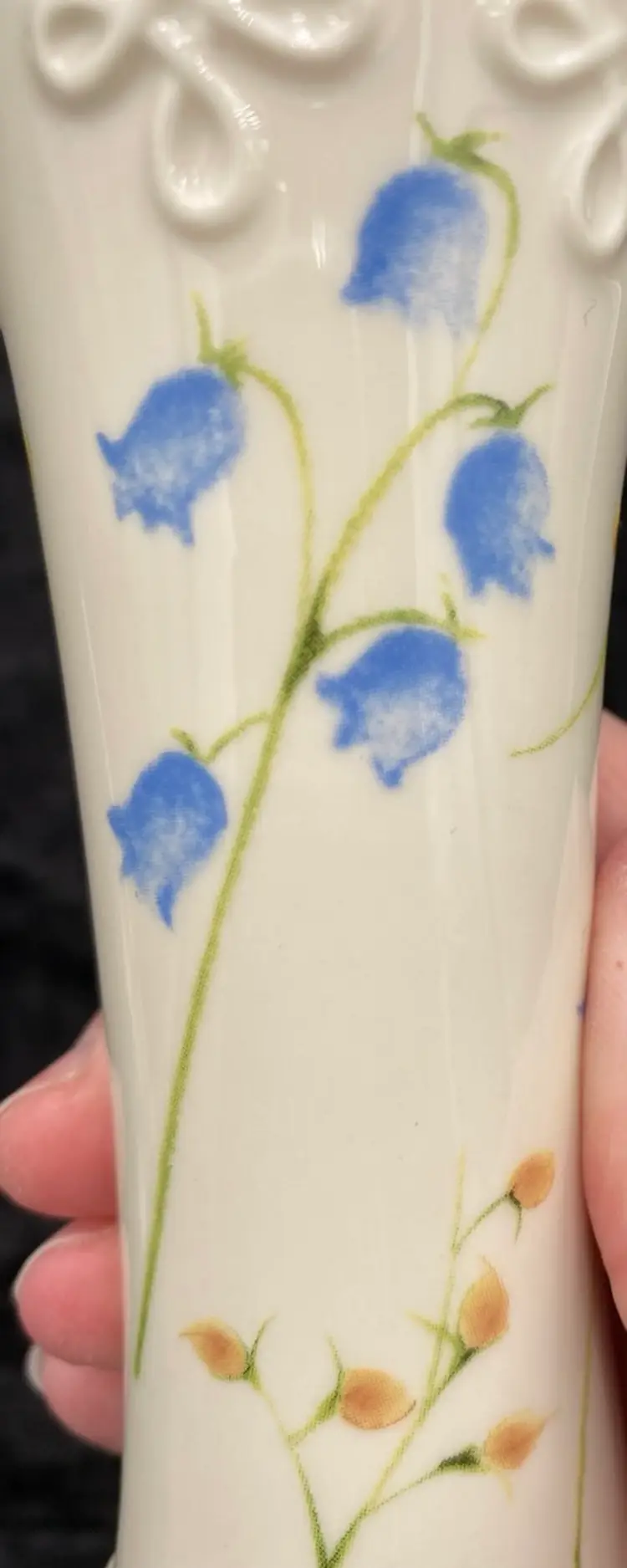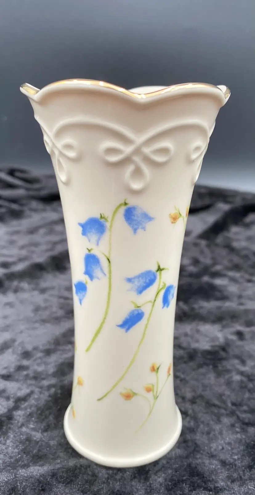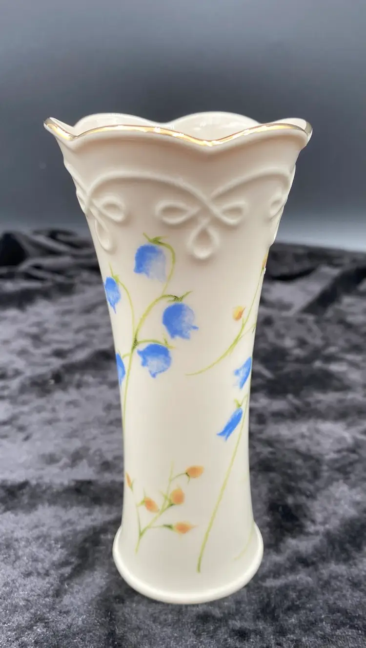 This Lenox bud vase features a charming floral pattern of bluebells and tea roses with a lustrous gold trim on the rim. The vase's embossed swirls add a touch of elegance, complementing its glossy finish. At 5 inches tall and 2.5 inches wide, this medium-sized porcelain piece is perfect for showcasing your favorite blooms on any occasion. Crafted in the late 20th century, this original vase boasts a tulip shape that gracefully narrows from an opening of 2.5 inches to a base width of 1.8 inches, giving it a balanced and satisfying proportion. It weight 4 ounces. It's a versatile addition to your collection, suitable for both casual and formal settings.