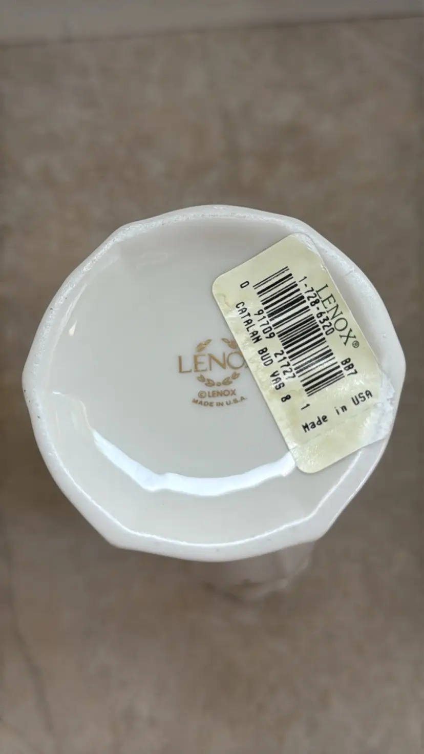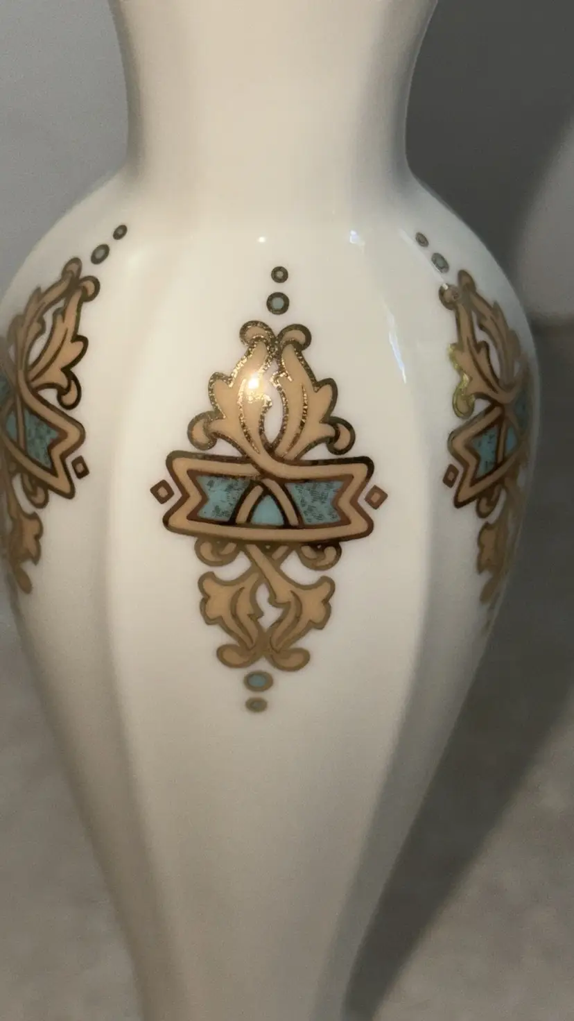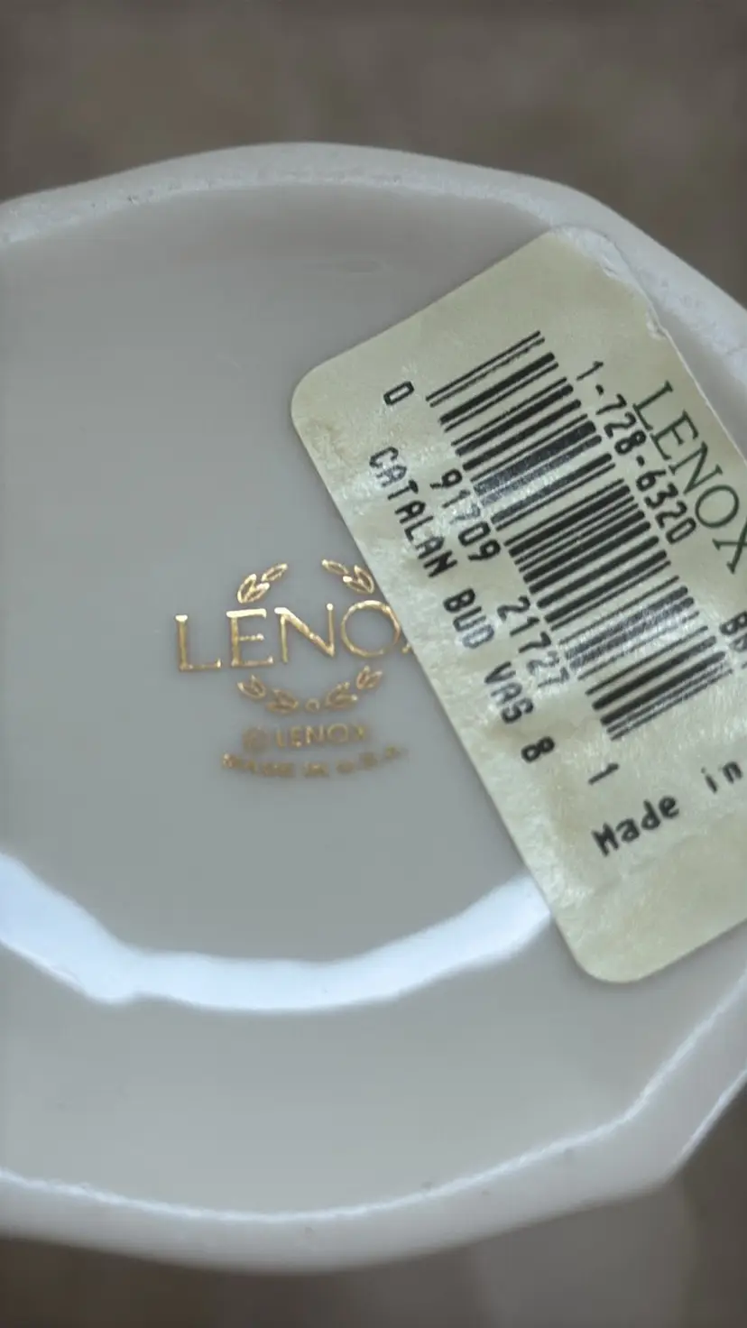Lenox Catalan 24k gold trim green scrolls Art Nouveau 8” tall vase Made in USA The Lenox vase showcases exquisite gold accents on a creamy backdrop, creating a refined and timeless aesthetic. Its elegant design, with a narrow neck and flared top, is perfect for adding a touch of sophistication to any space. Excellent like new condition with no breaks or chips (69371259)