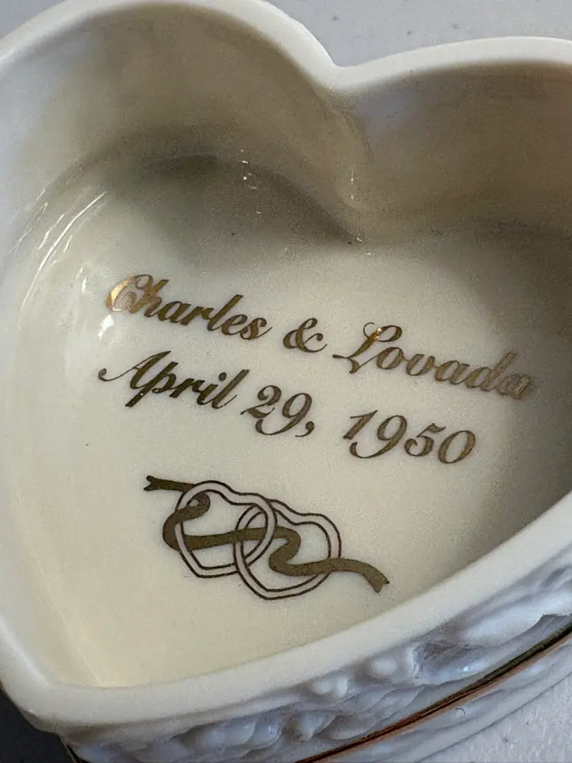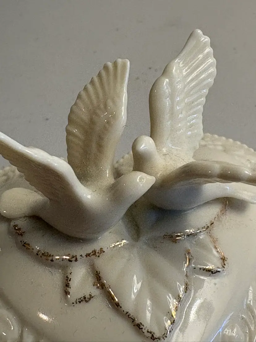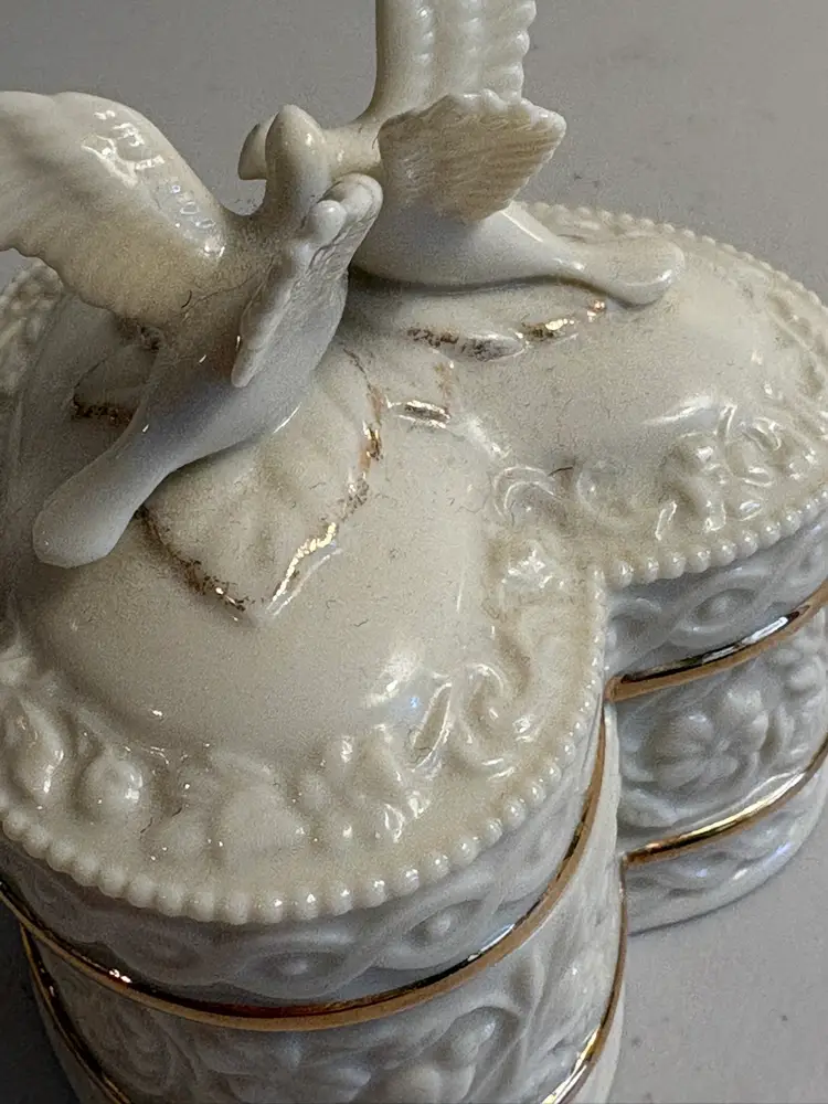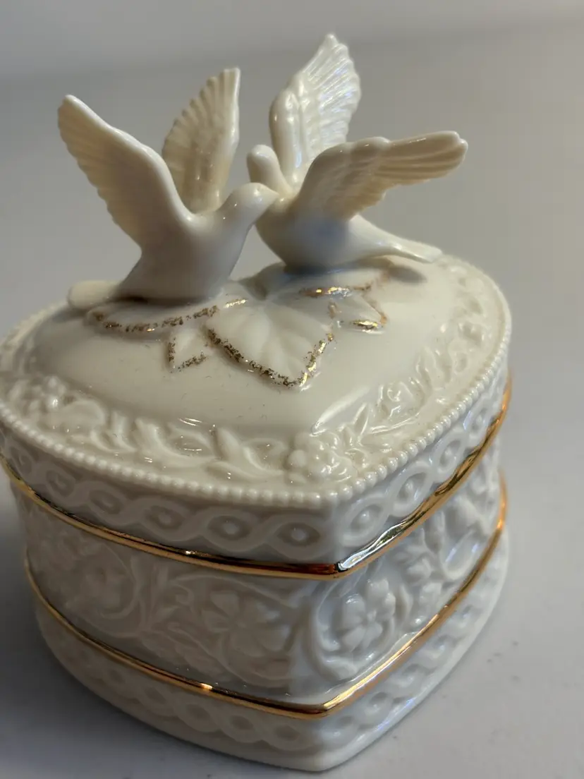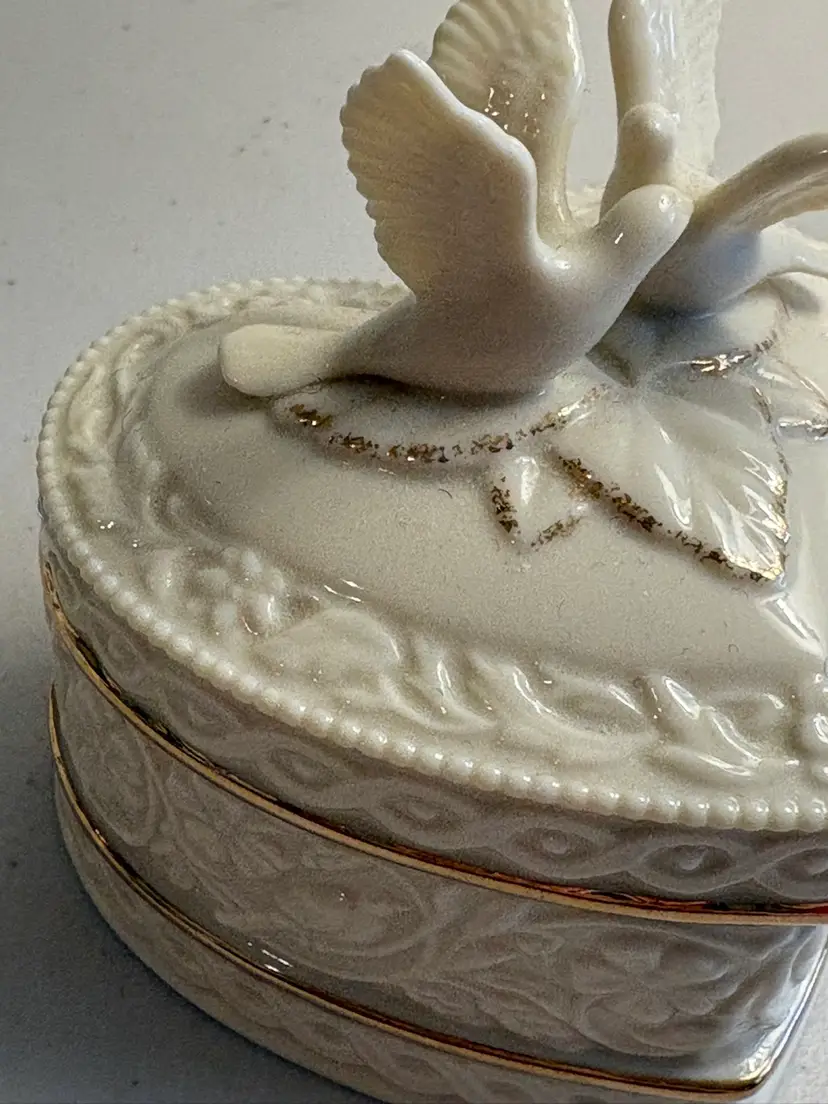 The Lenox Celebrate a Moment Wings of Love Trinket Jewelry Heart Box is a beautifully crafted porcelain trinket box in the shape of a heart, featuring a glossy finish and a theme of love birds. Perfect for Valentines Day or anniversary. Great for storing small treasures or jewelry, this trinket box is a romantic and elegant addition to any collection. Packaged in a box, it makes a lovely gift for a loved one or a lovely treat for yourself.