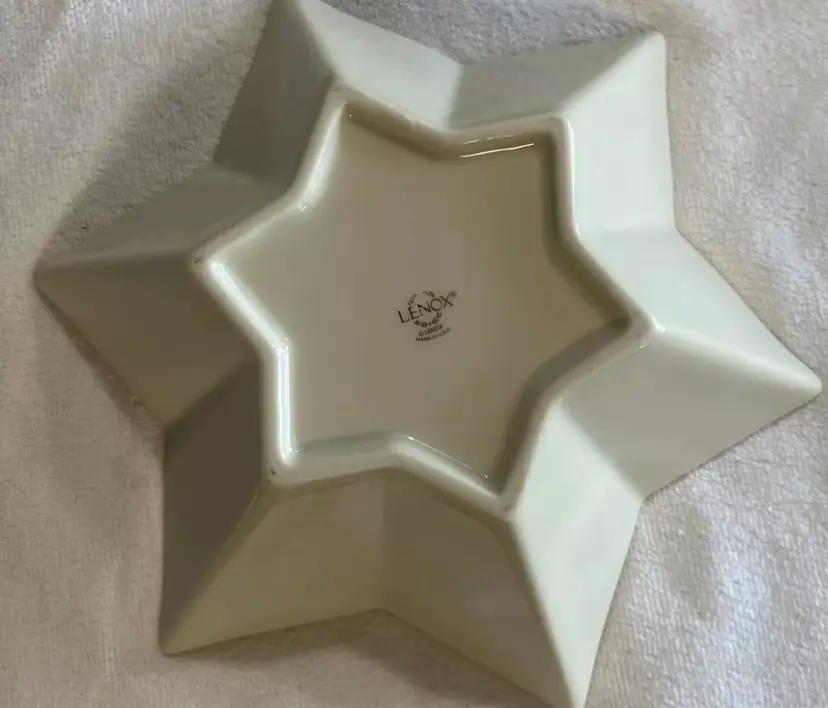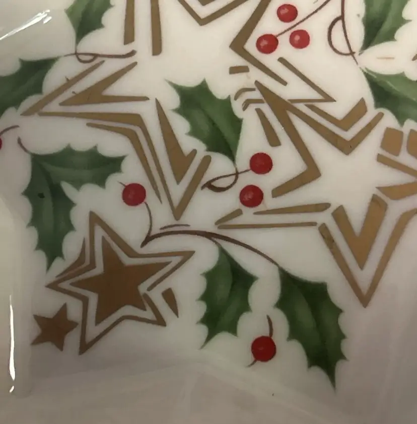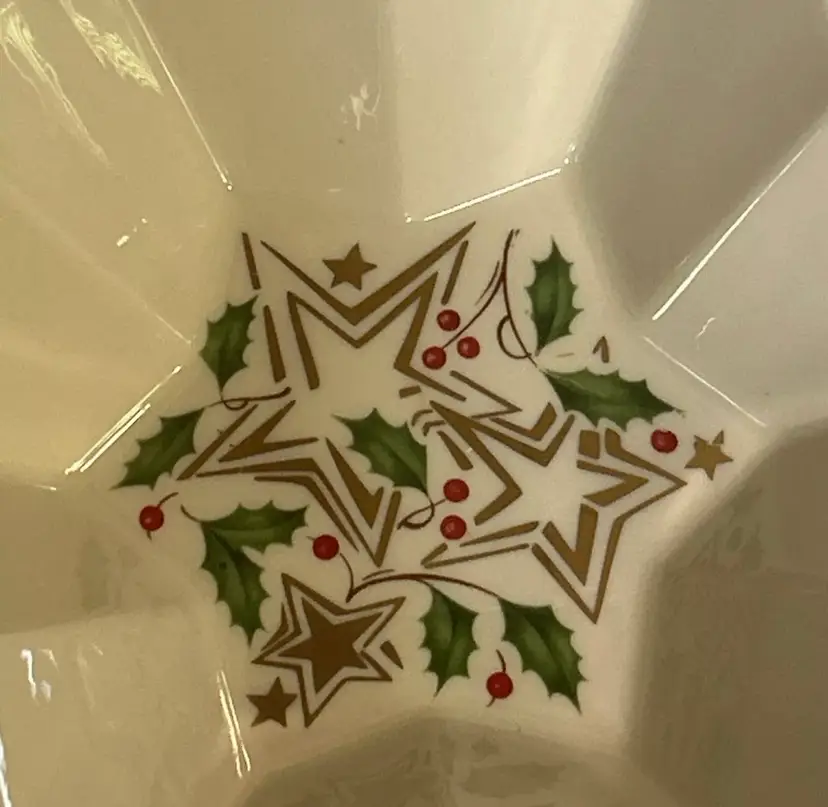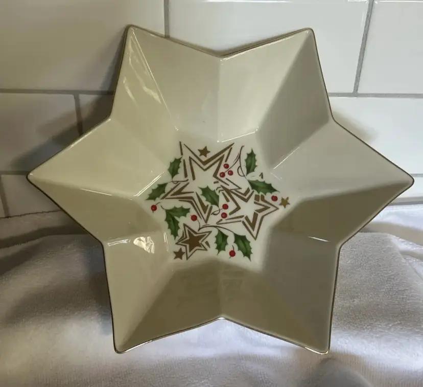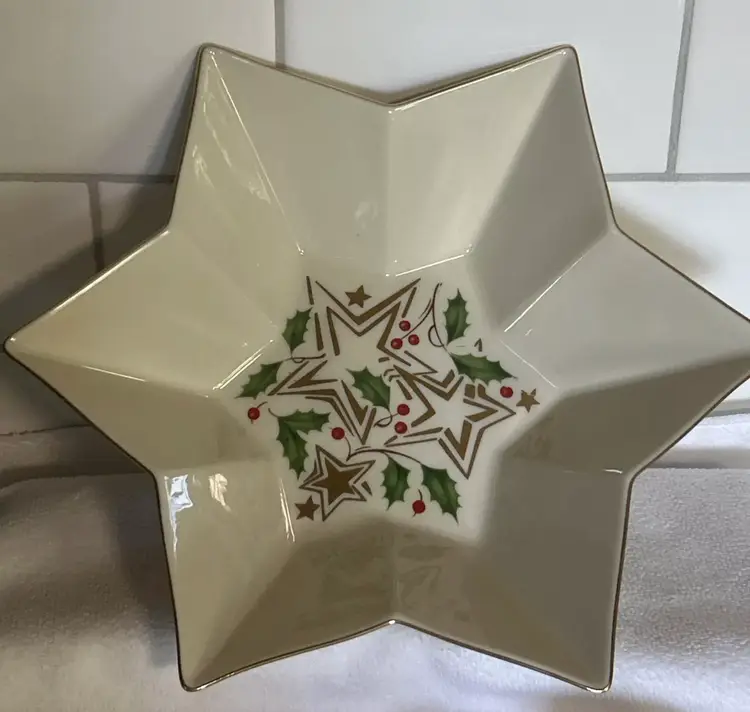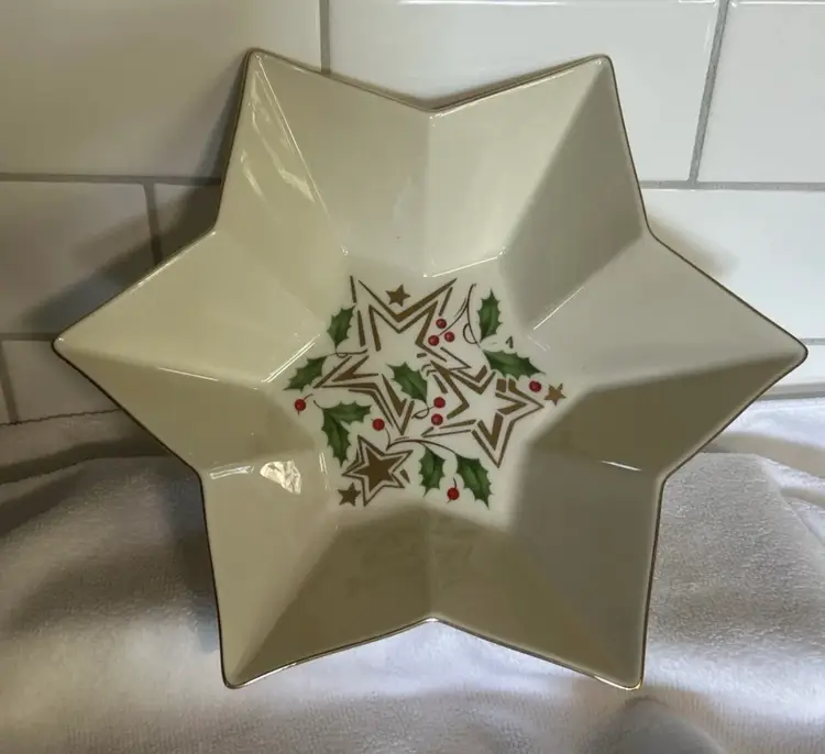 This Lenox Christmas Brightest Star Serving Bowl will add so much elegance to your table throughout the holiday Christmas season. The glossy finish and star-shaped design make it a center of attraction for your dining room. Made of porcelain, this bowl is 11" in diameter and 2.75" inches in depth making it perfect for your family favorite Christmas cookies or candies. The bowl features the quintessential Christmas Holly and berries with gold stars as the theme, making it ideal for Christmas occasions. This serving bowl is perfect as a centerpiece in your dining table or entryway filled with all the wonderful Christmas treats. This beautiful Lenox bowl is in excellent preowned condition with NO chips, cracks or scratches. Please review all pictures for proper assessment of its excellent preowned condition.