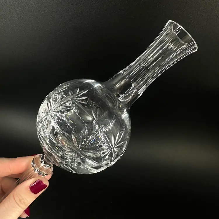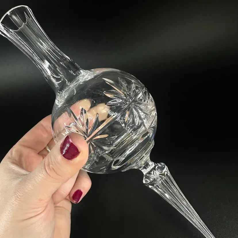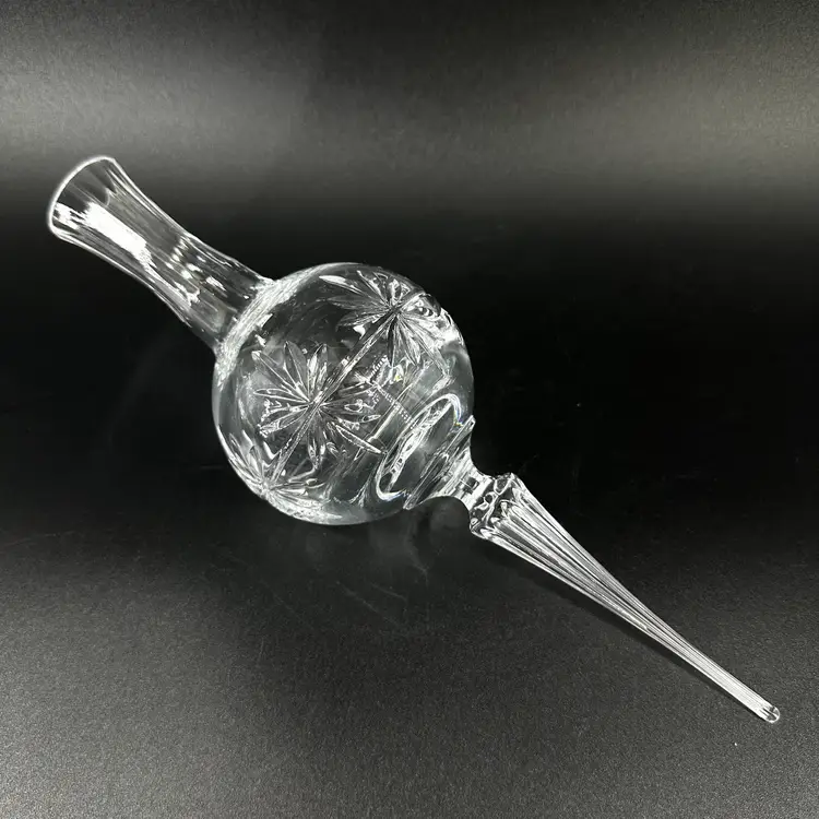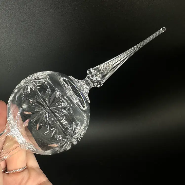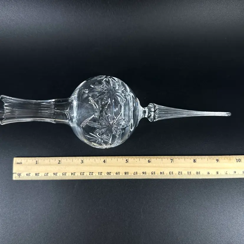 This Lenox crystal tree topper is signed “Lenox” on it. There are no chips or cracks anywhere. The length is approximately 10”. Has like a star pattern all around the ball with a like going through them.