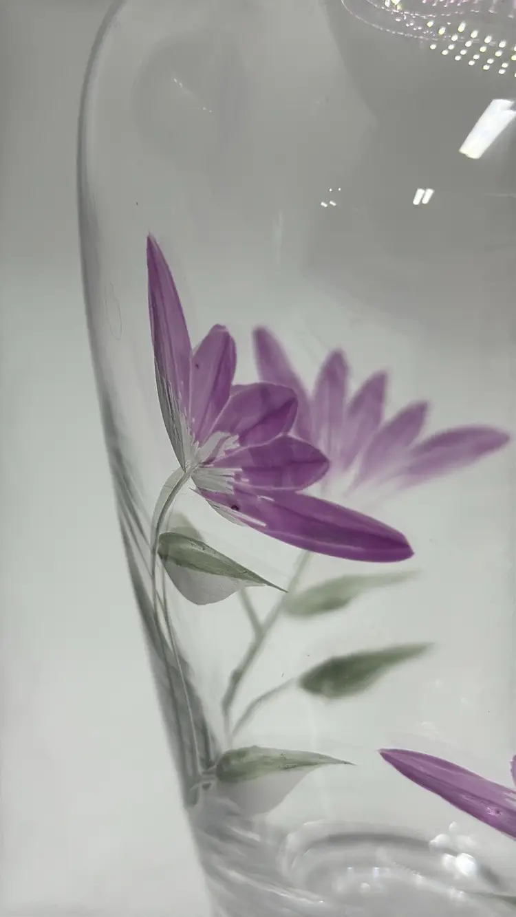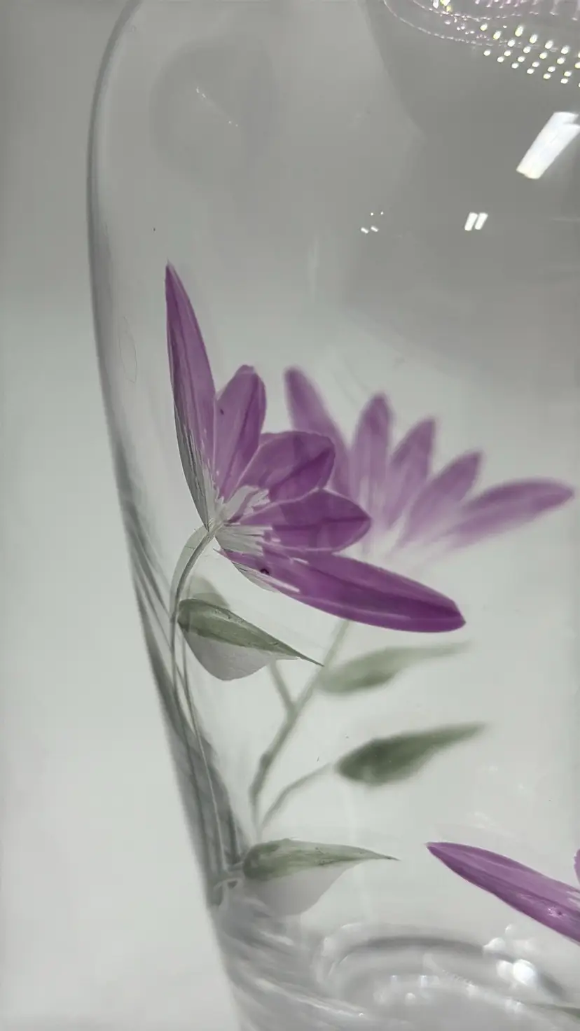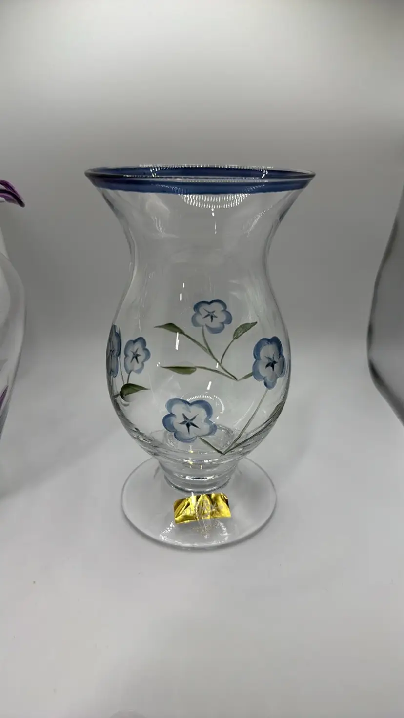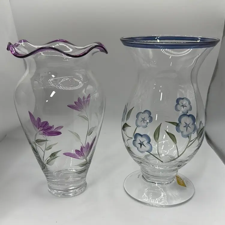 Enhance your home decor with this elegant set of glass vases featuring beautiful purple and blue floral designs. Perfect for adding a touch of sophistication to any room. Lenox Floral Spirit Crystal Vase Hand Cut & Painted Purple Lavender Flowers and blue flowers Both are 6” tall Both are in excellent condition with no breaks or chips (557520154)