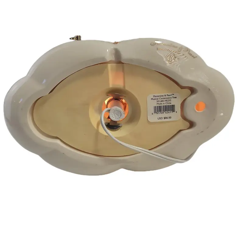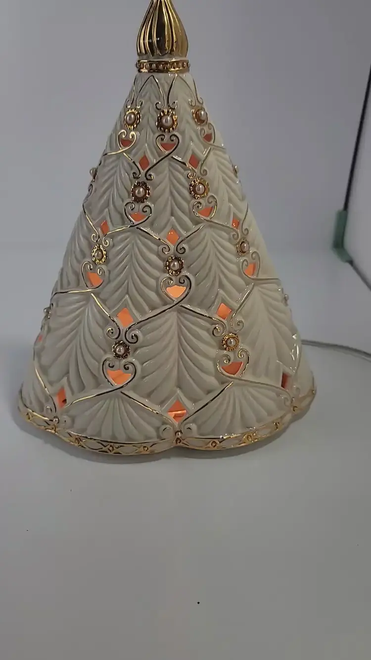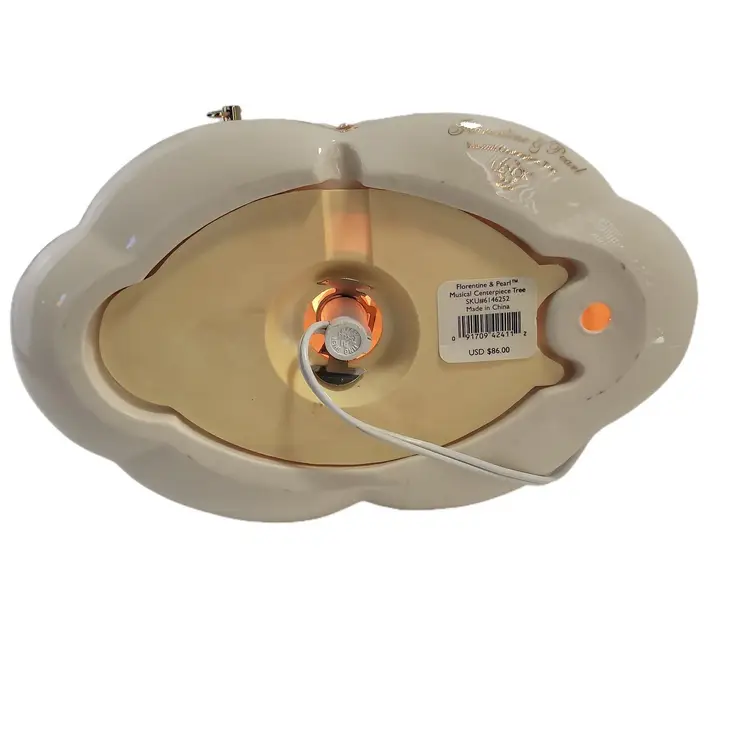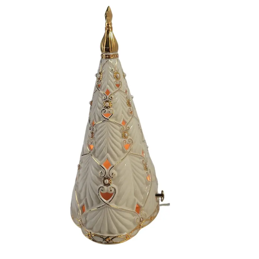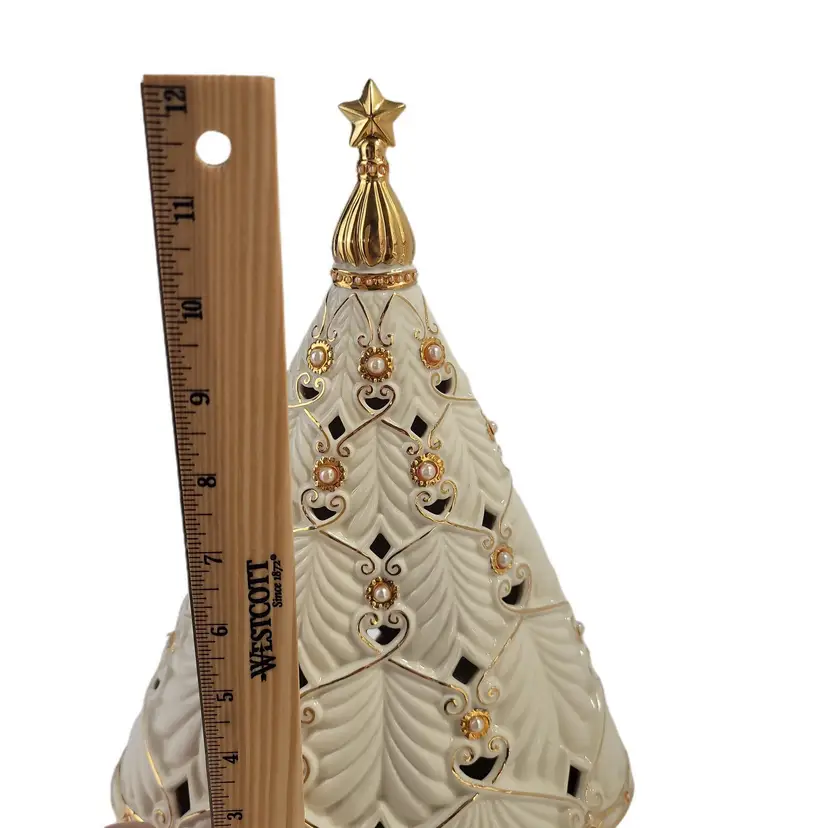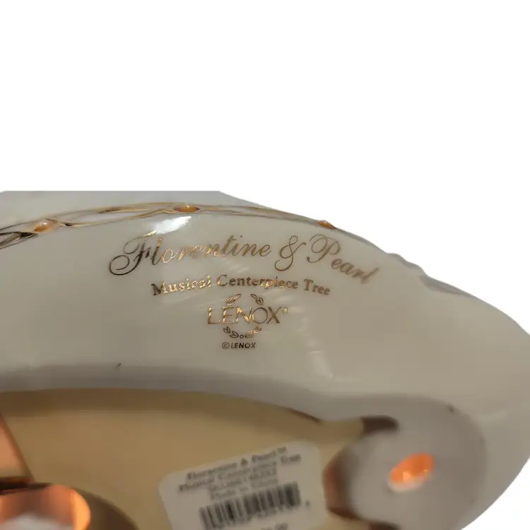 Lenox rare florentine and pearl musical centerpiece christmas tree with lights plays oh christmas tree SKU NO. 6146252. this style has the gold star topper. This Pre-Owned tree plugs into the wall measures 12" tall does not come with orignal box or packaging.