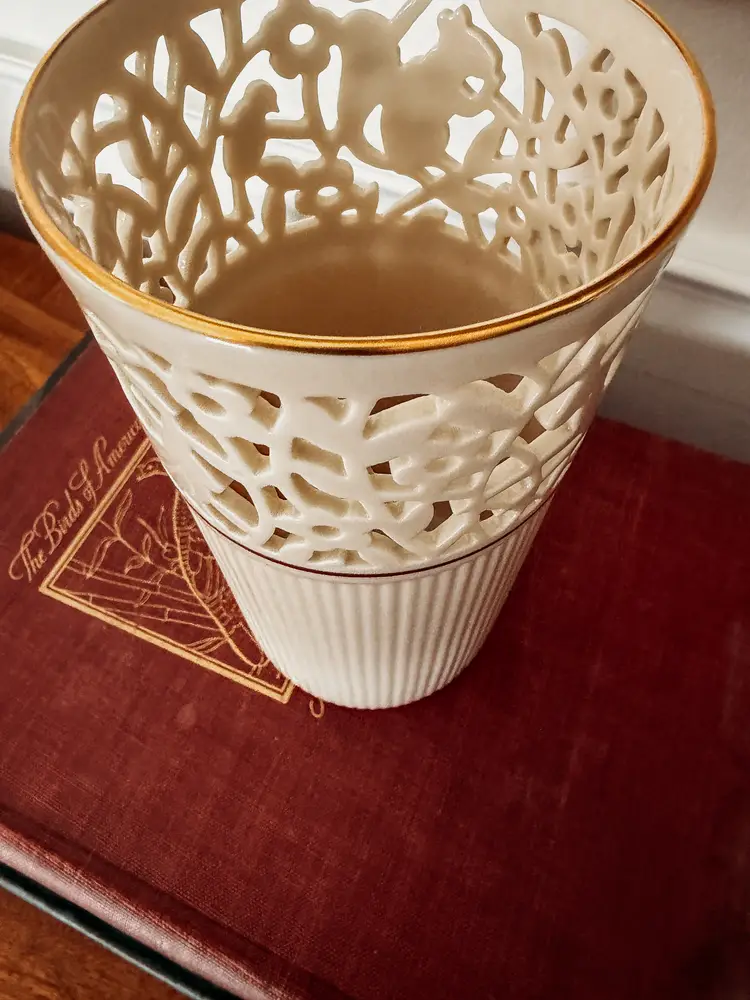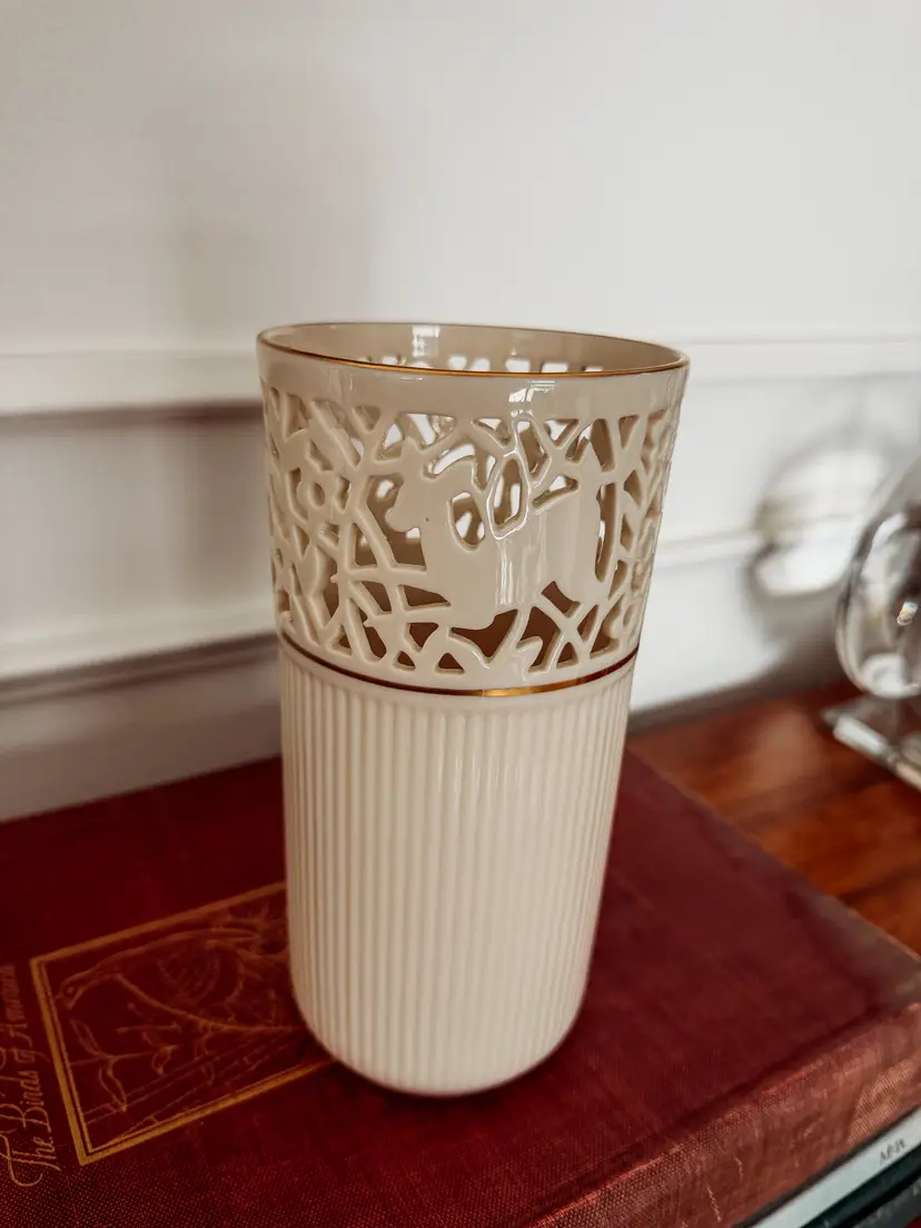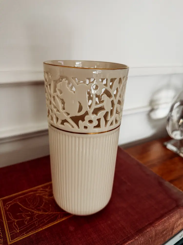 A stunning statement piece! Fine ivory china, hand-trimmed with 24 karat gold. Vase dates from the mid 1980s. In excellent condition - There are no chips or cracks