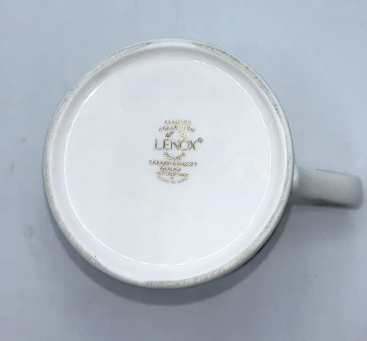 Brand: Lenox Pattern: Floral Type: Coffee Mug Care Instructions: Machine Washable up to 85°F Occasion: All Occasions Original/Licensed Reproduction: Original Color: Black Item Height: 3.5" Material: Bone China Country/Region of Manufacture: United States