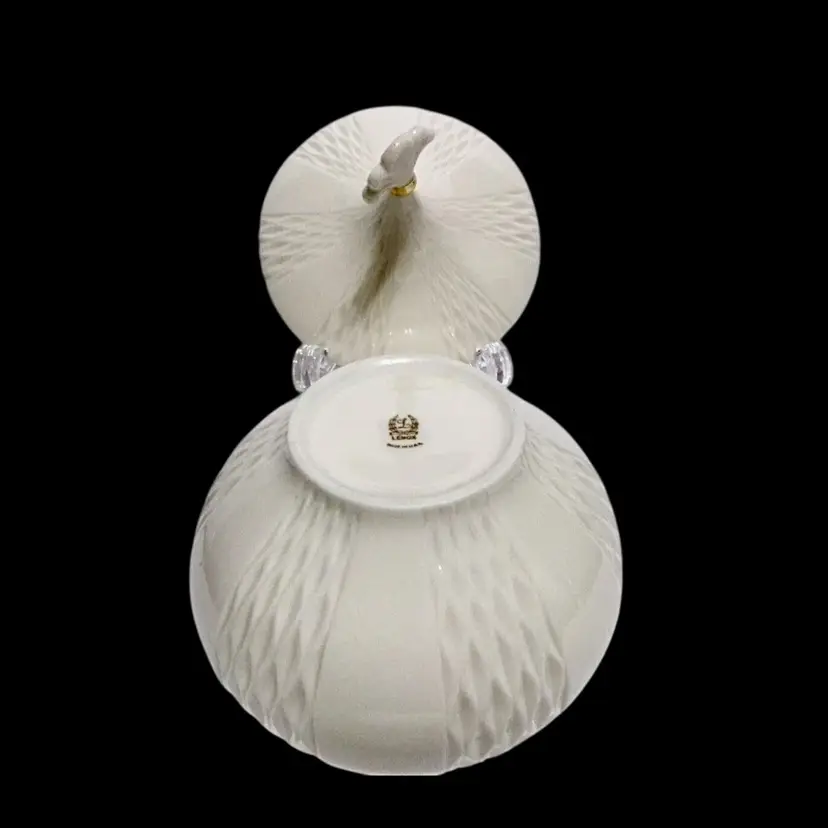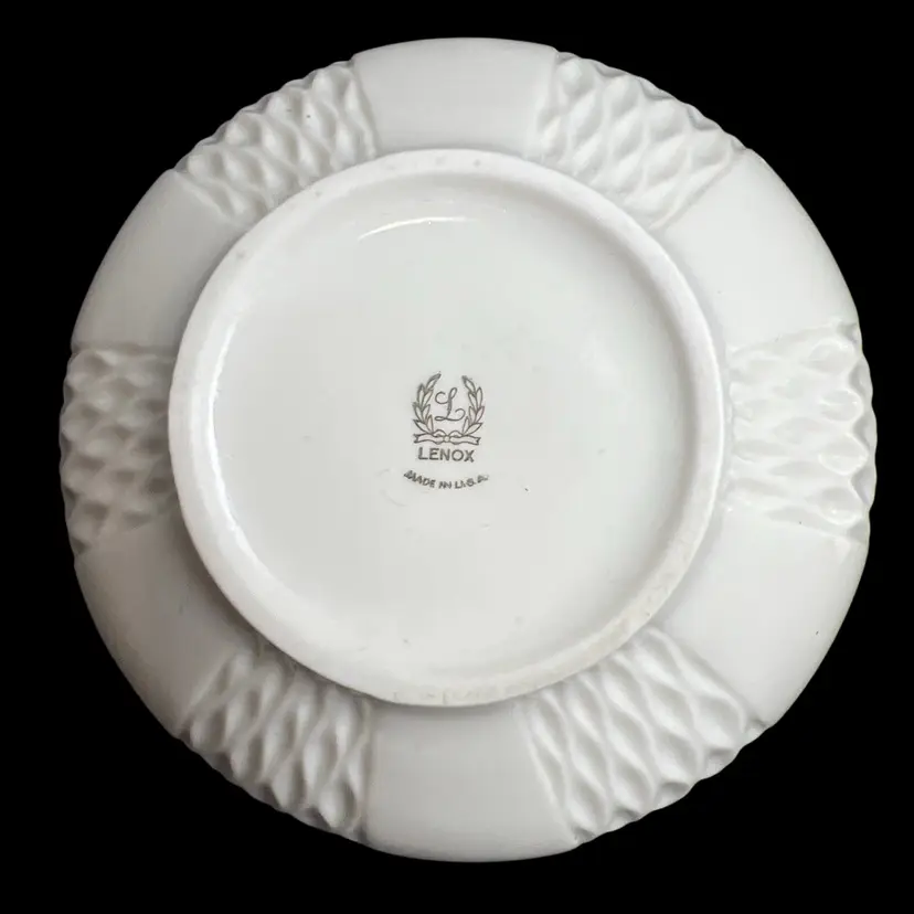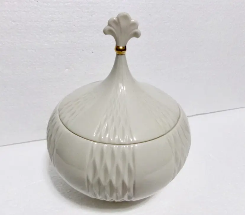 • Beautiful Round Jar/Bowl with Lid • Made by Lenox, USA • Hand Painted 24 Karat Gold Accent on Lid • Ivory/Cream Colored Porcelain • Flat Base, Embossed Wave Pattern • Approx. 5.75" Diameter x 7" Tall • Excellent Vintage Condition • Perfect for Candy, Nuts, Keys, Trinkets.