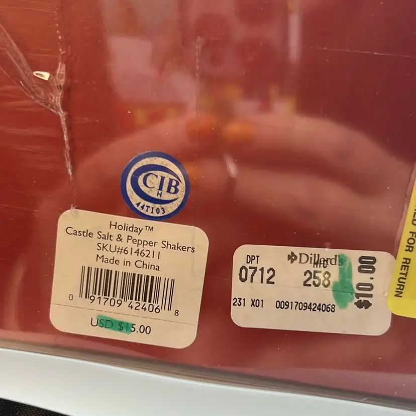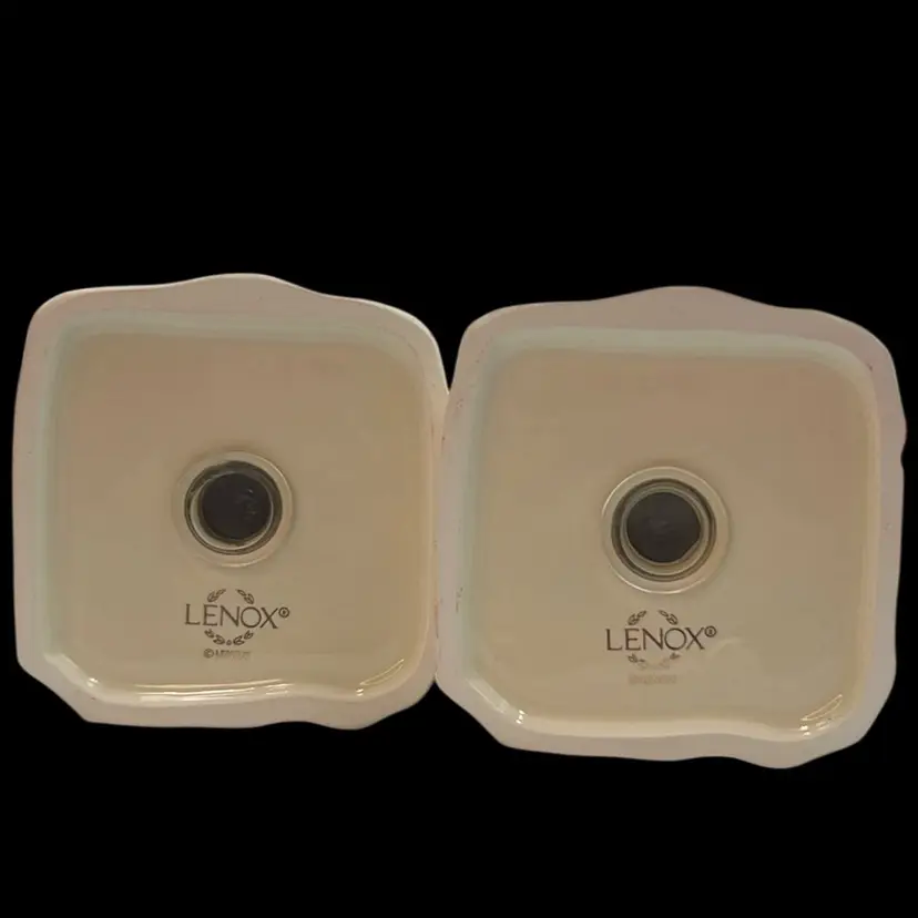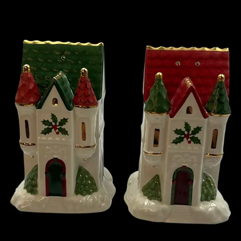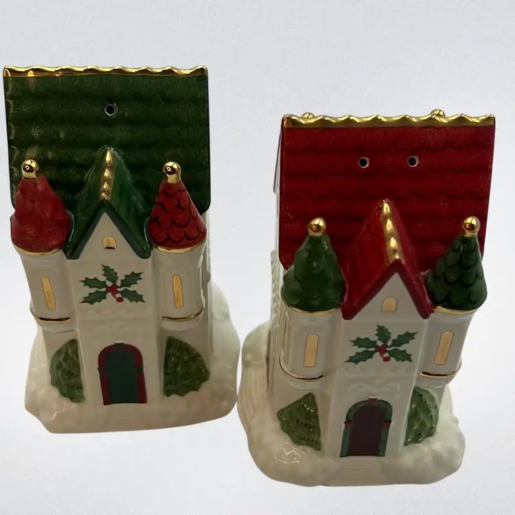 Red and green Christmas castle with holly & berries. Made by Lenox, this pair is new in (open) box. No sign of ever being used. Stoppers in place. 3.75” tall x 2.25” wide x 2.25” deep No damage