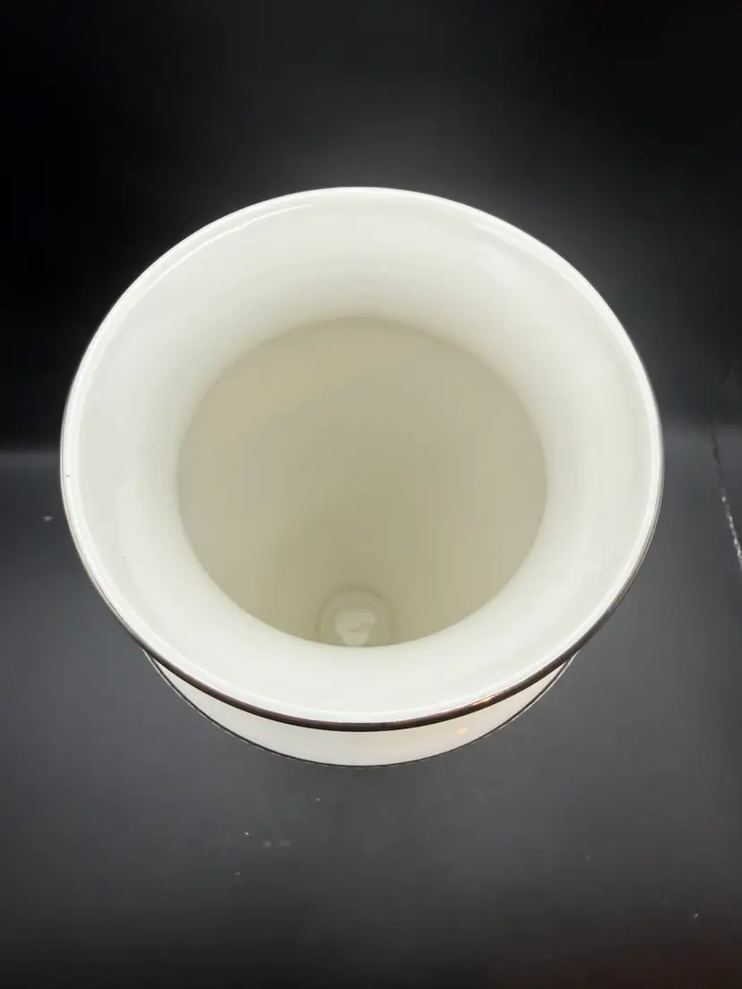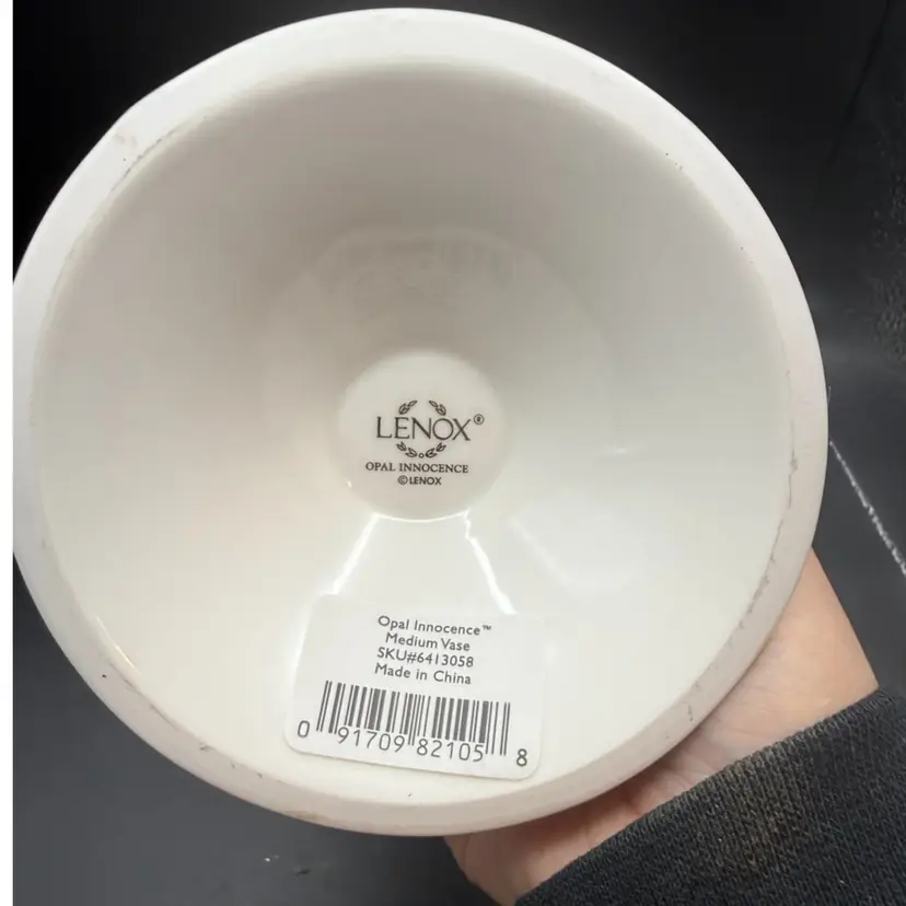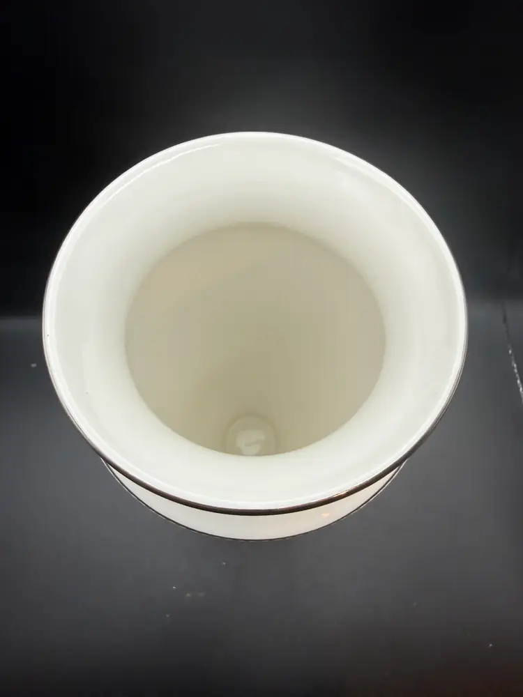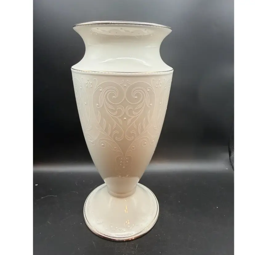 It features an elegant ivory/white color with a glossy finish and platinum (silver-tone) trim on the rim and base. The vase has a distinct embossed or carved vine and scroll pattern around the center. It is a discontinued item from the Lenox collection. The material is porcelain or fine china, not the crystal version of the same design.