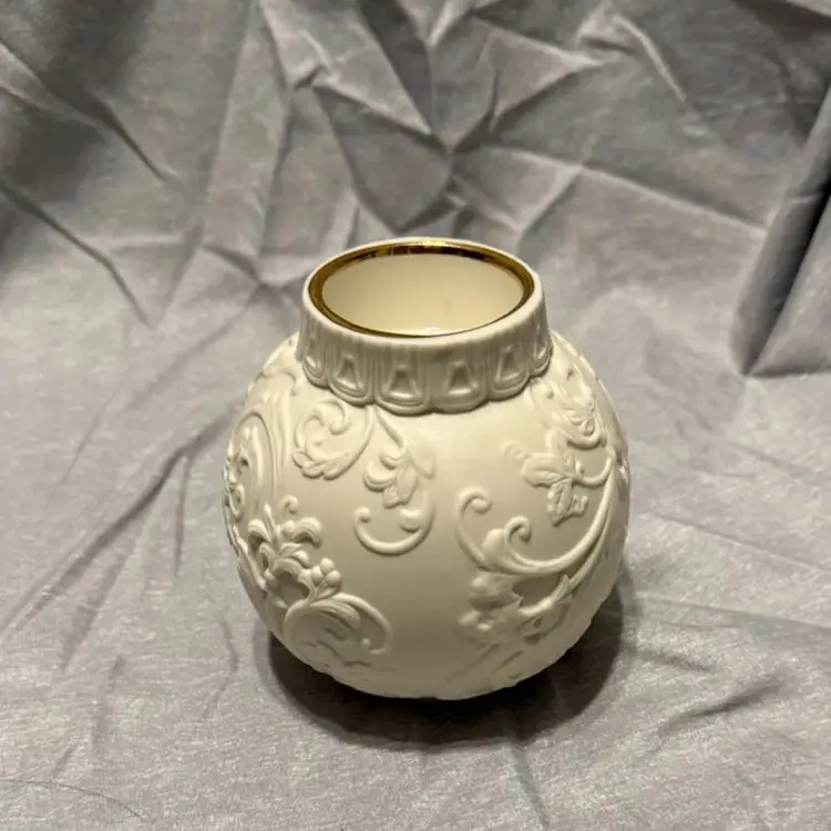 It is crafted from creamy white bisque porcelain with a 24K gold accented glazed crown at the top, resembling a Christmas ornament. The body features an embossed holly scrollwork pattern. Holds votive or tea light. Discontinued.