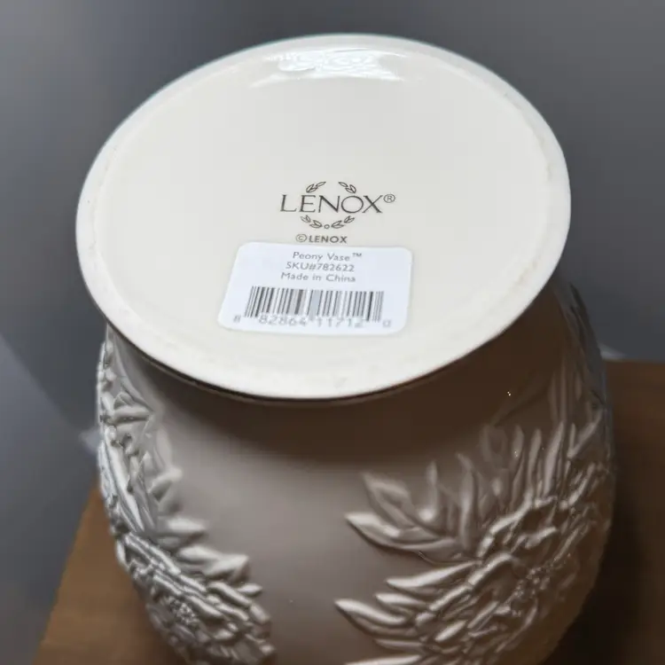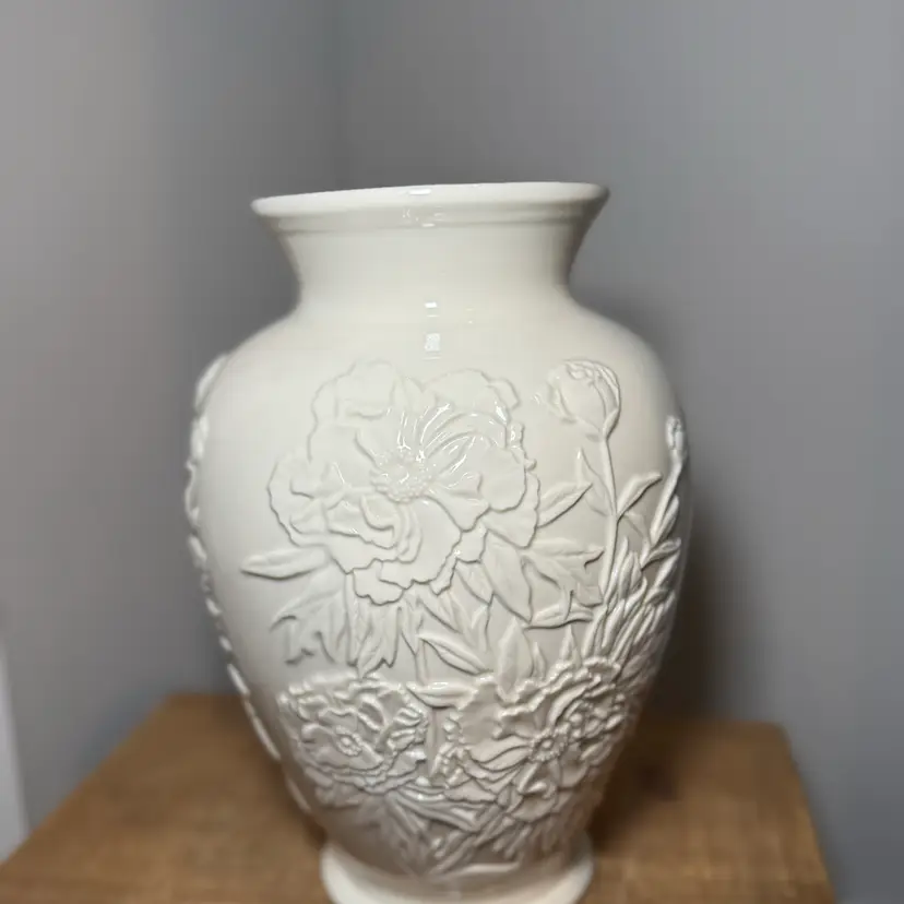 Lenox Peony Vase, a part of the brand's floral collections often featuring raised relief designs. Porcelain ivory vase with an embossed peony floral motif