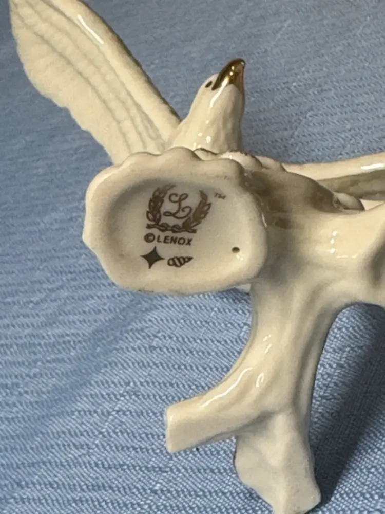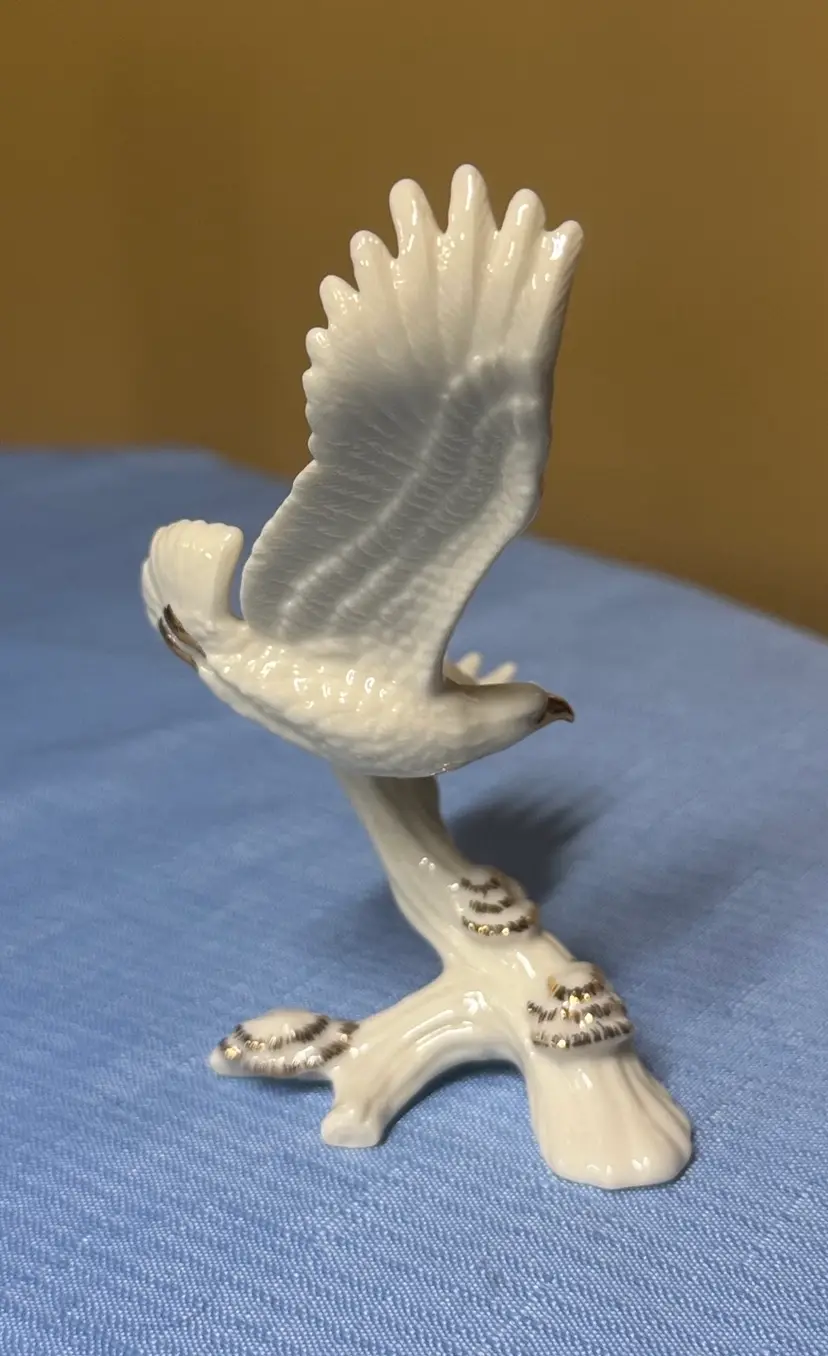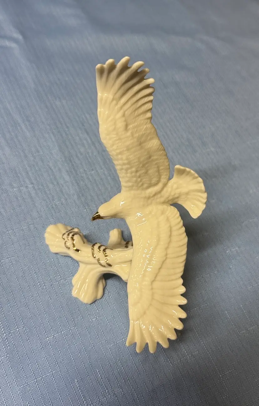 Lenox porcelain eagle in flight pose. Glossy white finish with fine feather detailing. Gold-accented beak for subtle contrast. Ideal for display on shelves or desks. Classic collectible accent. The Lenox "Precious Freedom" Eagle figurine is a collectible porcelain piece from the 1980s or later, featuring ivory china with 24-karat gold accents on the beak and branch. This item is no longer in production, making it a vintage decorative item for collectors 5.25” tall Excellent condition with no breaks or chips (31431326a)