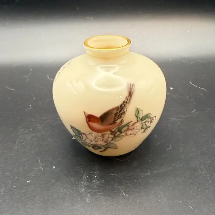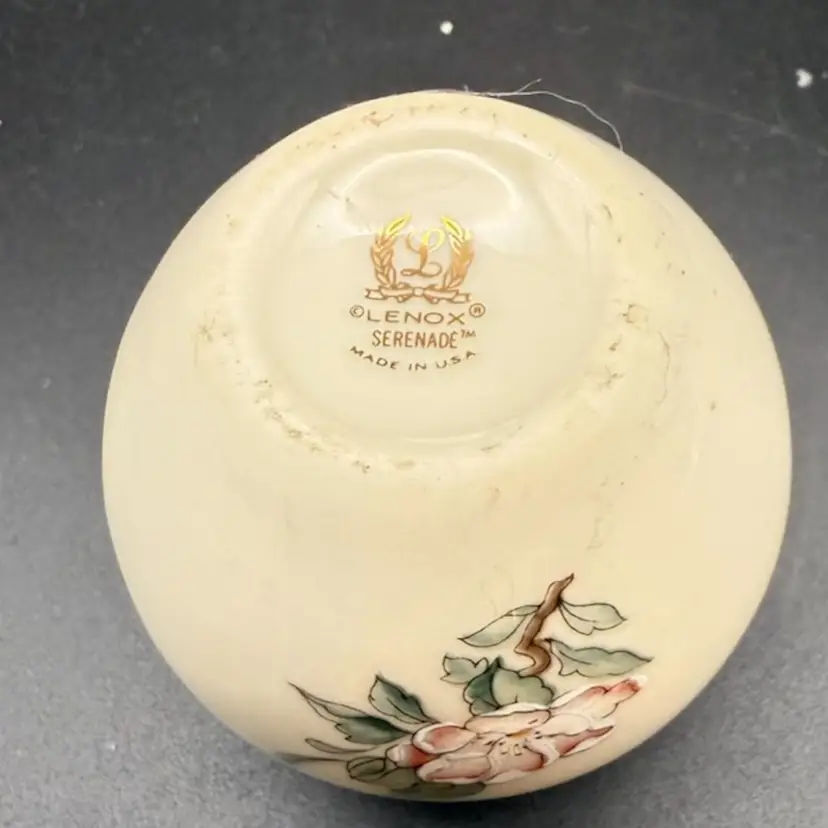 The vase features a red finch on a floral branch, possibly dogwood, with the flowers having a slightly raised, embossed appearance. It is made of fine bone china with 24K gold accents on the rim. Its size is 5" x 5.25", with a 2.5" opening at the top. The Lenox Serenade pattern is retired