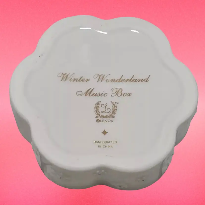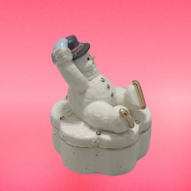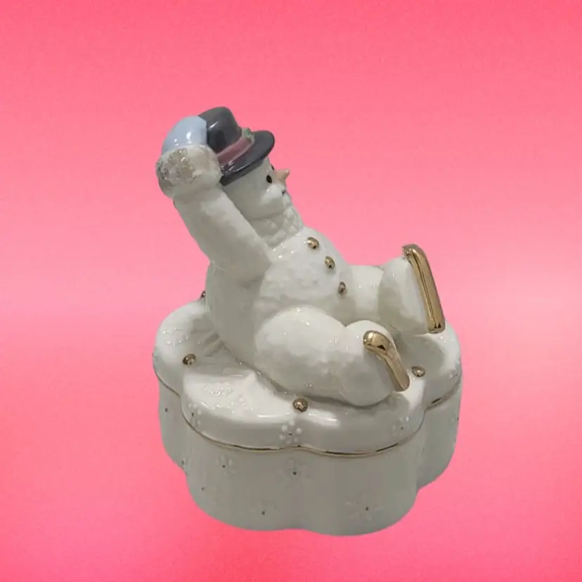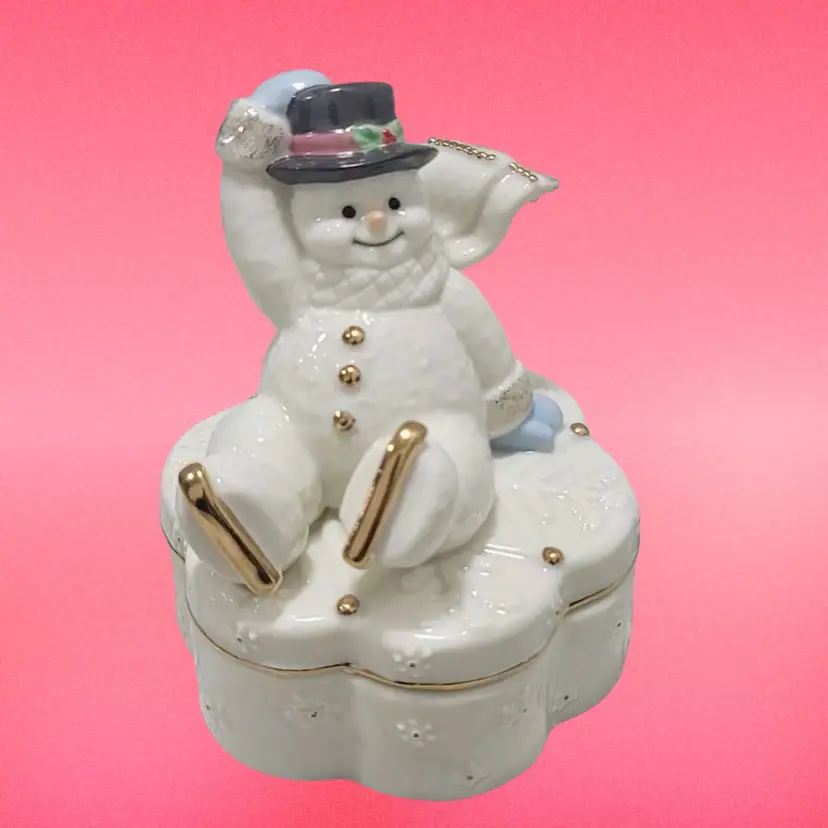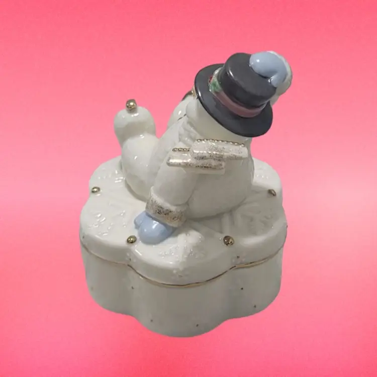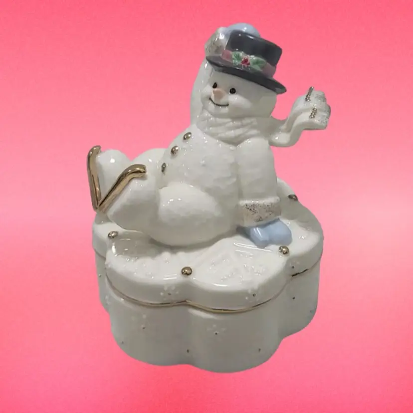 This adorable Snowman trinket box by Lenox is in excellent condition with no chips or cracks. Music box plays perfectly. It plays “Winter Wonderland”. He is 5” high and 3.5” Wide.