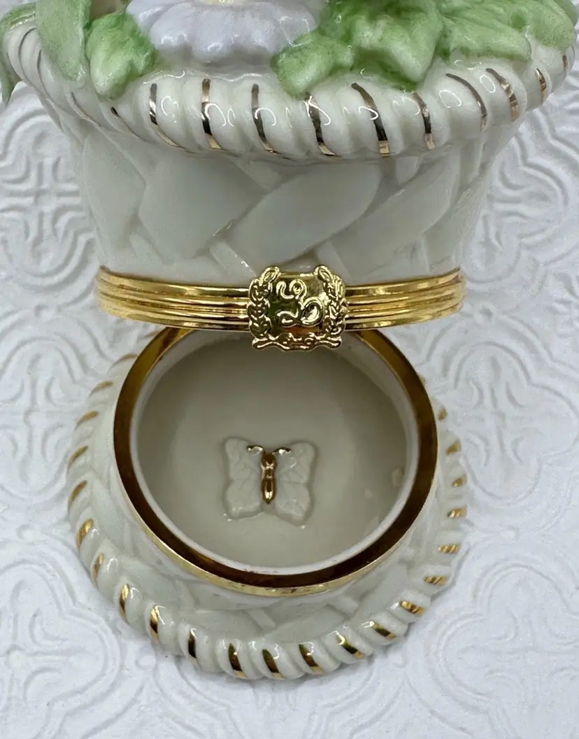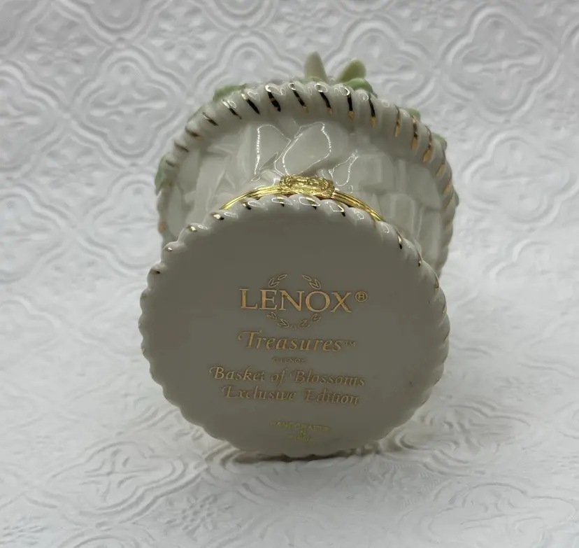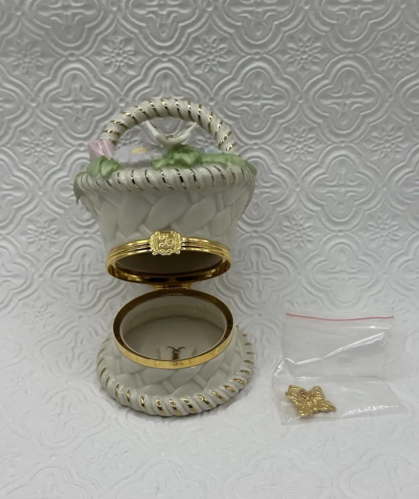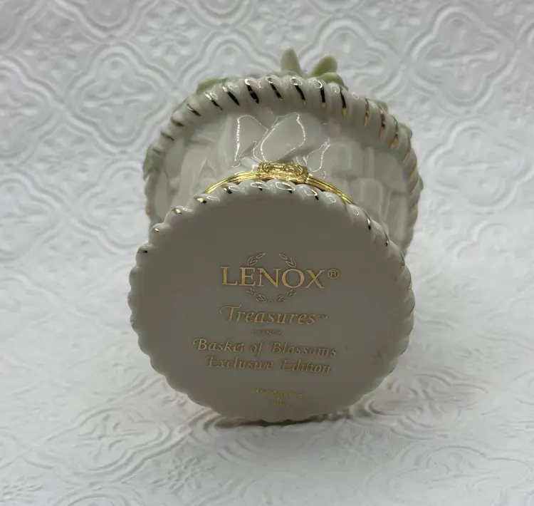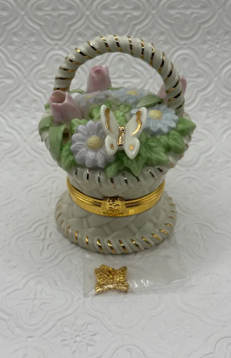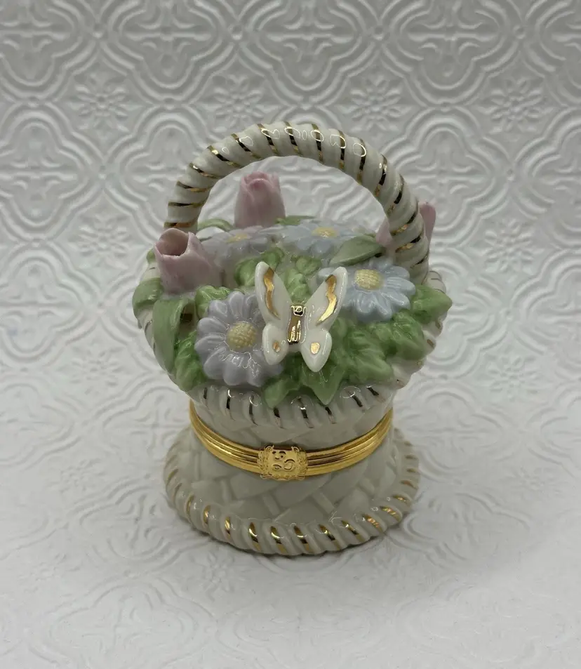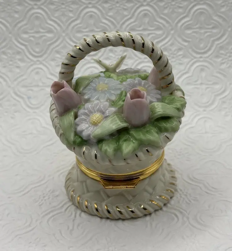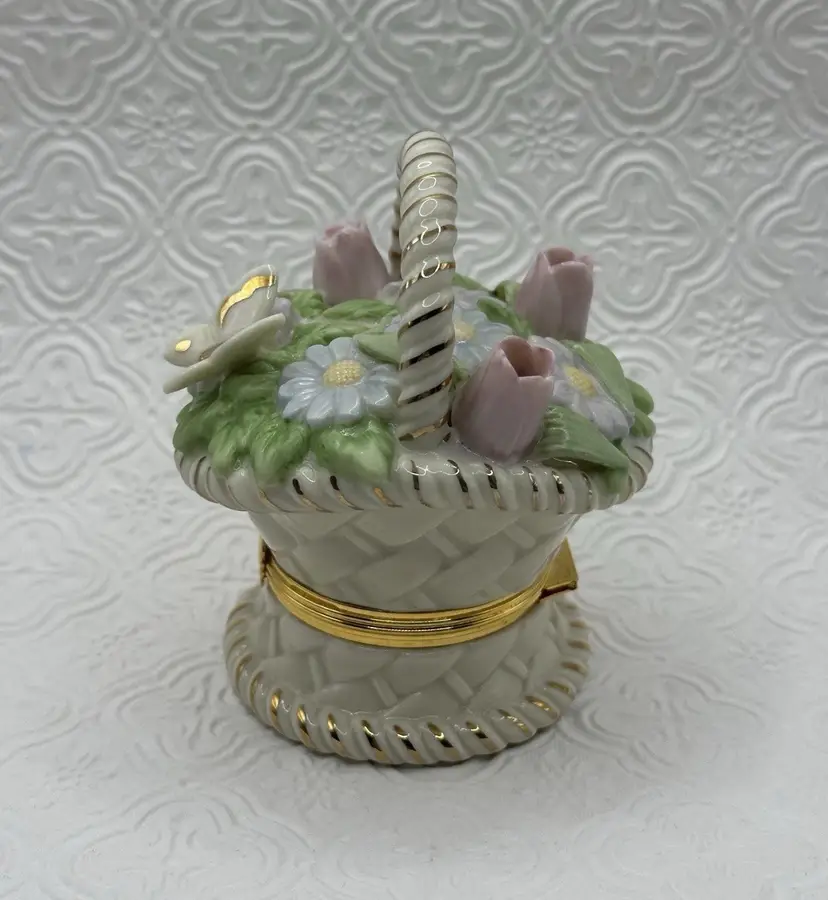 The Lenox Trinket Box in the "Basket of Blossoms" design is a charming and elegant piece for any cabinet. Made of porcelain with a multicolor glazed finish, this small trinket box features a basket shape adorned with a beautiful flower pattern. Its snap closure ensures secure storage for small items while adding a touch of Spring style to any room. Ideal for all occasions, this original Lenox collectible measures 3.5 inches in height and 2 inches in width, making it a perfect addition to any décor. No chip or cracks and includes Trinket.