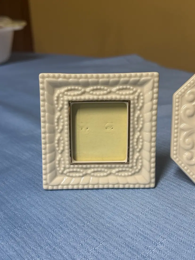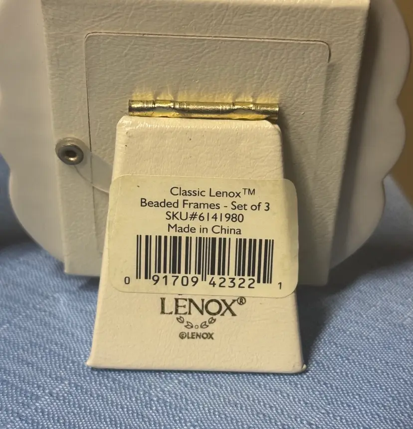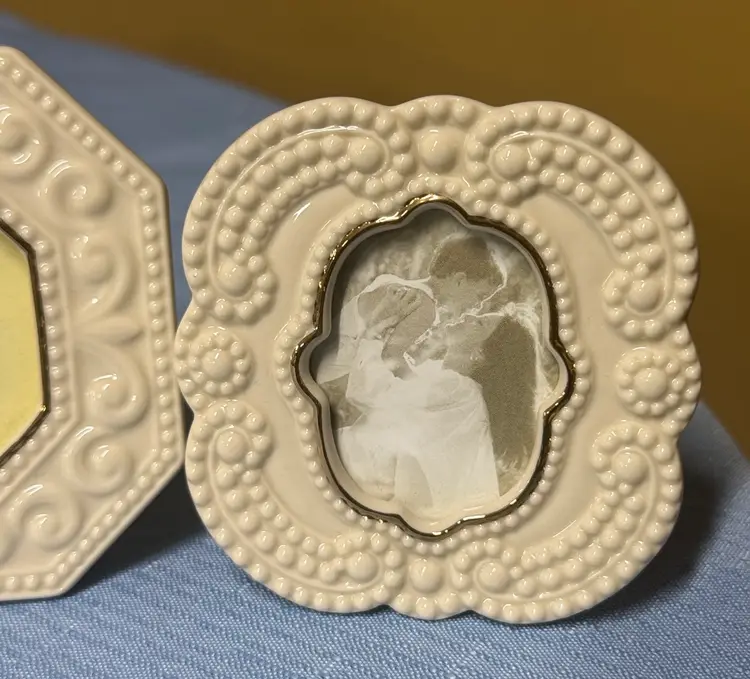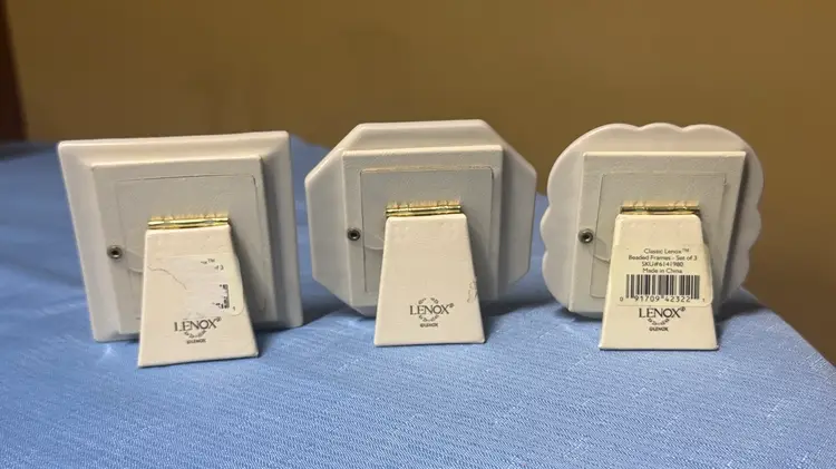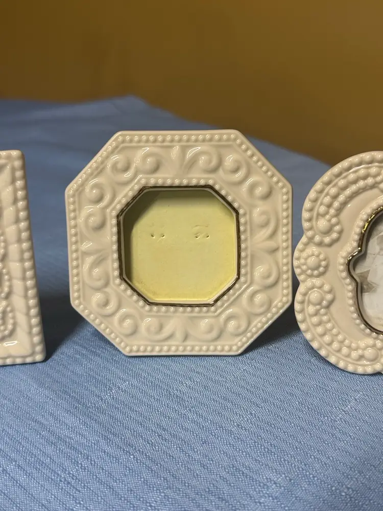 Add charm to your decor with this Lenox ivory frame set. Perfect for displaying treasured photos. Design: Each of the three frames in the set has a unique shape: square, octagonal, and scalloped/floral. They feature raised pattern designs, specifically a beaded or "French Perle" style texture. Material: The frames are made from fine ivory porcelain and include 24K gold accents around the photo openings. Size: These are miniature frames, with the easel-backed frames measuring approximately 3.25" to 3.5" in size. They are designed to hold small photos, typically around 2" to 1.75" in dimension. All are in excellent condition with no breaks or chips (207223266)